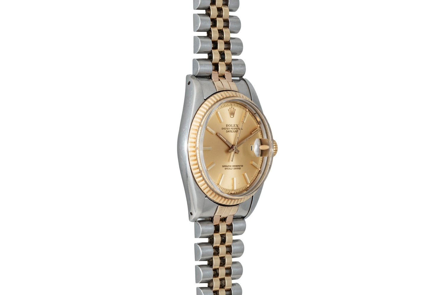 This particular example, a Reference 1601, dates to circa 1977 and features a fantastic sunburst champagne Tritium dial with applied wide boy indices, a matching handset, a fluted yellow gold bezel, and a matching two-tone Jubilee bracelet with a signed blade clasp.