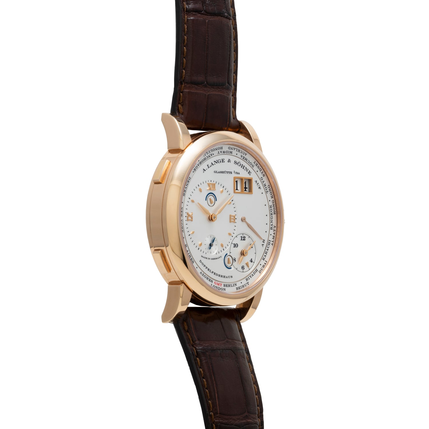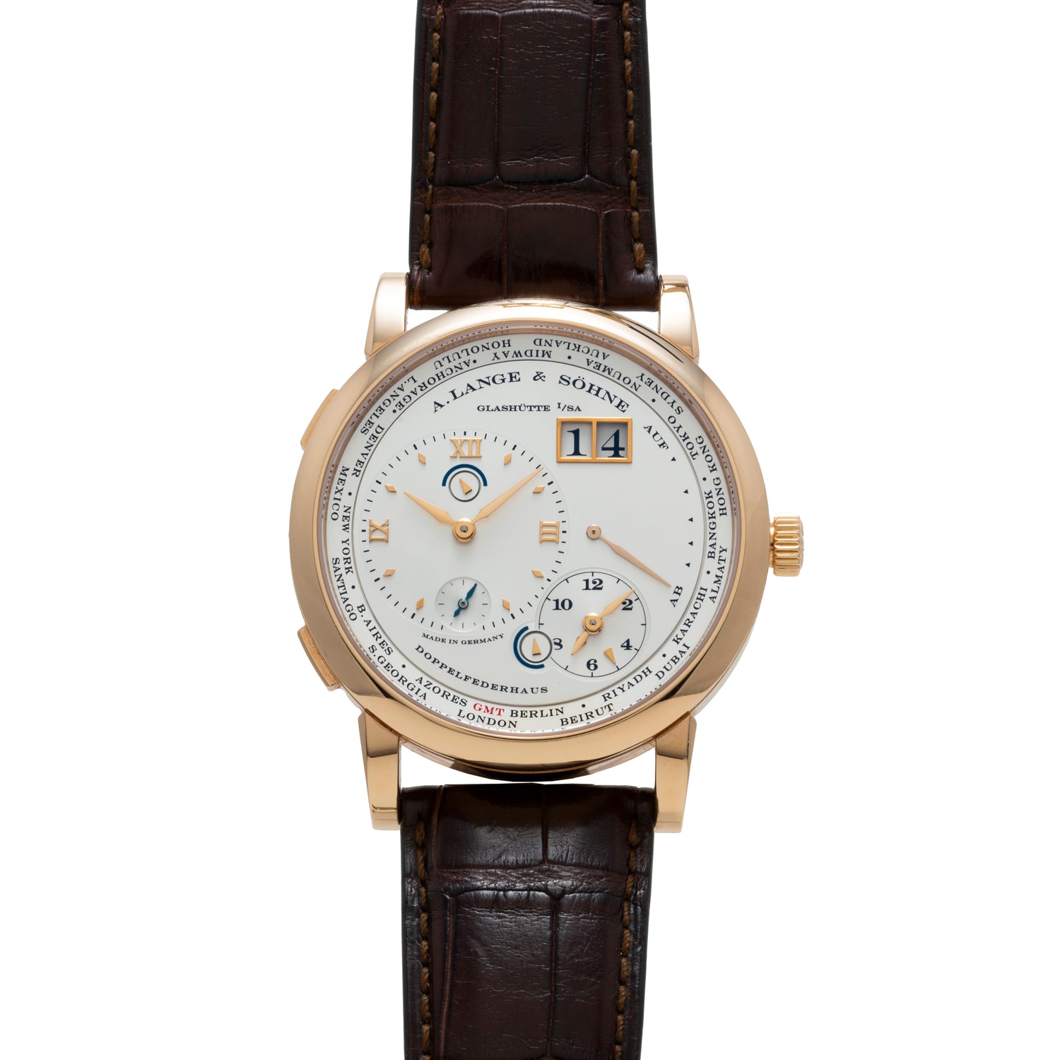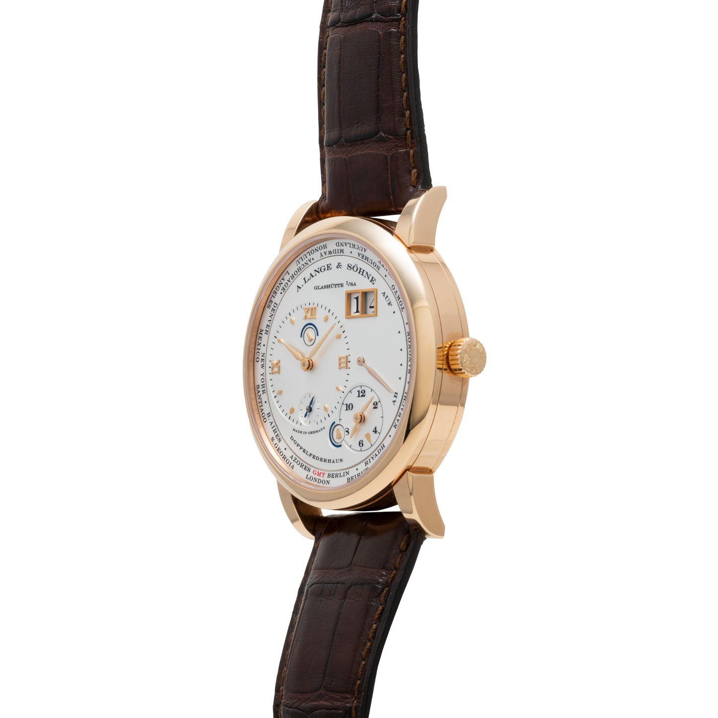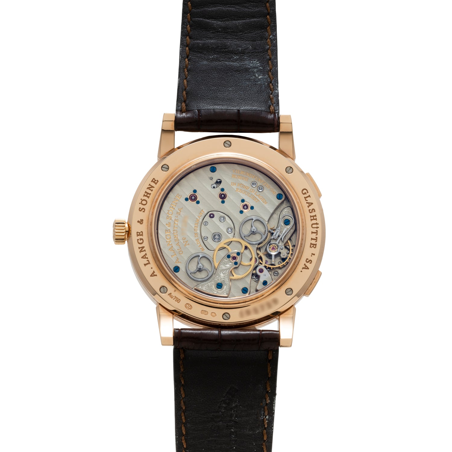 With its 42mm 18K rose gold case, this particular example features a lovely satin silver dial with applied gold indices and a matching rose gold 'alpha' handset, a signed brown alligator leather strap with a signed 18K rose gold pin buckle, and perhaps the best part of any Lange - a sapphire caseback for clear viewing of the horological delight that is a Lange movement.