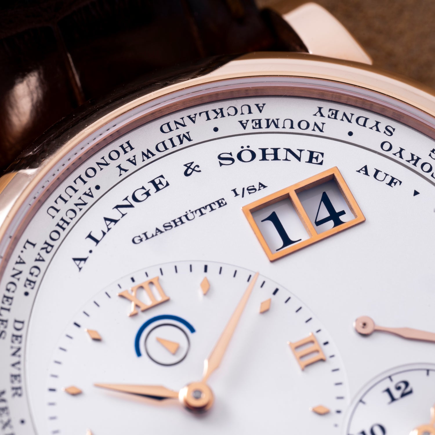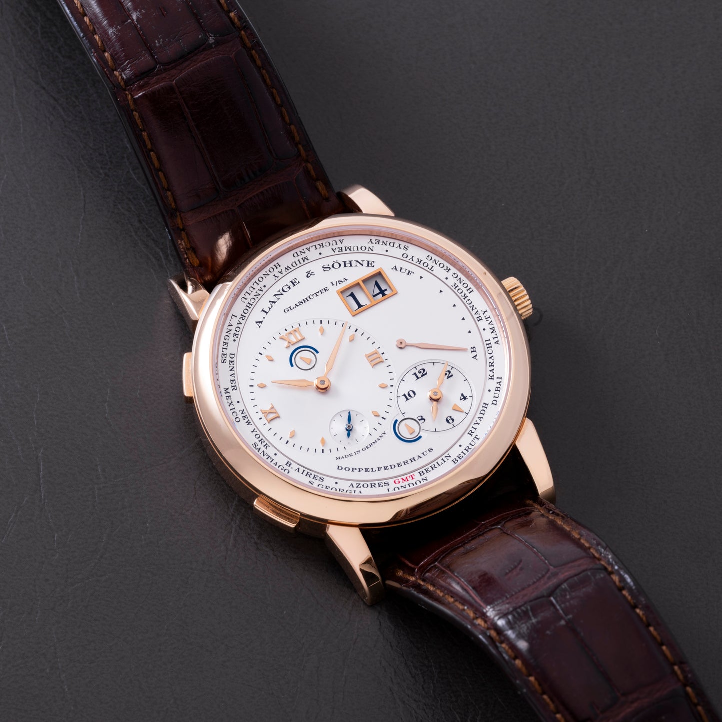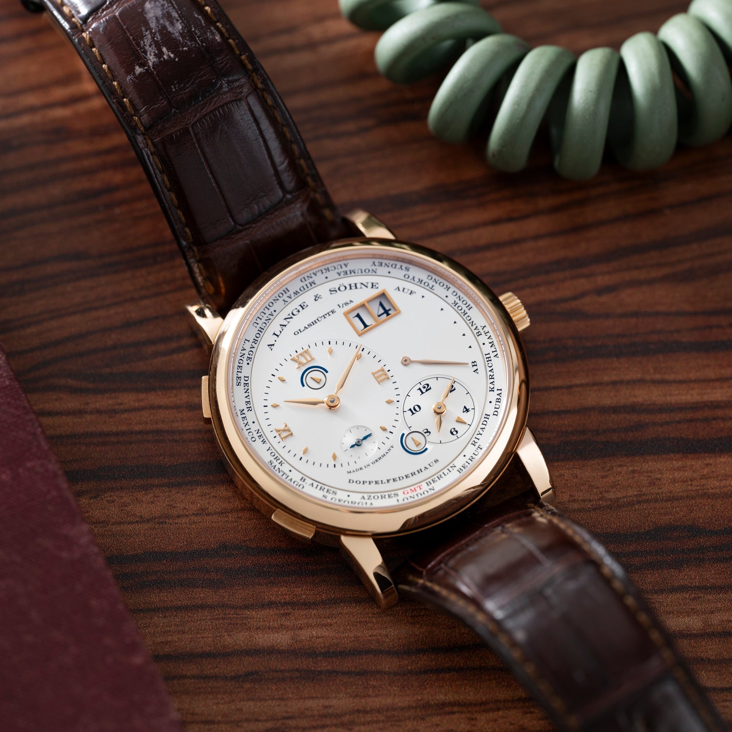 The Lange 1 has seen many variations, from a tourbillon to the Timezone, seen here. Introduced in 2005, it maintains the classic lines of the Lange 1 by incorporating the world time and AM/PM indicator into the sub-seconds dial at 5 o’clock, plus a revolving outer GMT band with the names of 24 cities. Powered by the manually wound Calibre L031.1, it also includes hacking seconds, a power reserve indicator, an offset main dial with subsidiary seconds and AM/PM indicator — all the hallmarks of the classic Lange 1. Two pushers — one for the date at 10 o’clock and one for the world time function at 8 o’clock — are subtly integrated into the watch’s left side.