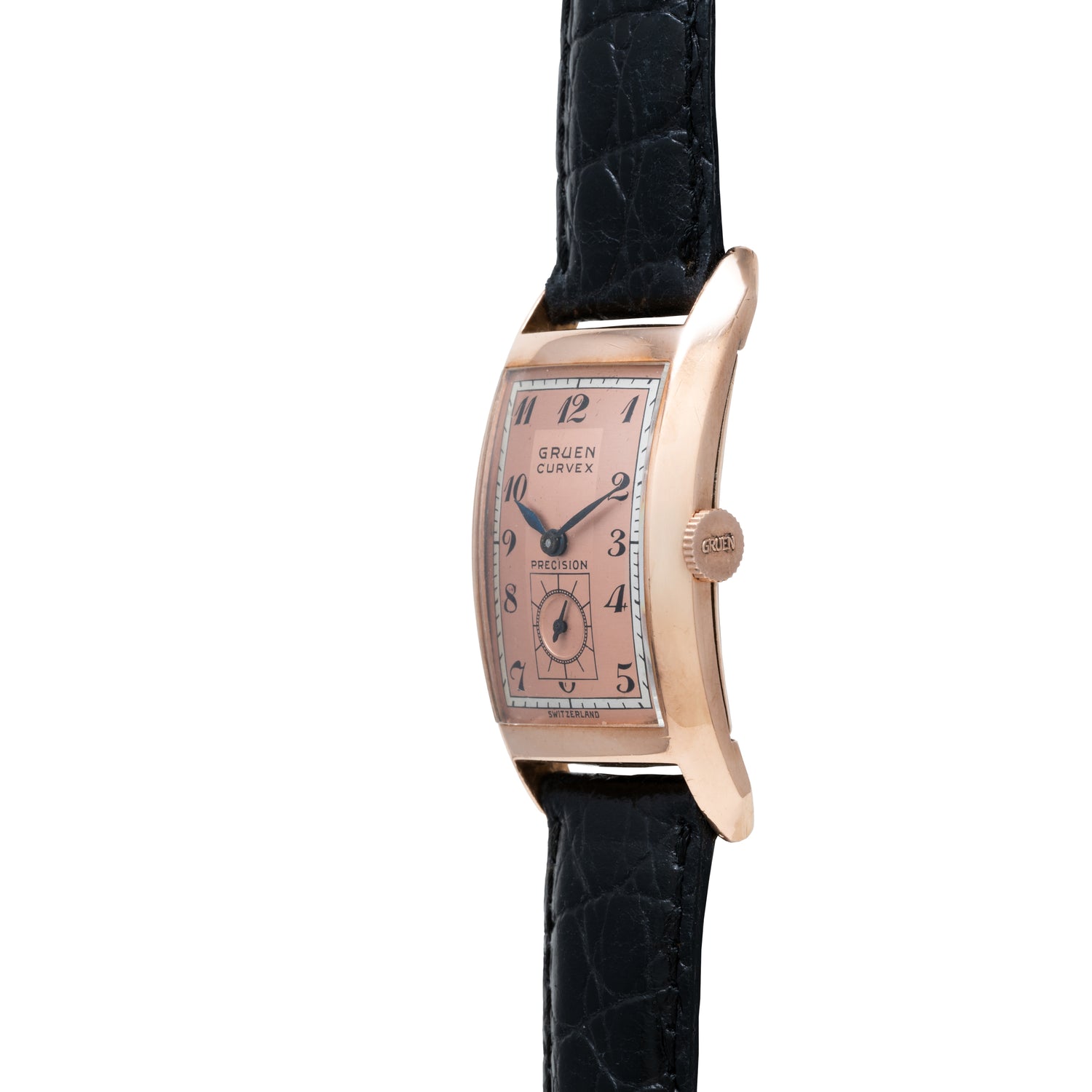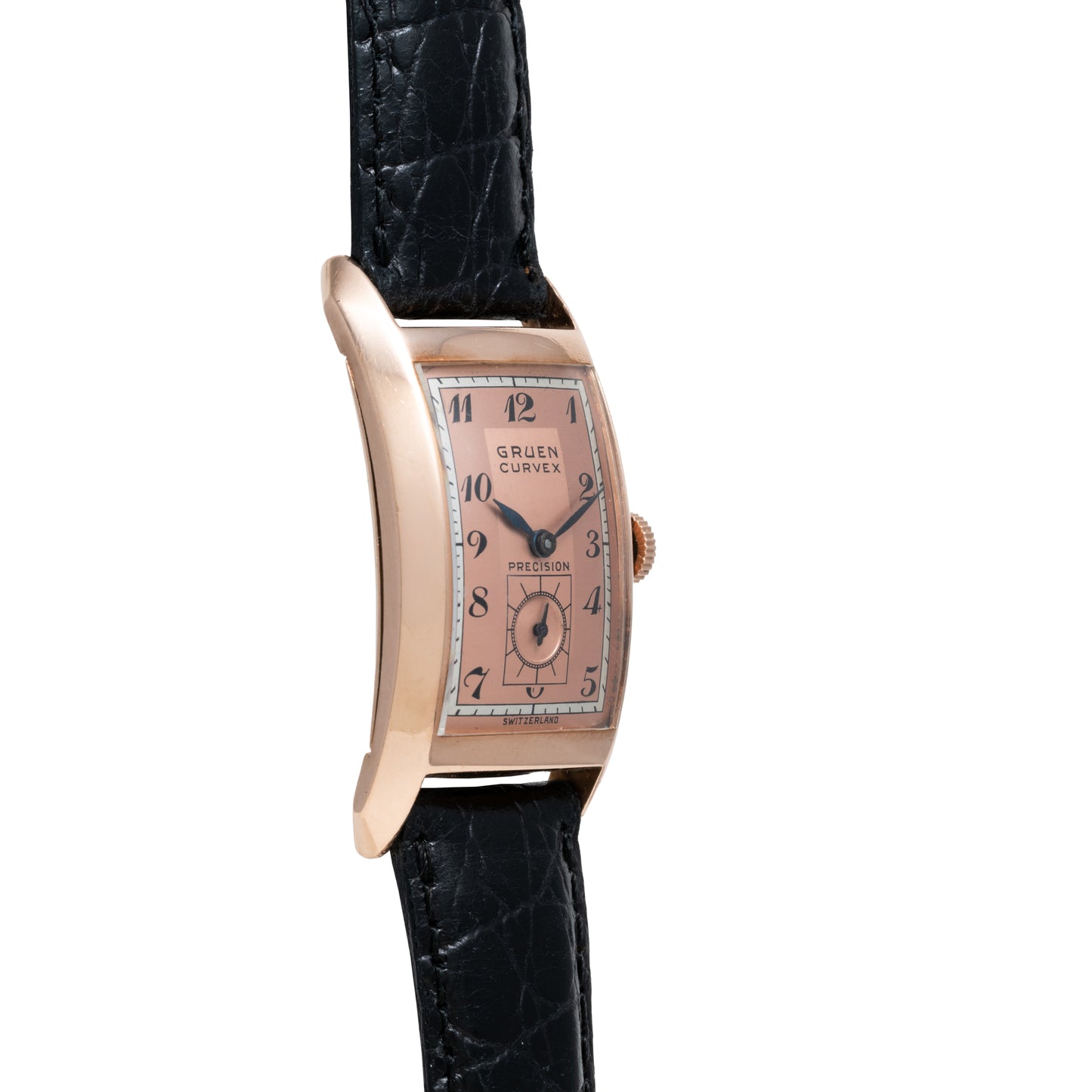 The Curvex that we offer here is 40mm lug to lug and features the Calibre 440---the third generation of the movement and dates to 1941. Featuring a 14K pink gold filled case, this watch has developed a beautiful tone. The dial, a rosy tone, has patinaed evenly and beautifully. The dial is complete with ornate printed numerals and signed "Gruen Curvex Precision"