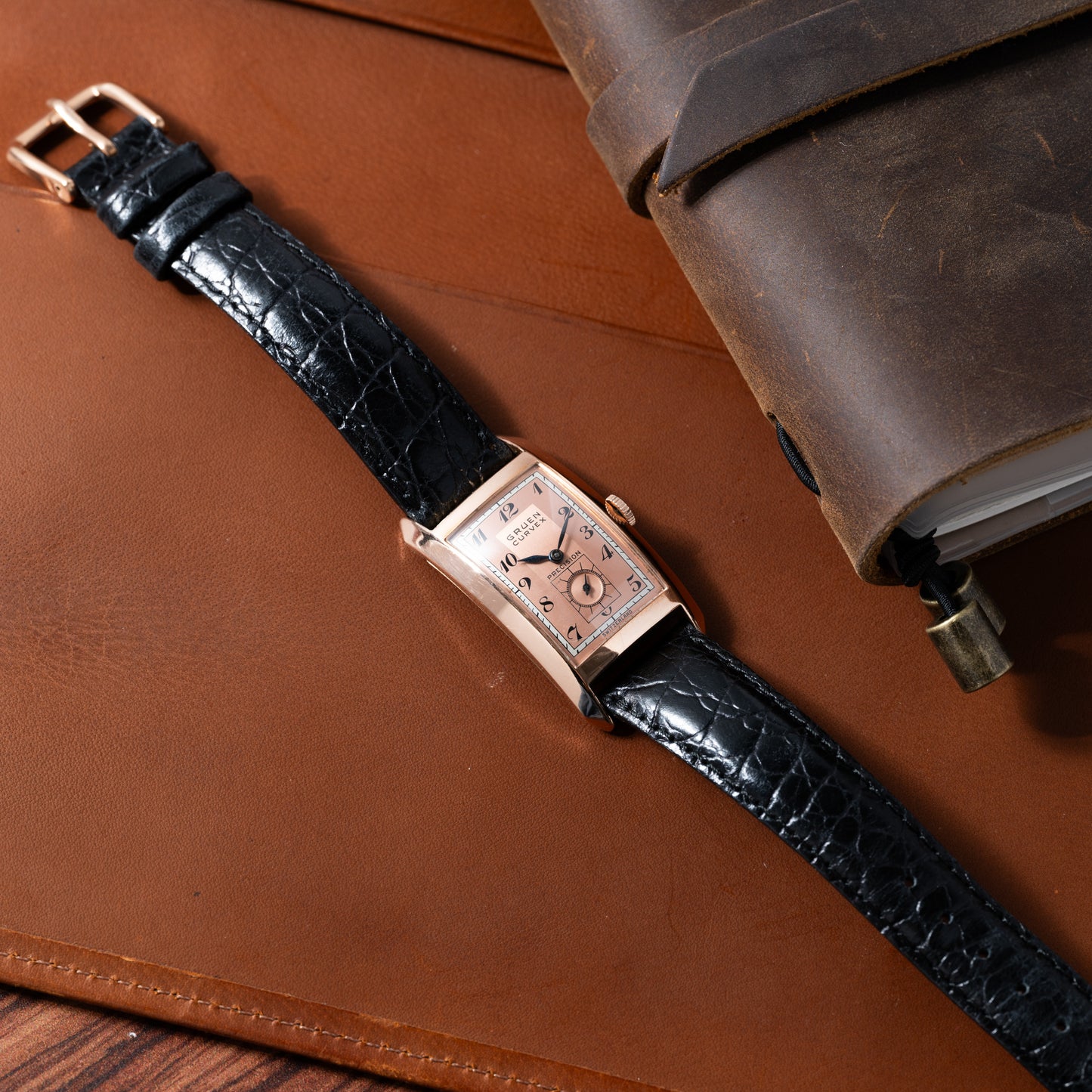 Thanks to strategic partnerships with Swiss companies like Rolex and movement manufacturer Aegler, Gruen had enjoyed success with its doctor’s watch, the Techni-Quadron (which Rolex marketed as the Prince in Europe and the British Empire). But the brand also earned a reputation for innovation in aesthetics. Throughout the 1920s, Gruen experimented with different movement and watch designs, including the Quadron, which housed a tonneau-shaped movement in a rectangular case.
