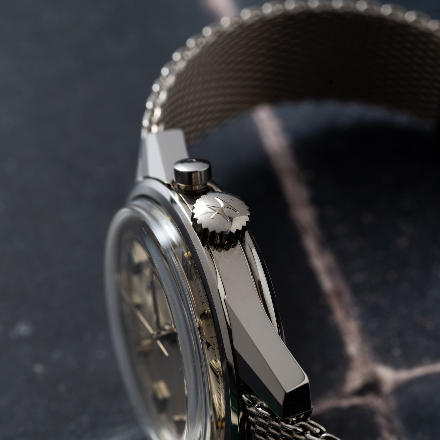 Here, we have Hamilton’s take on the concept: the Ref. 642, powered by the legendary Vulcain Cricket movement. Collectors know that the Cricket is the alarm caliber—famously worn by U.S. presidents and beloved for its bright, crisp “chirp.” Hamilton’s collaboration preserves the spirit while introducing its own mid-century American cool to the design language.