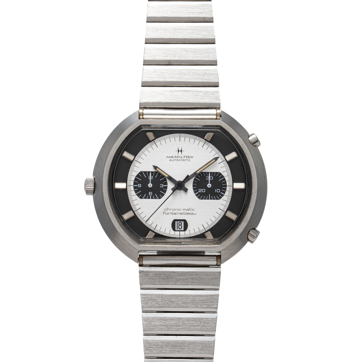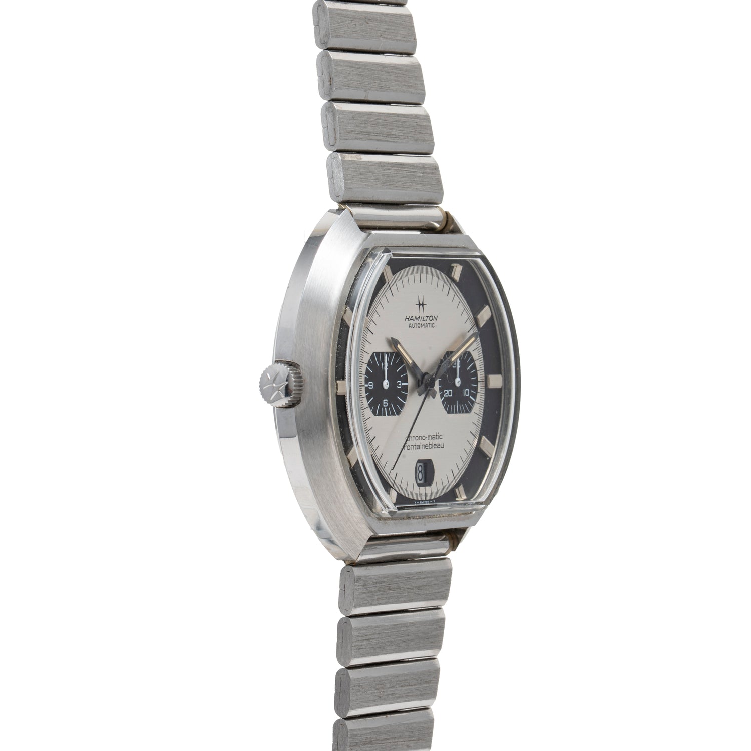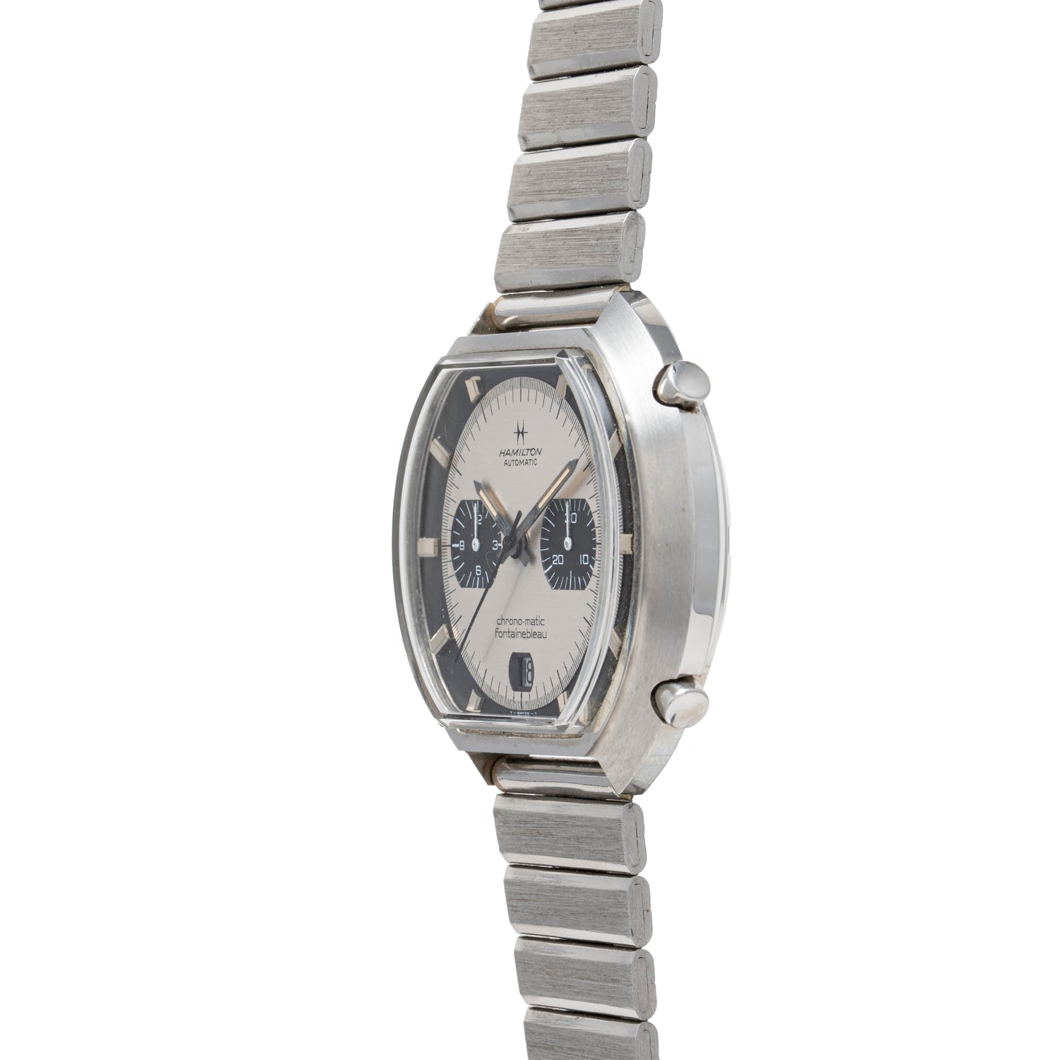 The "Chrono-Matic" (or Caliber 11) debuted in March of 1969, ahead of the Movado/Zenith movement, El Primero. One of the models with which Hamilton inaugurated the movement with was the Fontainebleau. Named after the chateau in France, the Fontainebleau utilized a distinctive waterproof case whose shape is reminiscent of the Heuer Monaco, released the same year.