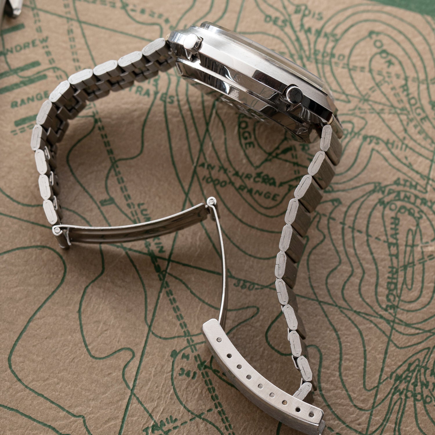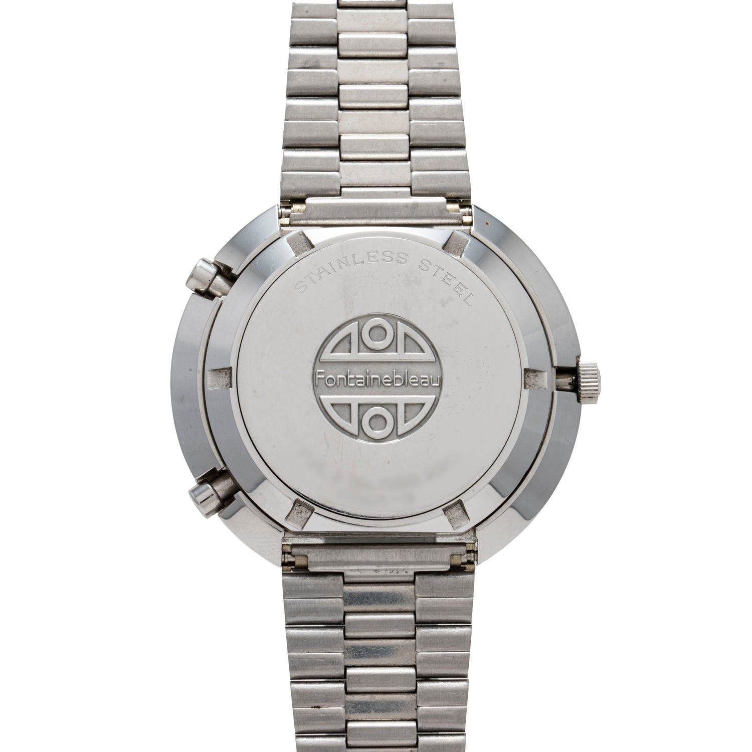 Complete with a super neat stainless steel flat-link bracelet, this incredible watch is a '70s time capsule. You'll be hard pressed to find such a clean and fully-functioning Fontainebleu again, so if you're a fan of the obscure and exceptionally cool, don't miss it!