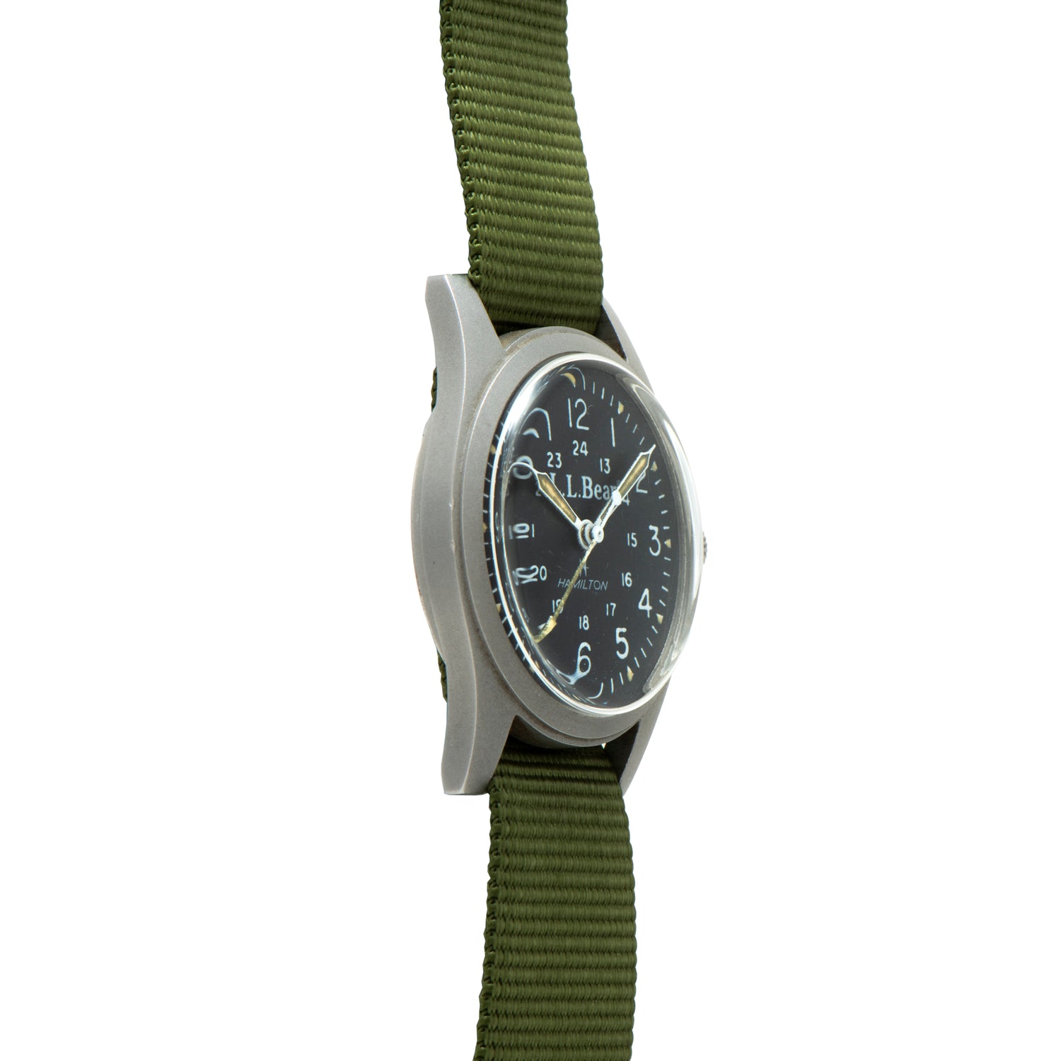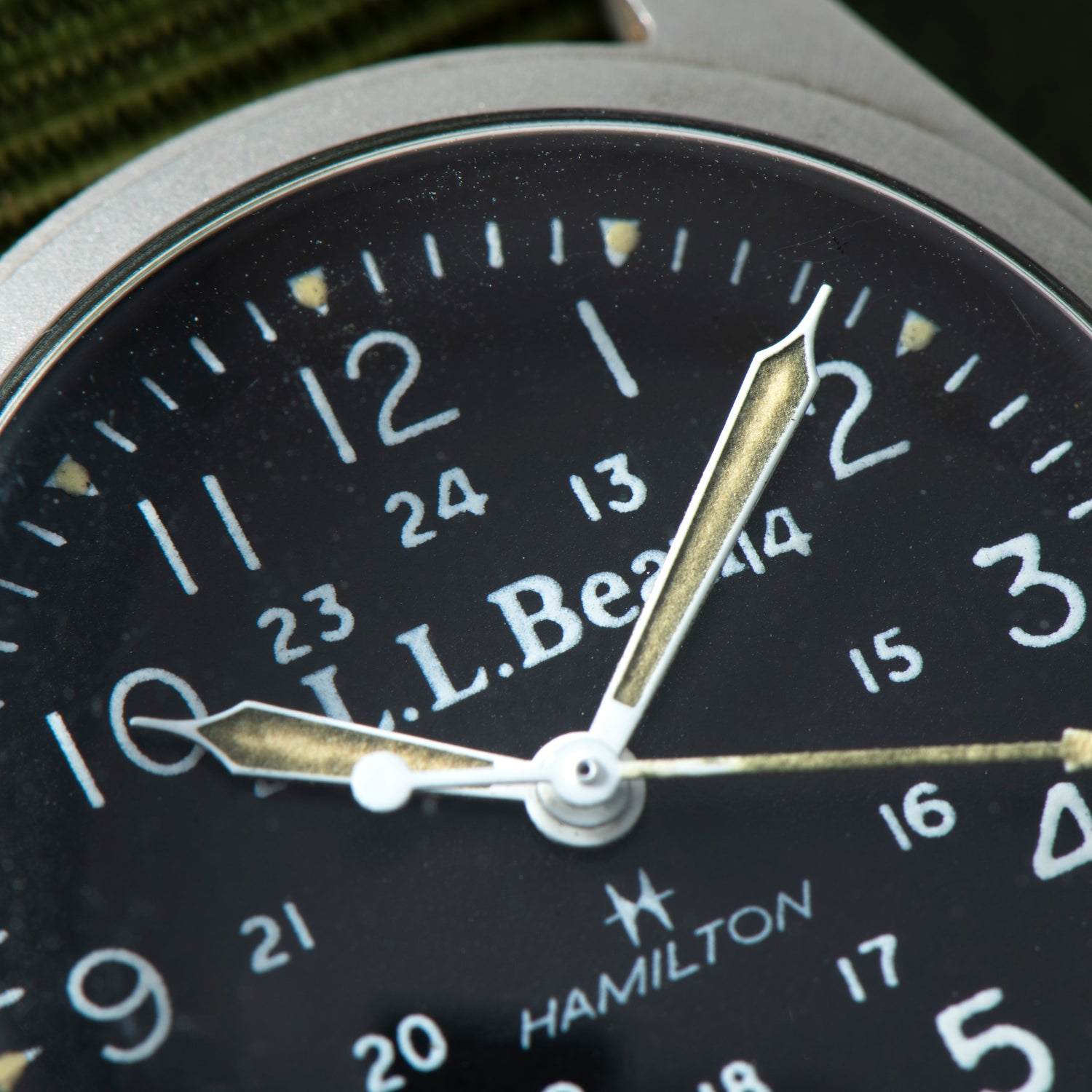 Housed in a 34mm parkerized steel case with an acrylic crystal and a signed crown, it features a matte black tritium dial with luminous 'dart' plots, painted white 'Arabic' indices, an inner 24-hour track in white, a luminous 'syringe' handset, and the Hamilton and L.L. Bean wordmarks.