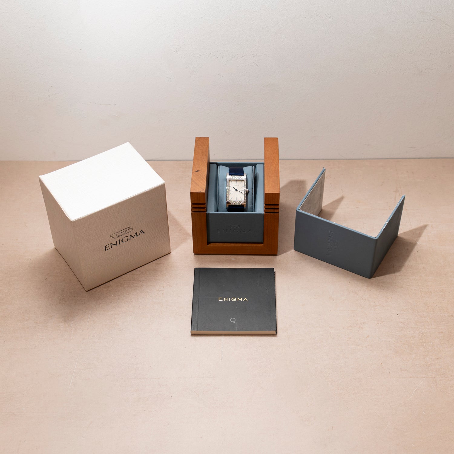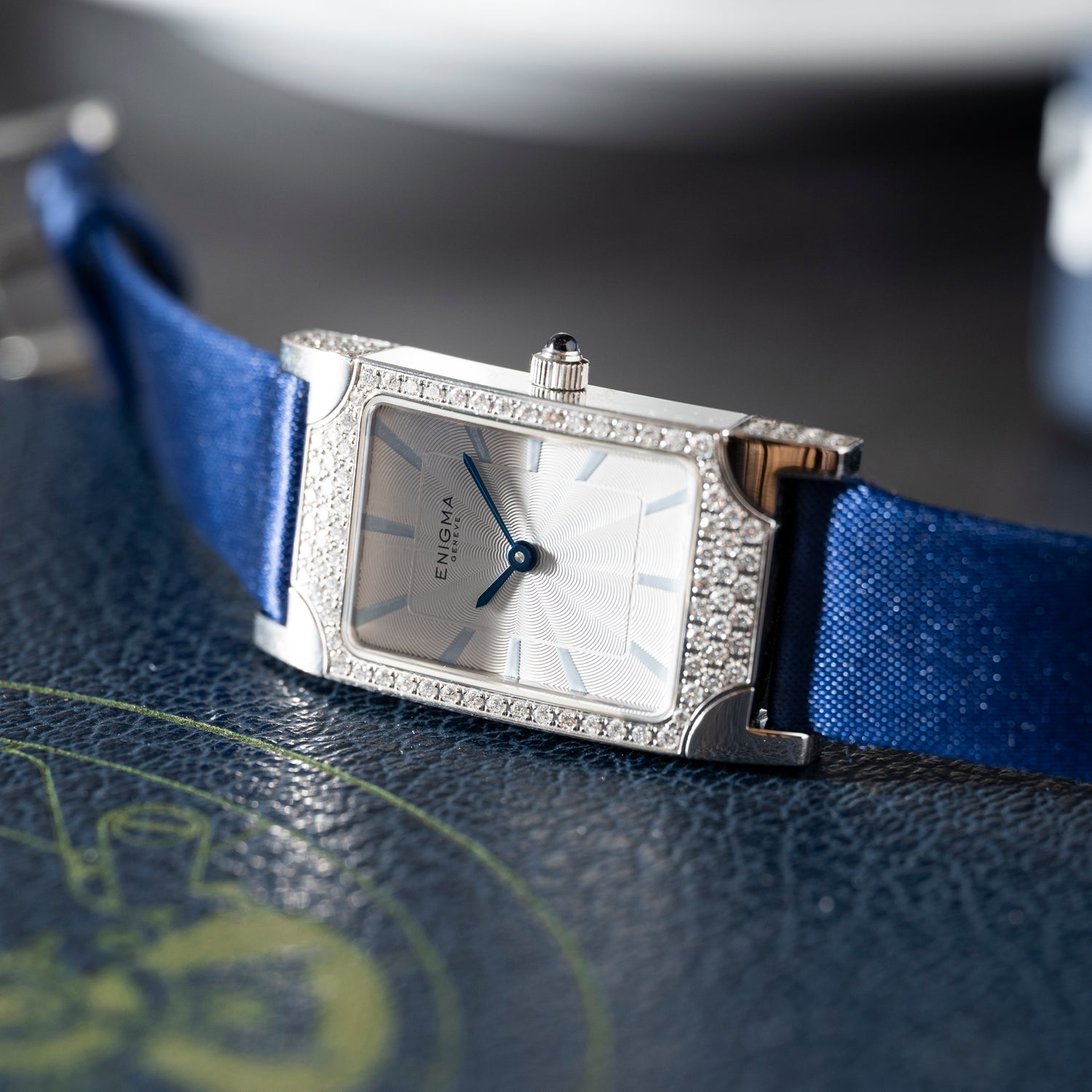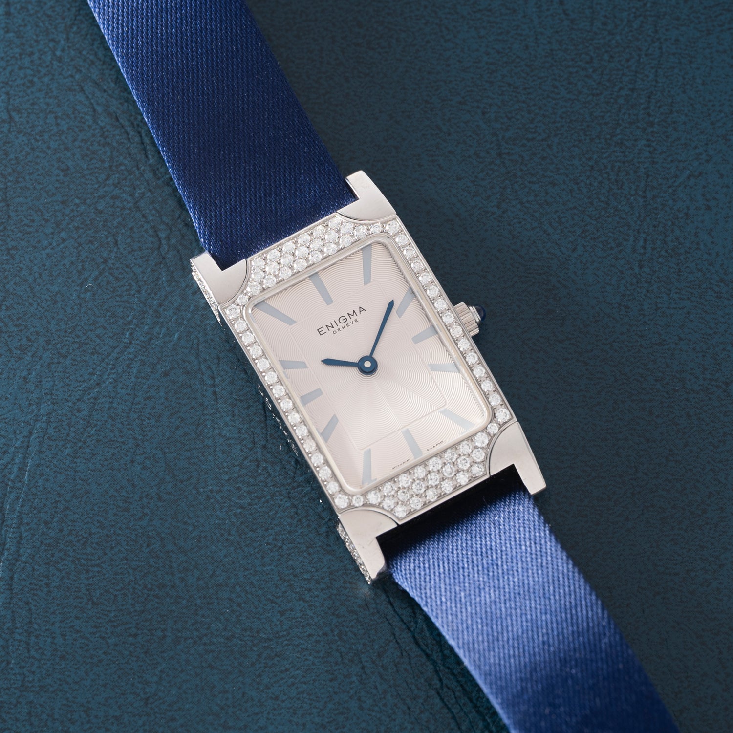 This particular Enigma, a Spyder II, is emblematic of the firm's bold design philosophy: Housed in a 20mm stainless steel case with a blue cabochon crown and a sapphire crystal, it features a diamond-set bezel for a spectacular look, plus a beautiful, silvered guilloché dial with trapezoidal indices and a blued steel handset.