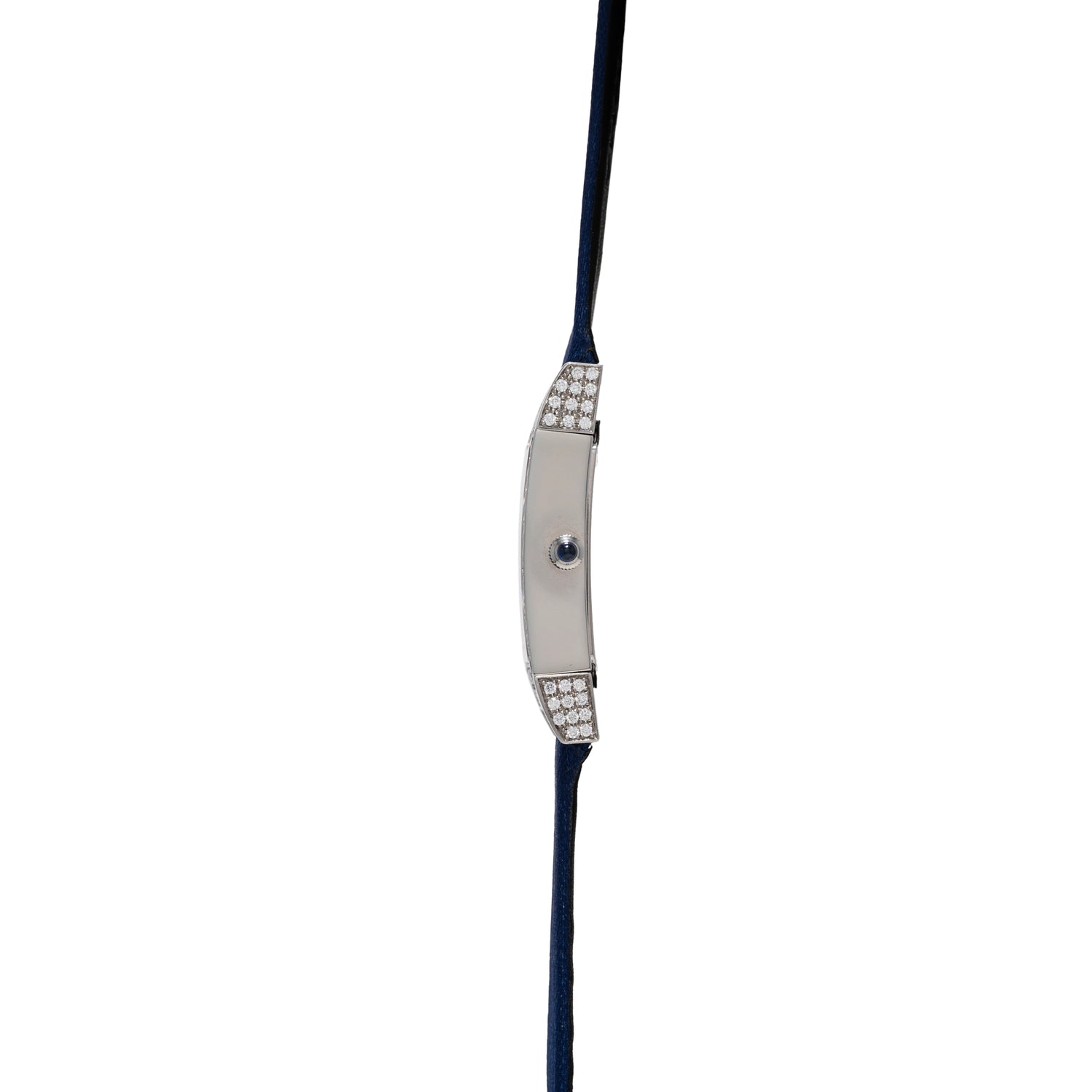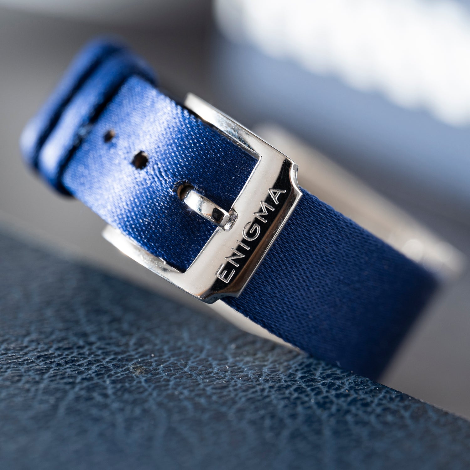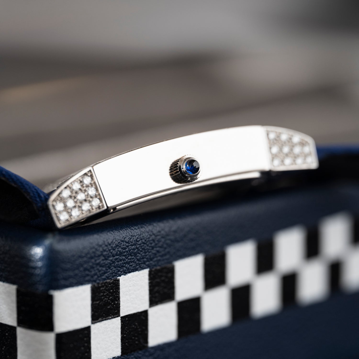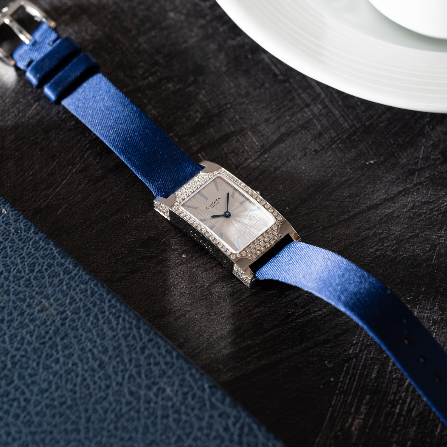 This particular Enigma, a Spyder II, is emblematic of the firm's bold design philosophy: Housed in a 20mm stainless steel case with a blue cabochon crown and a sapphire crystal, it features a diamond-set bezel for a spectacular look, plus a beautiful, silvered guilloché dial with trapezoidal indices and a blued steel handset.