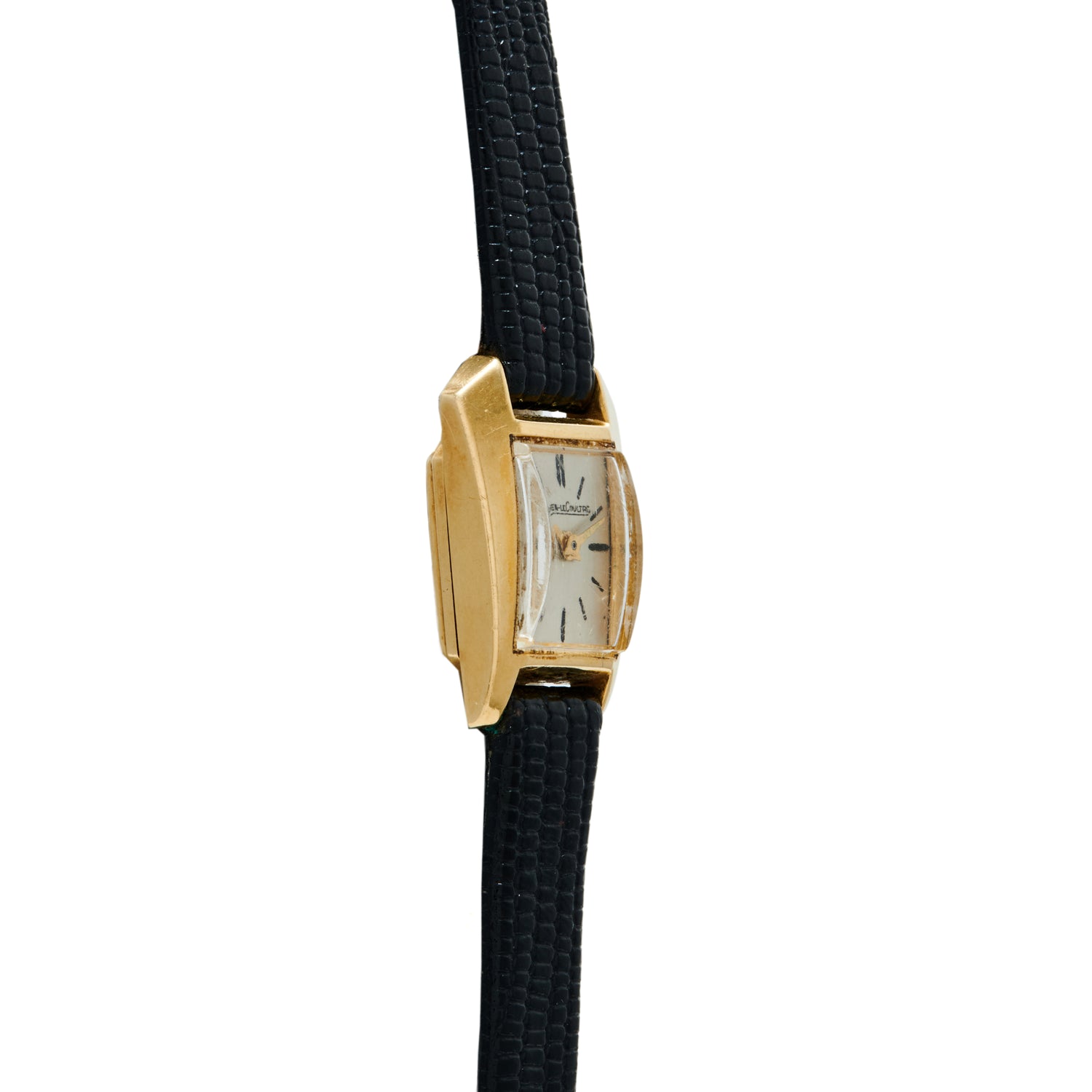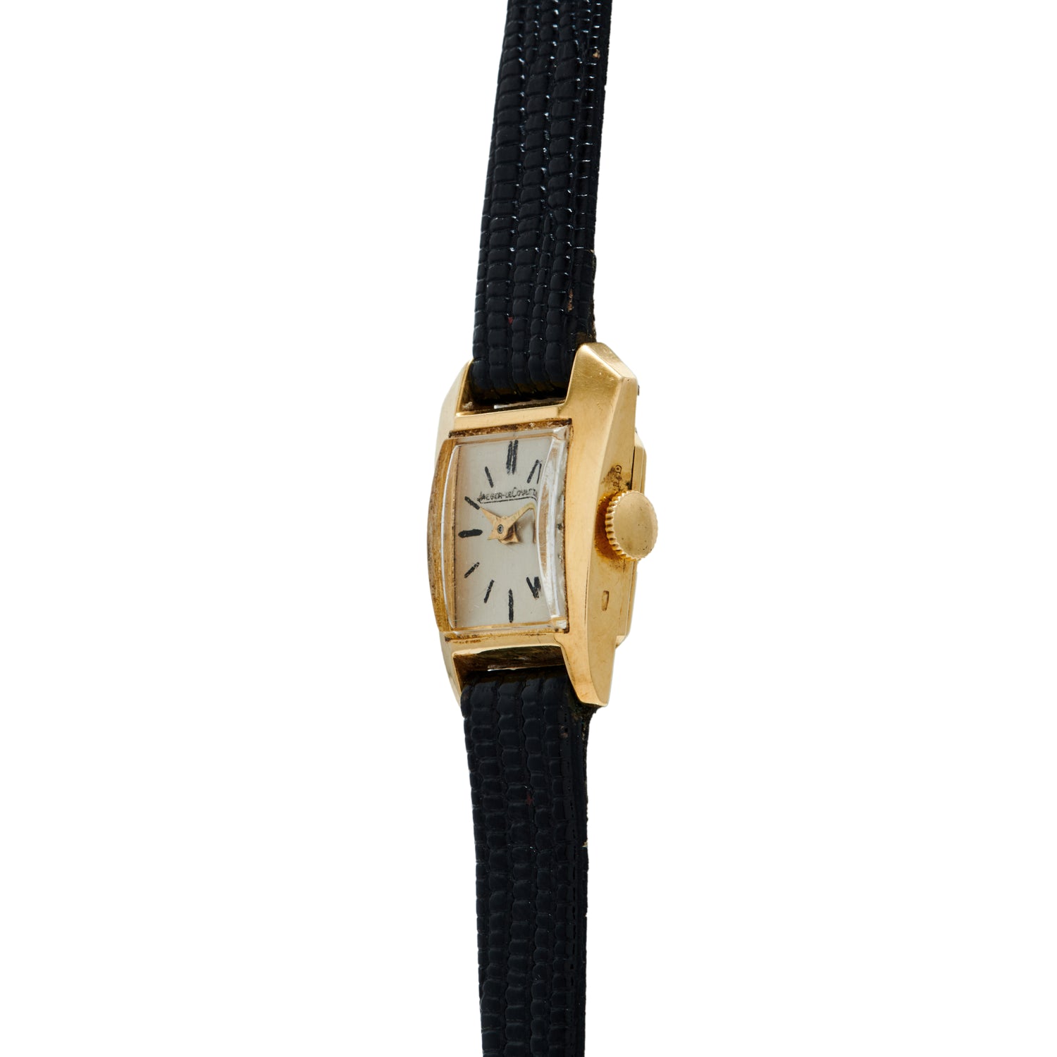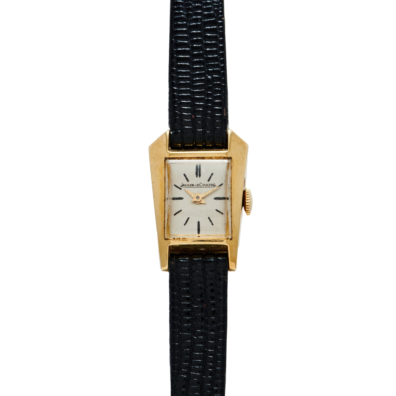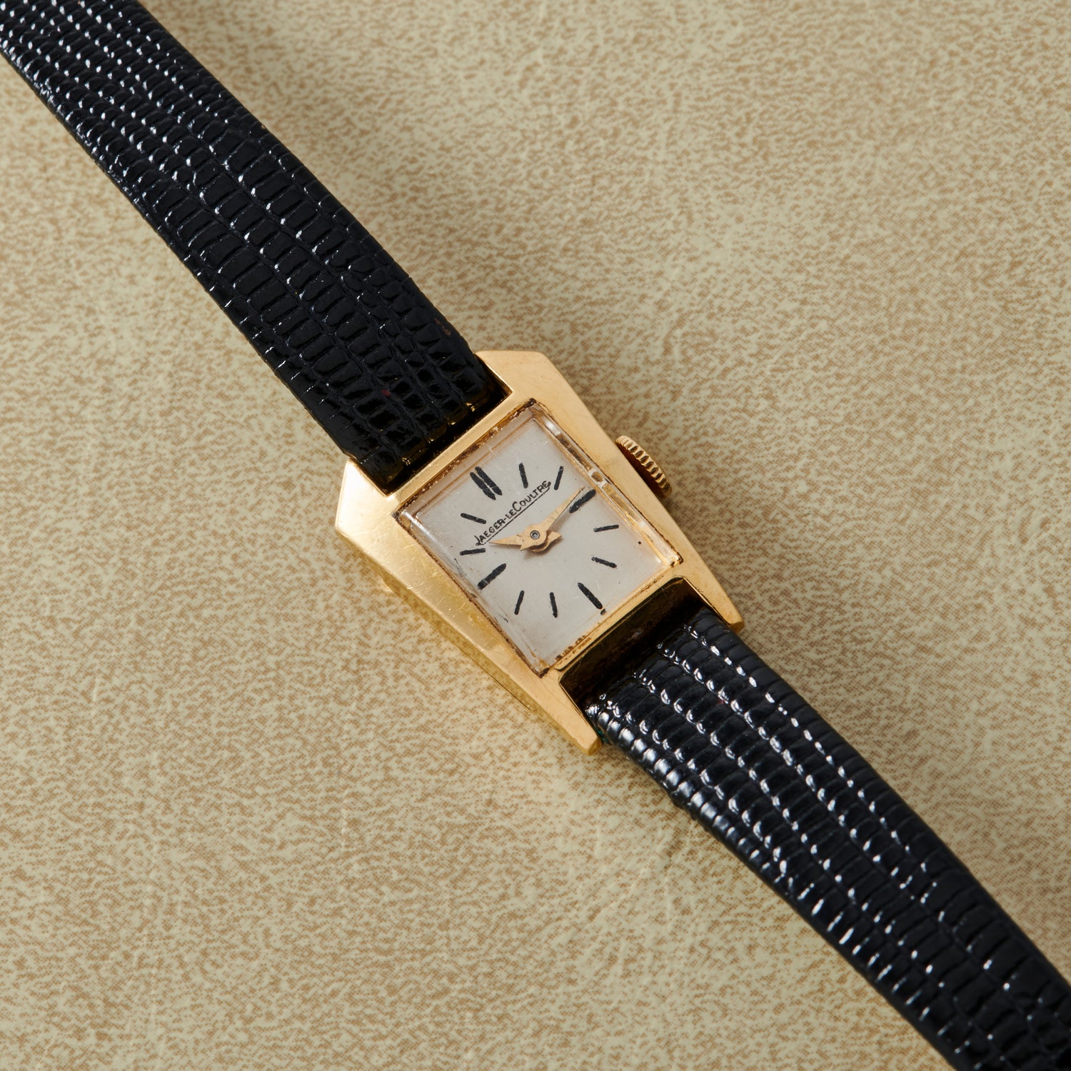 This particular cocktail watch is from La Grand Maison itself, Jaeger-LeCoultre. Housed in a beautifully shaped yellow gold case with an acrylic crystal and an unsigned crown, it features a patinated silver dial with black indices and a matching yellow gold 'fuille' handset.