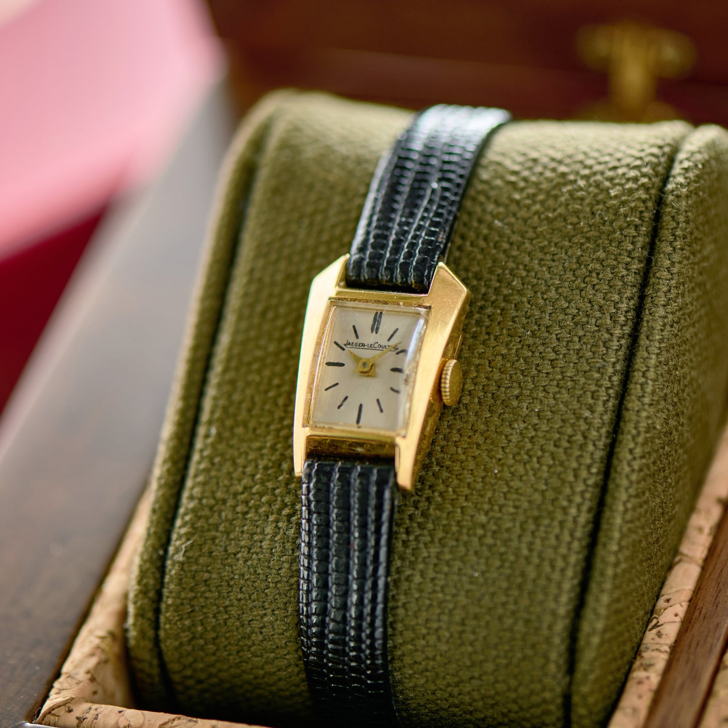 Powered by the famed hand-wound Calibre 101, this midcentury gem is paired to a black leather lizard strap with a yellow gold pin buckle.