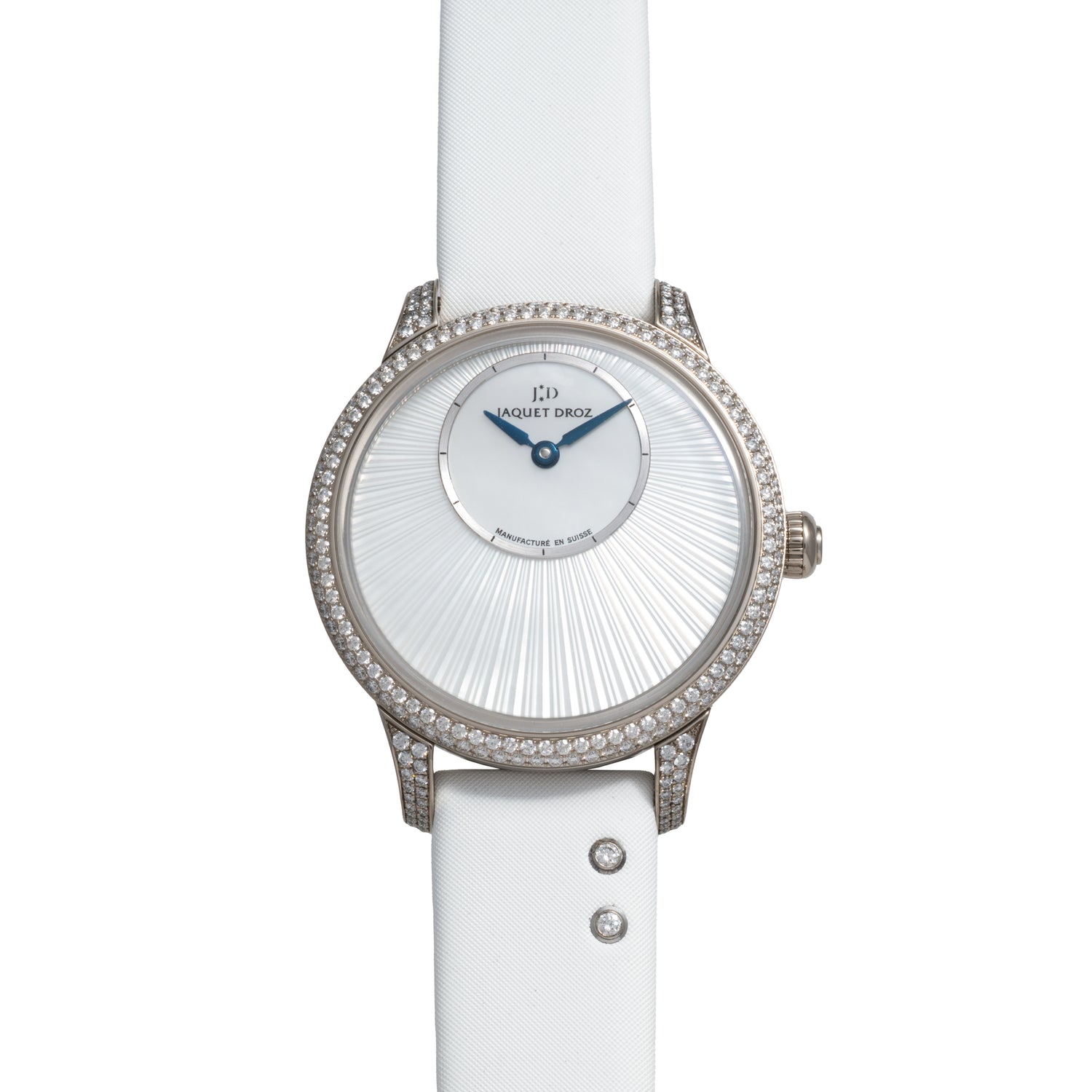 Jaquet Droz, a storied maison now under the Swatch Group, continues to let the spirit of the pocket watch inform its contemporary wristwatch designs. Consider this exquisite Pétite Heure Minute, presented in a 35mm white gold case with a diamond-set bezel and lugs, sapphire crystal, and an onion-shaped crown featuring a push-button corrector. Its luminous mother-of-pearl dial is anchored by a graceful subdial at 12 o'clock, where blued steel alpha hands sweep with refined precision.
