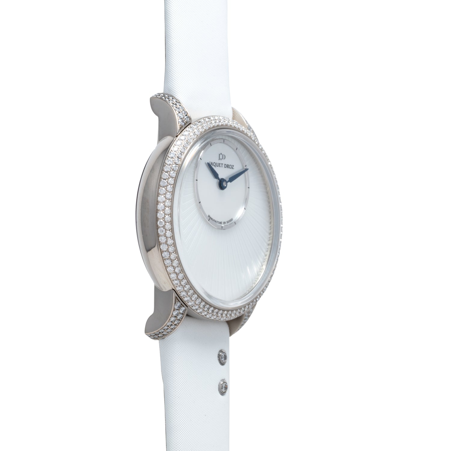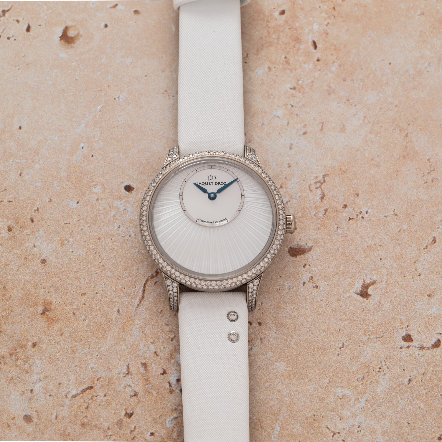 Within the automatic Jaquet Droz calibre 2653P beats a 68-hour power reserve. Set with more than 80 precious stones, the watch pairs elegantly with a signed white leather strap and white gold pin buckle, and arrives complete with its factory accompaniments. For anyone seeking a dazzling timepiece to mark life's most memorable moments, this Pétite Heure Minute is an exquisite statement for the wrist.