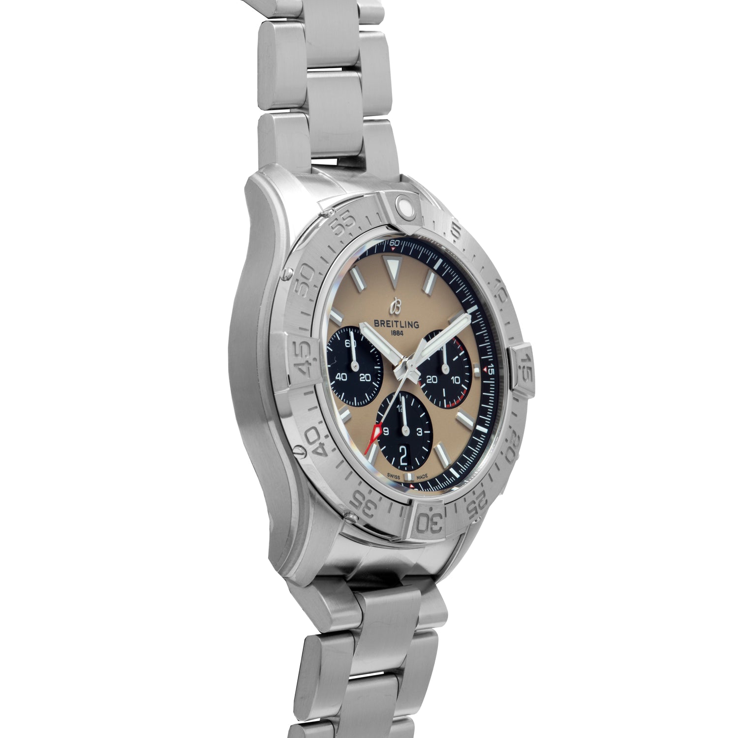 This particular piece, an Avenger B01 44, features — you guessed it — a 44mm stainless steel case with a sapphire crystal, a signed crown, and a unique dive bezel. Inside, it has a lovely tan dial with applied luminous indices and a matching handset.