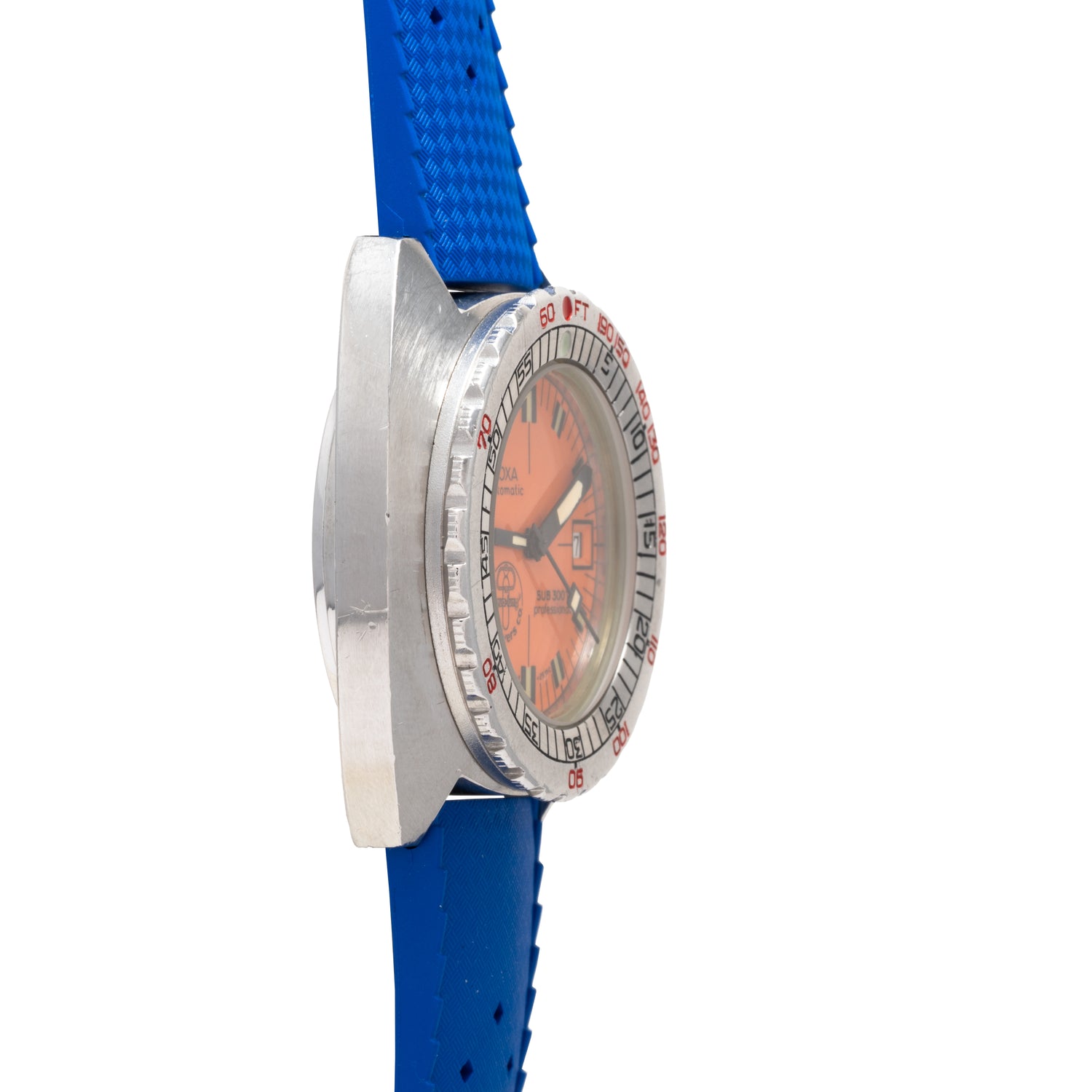 True to its ‘Professional’ namesake, the bright orange dial features printed hour indices, an oversized minute hand, a 'dwarf' hour hand, a date window at 3 o’clock, and notably, an ‘Aqua Lung’ logo in the lower left quadrant, indicating original retail sale through Jacques Cousteau's US Diver's brand. The dial, luminous plots, bezel, and case all show just the right amount of wear and patina for its age and offers up loads of character and charm befitting a 50 year old diver's watch.