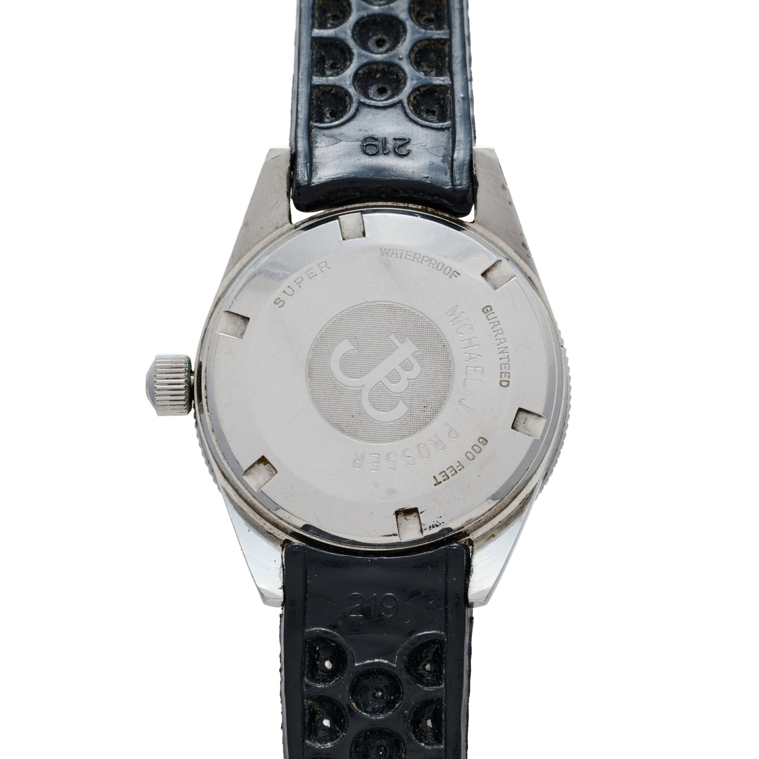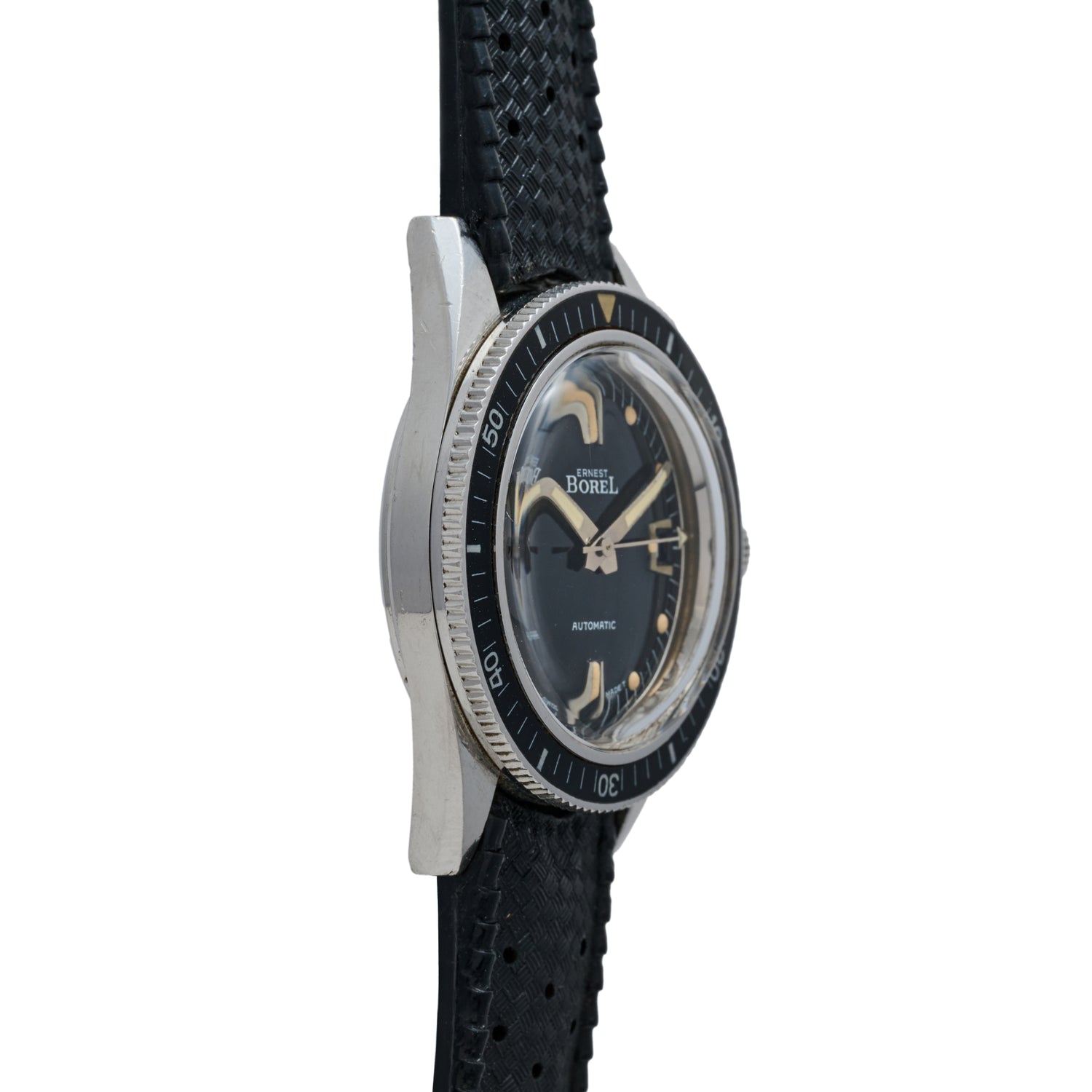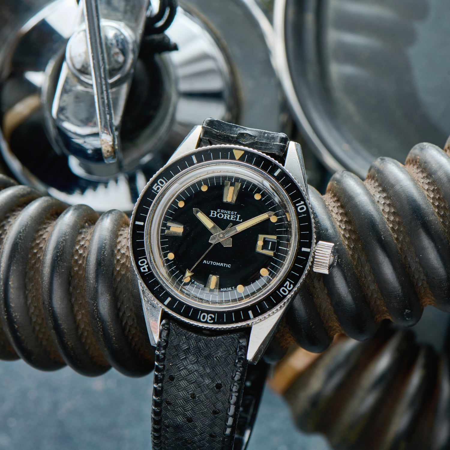 This diver from Swiss firm Ernest Borel may look like a Fifty Fathoms knockoff — but that's not quite the whole story. Back in the mid-20th century, many companies used the same parts suppliers for their watches, which explains why this neat tool watch does in fact look like the spitting image of Blancpain's famous diver. Measuring 39mm in stainless steel with faceted lugs, a large, unsigned crown, an acrylic crystal, and a bidirectional bezel with a fully-hashed dive insert, it features a black dial with an open, outer minute track, luminous and applied indices, a framed date window at 3 o'clock, and a luminous 'sword' handset.