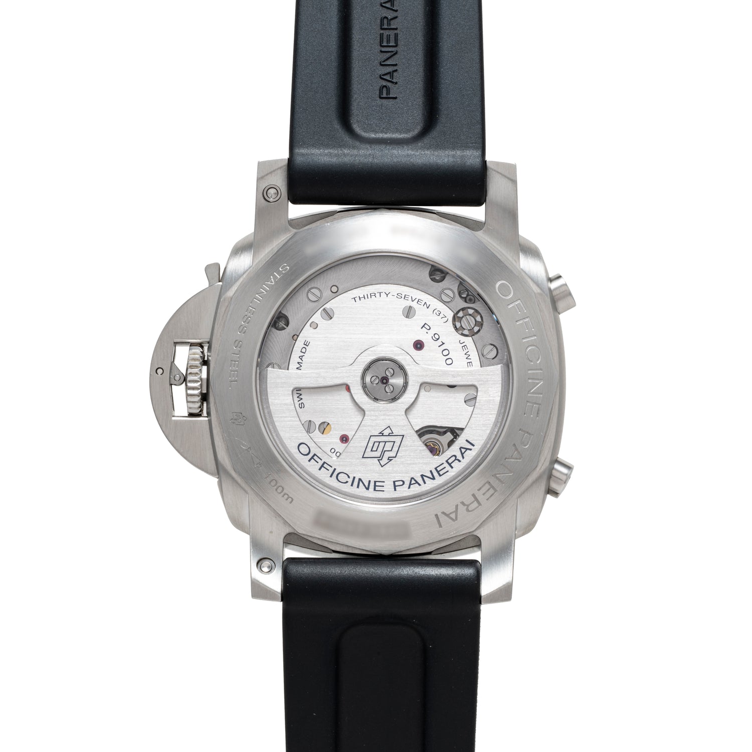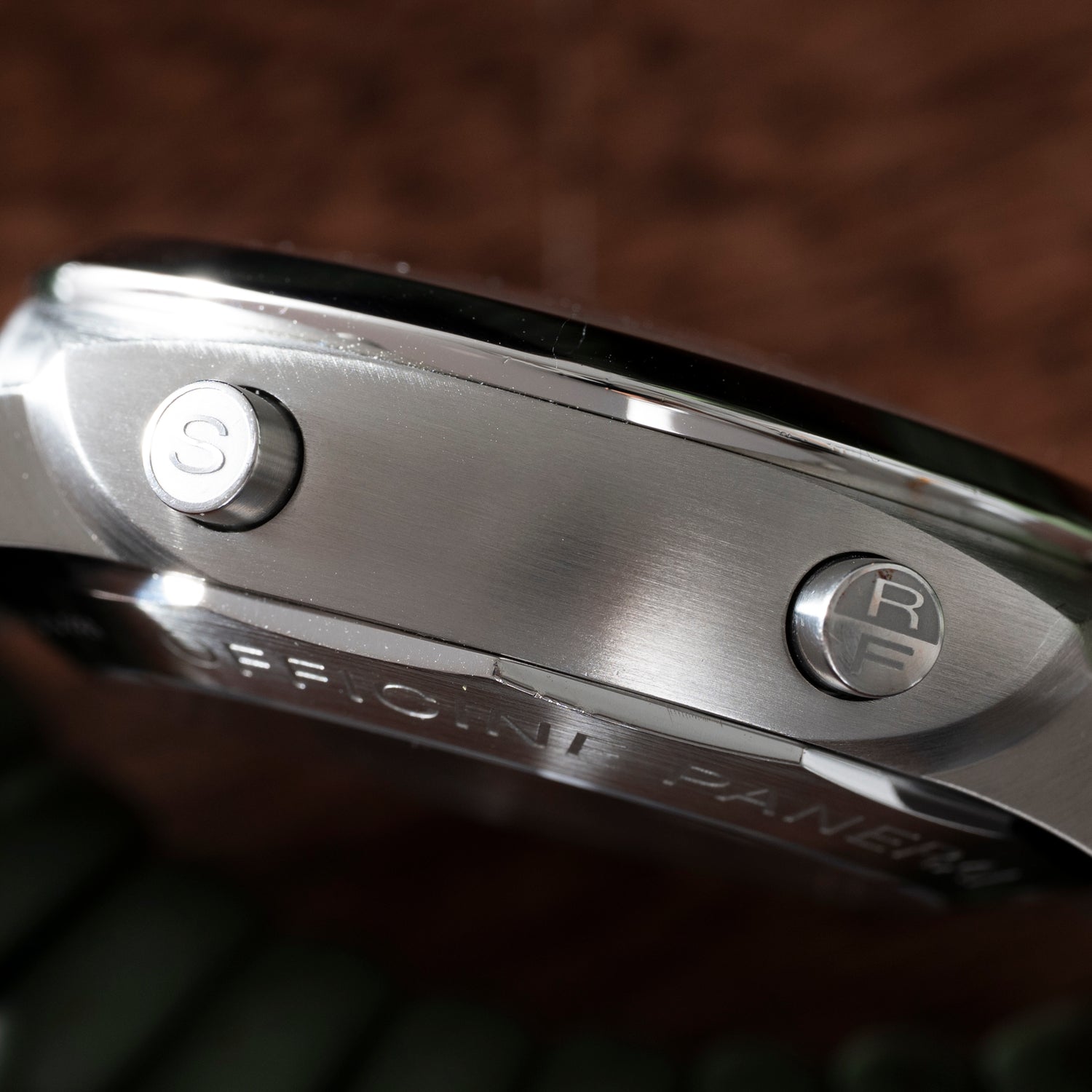 Housed in a 44mm brushed stainless steel Luminor case with a crown protection device, dual pump pushers on the left-hand flank, a smooth, polished bezel, and a sapphire crystal, it features a luminous black ‘sandwich’ dial with ‘Arabic’ and ‘dash’ indices, a lumed ‘sword’ handset with central seconds and minute hands, a running seconds register at 9 o'clock, and a date window at 3 o'clock.