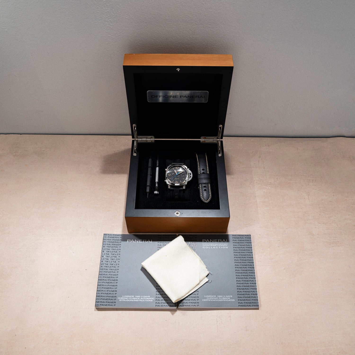 Powering this serious timing instrument is the automatic Panerai P.9100 caliber with dual barrels and three days of power reserve, while black rubber and black leather straps with a stainless steel pin buckle complete the seaworthy package. Accompanied by its factory goodies, this is a beautiful example of a contemporary Panerai that applies modern horological tech to a vintage-inspired package.