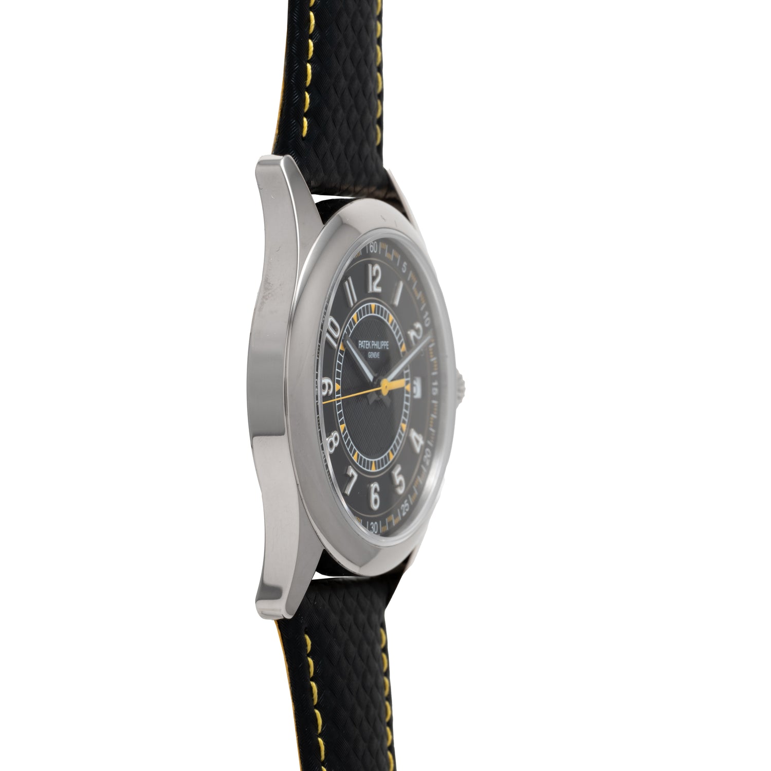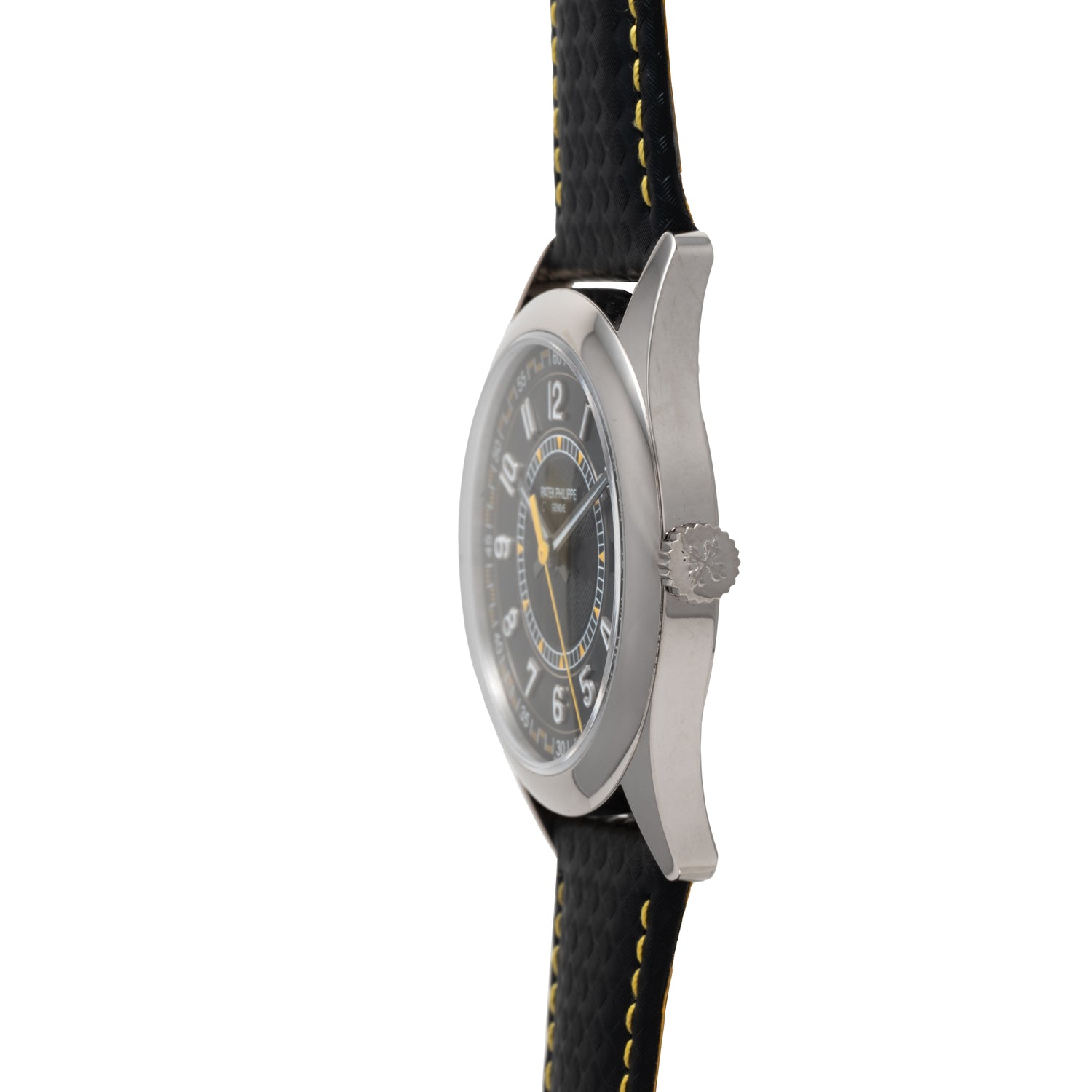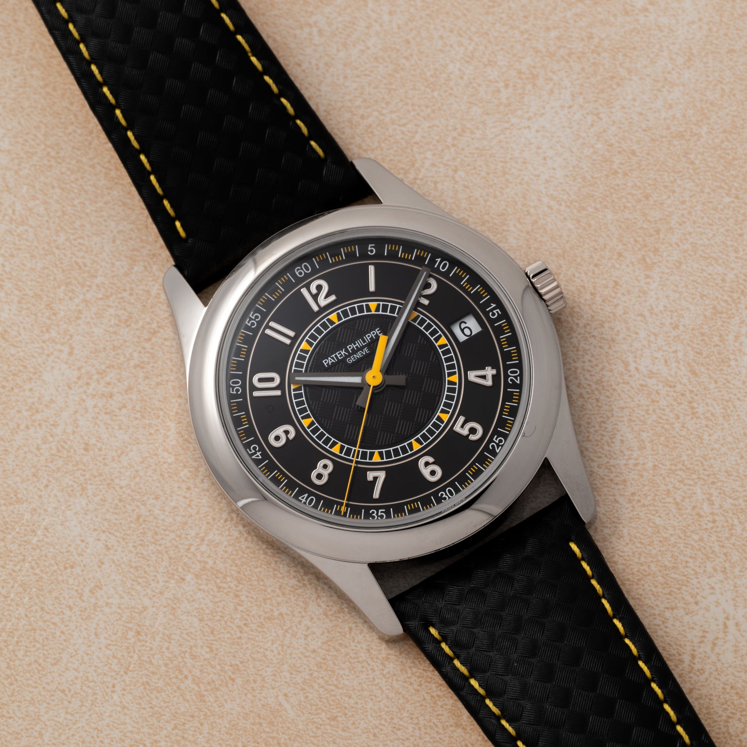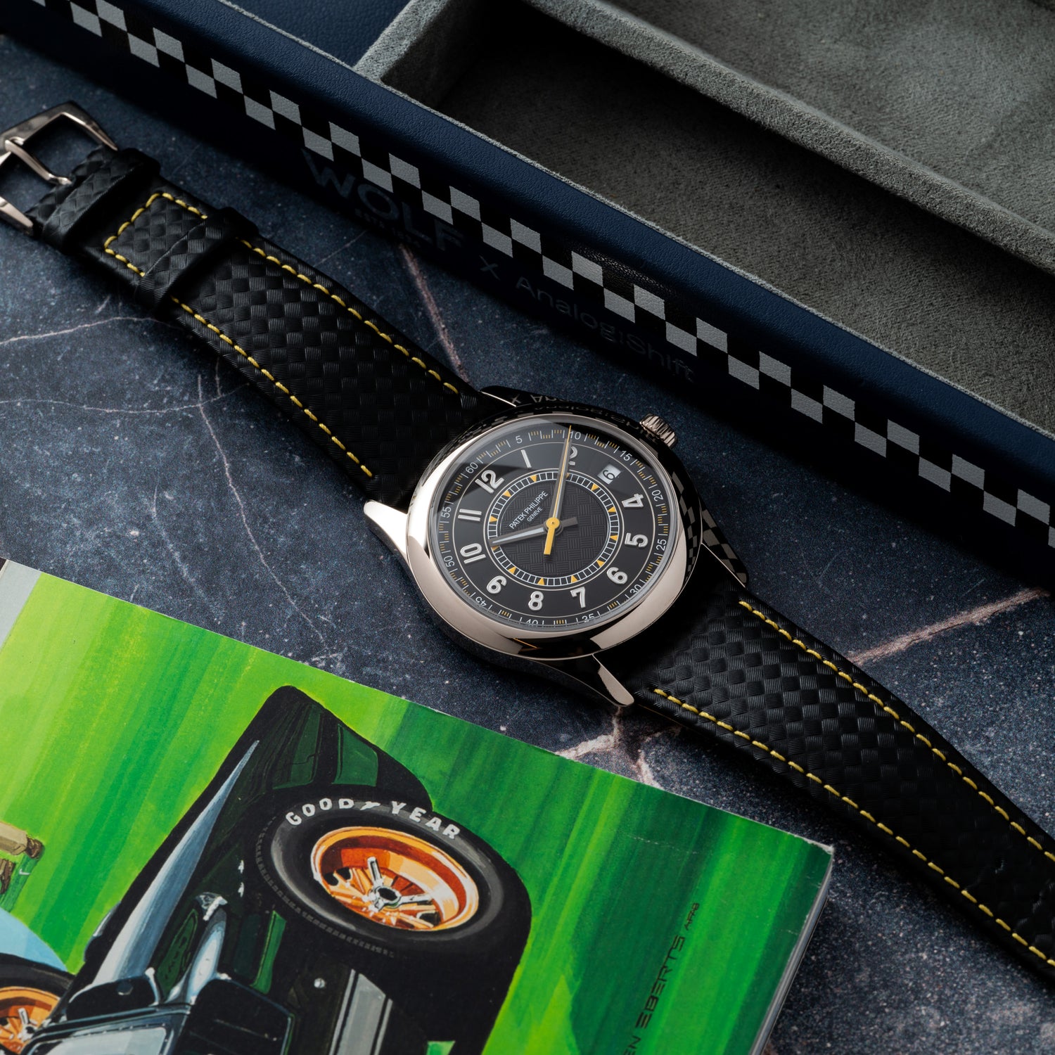 Housed in a 40mm 18K white gold case, this piece features a polished bezel and case complemented by a sapphire crystal and a signed crown. The black luminous dial features a matching white gold handset and radially configured, luminous, white gold Arabic indices. Straying away from the traditional dressier aesthetics of the Calatrava model, the Patek Philippe design team elected to add sportier design notes with its center dial adorned with a 'carbon' finish and a yellow accented, checker-style, minute track.