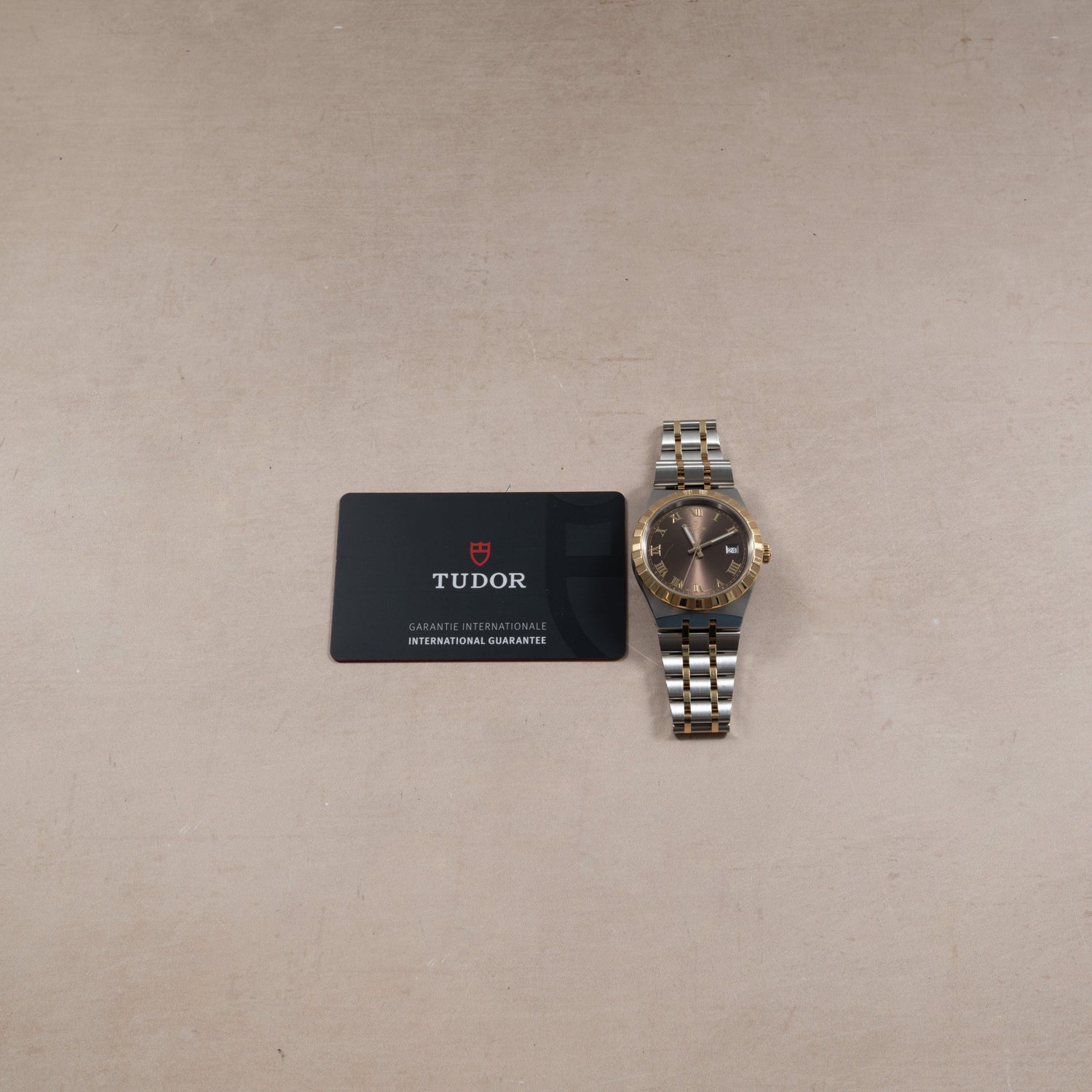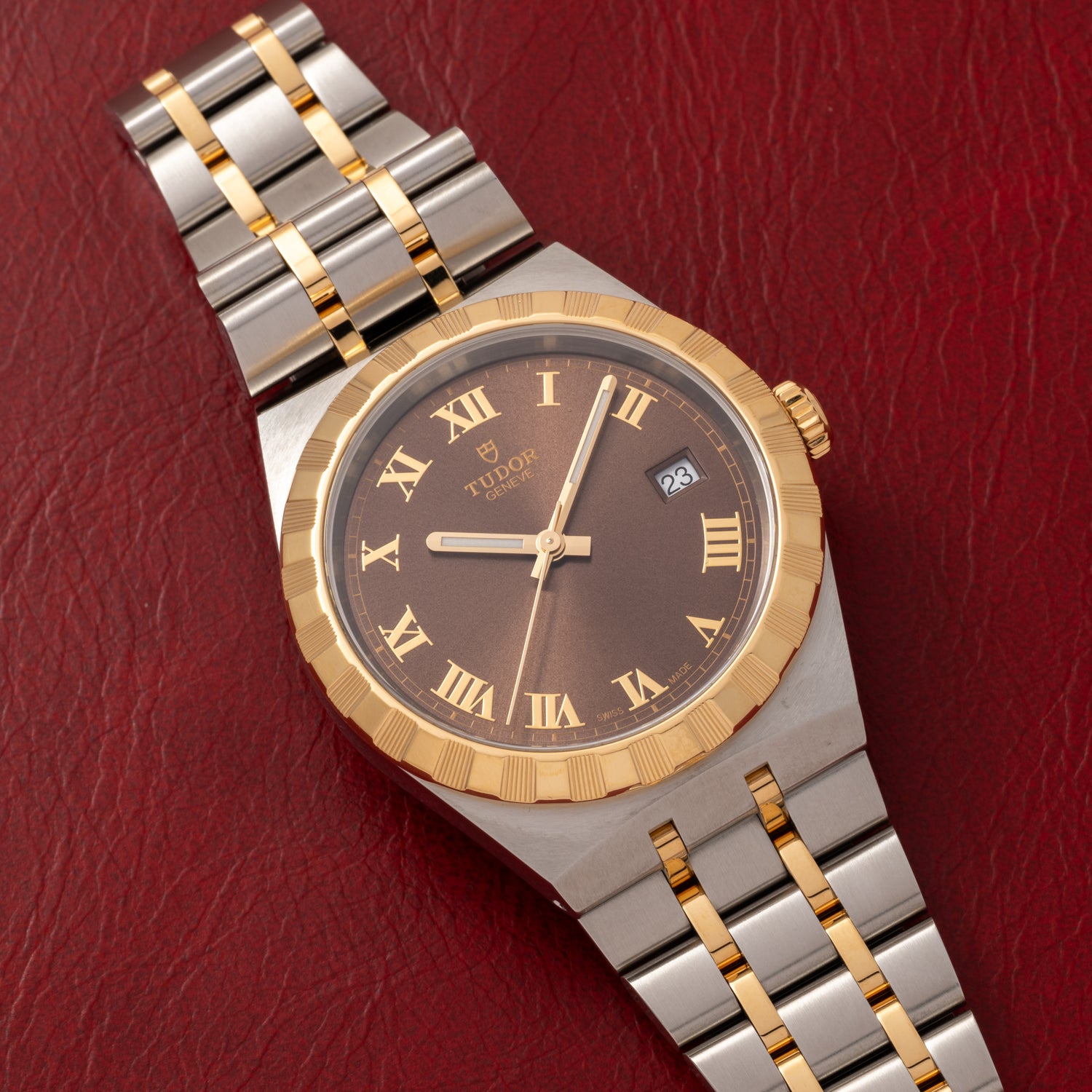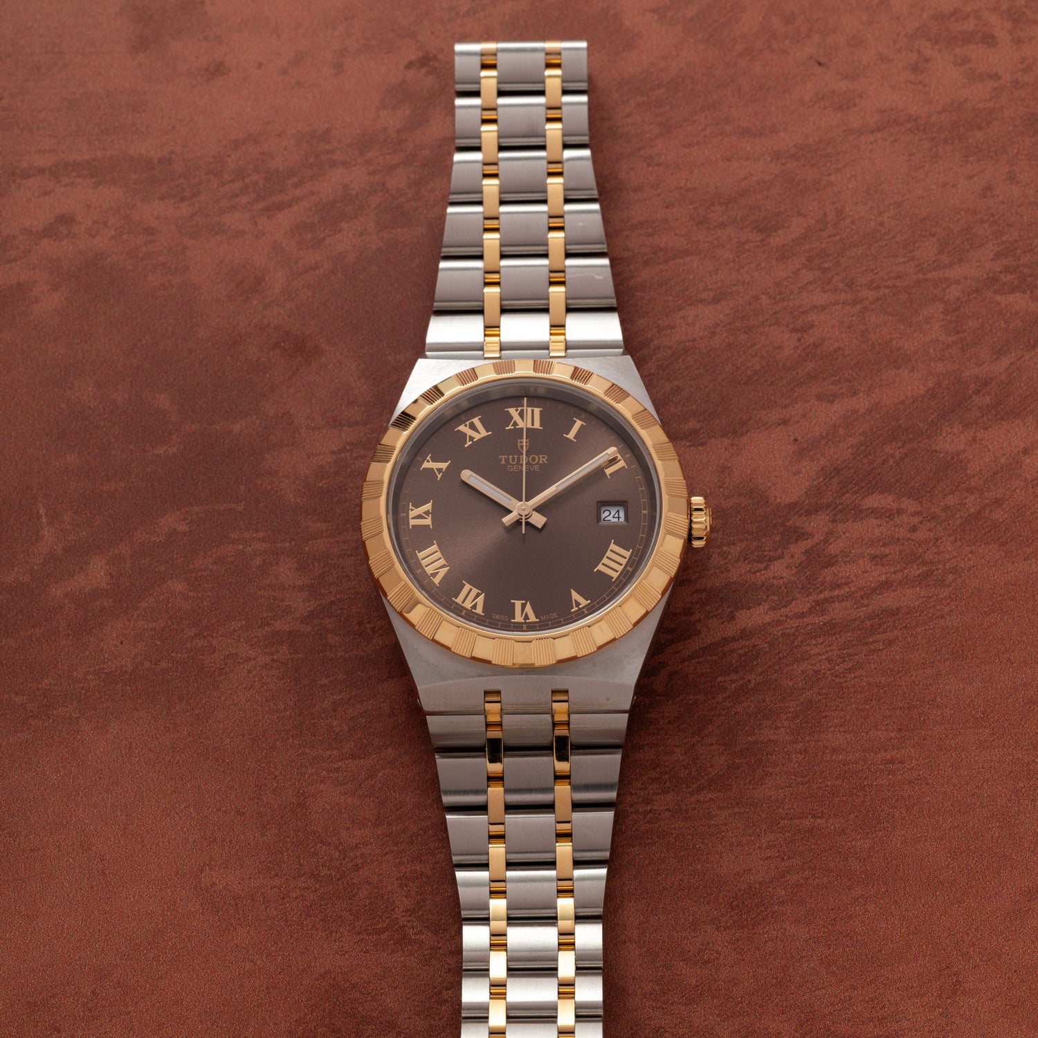 This particular watch is a 38mm Tudor Royal Reference M28503-0007 featuring a yellow gold crenelated bezel with alternating fluted and polished finish, a Roman numeral brown dial, a matching ‘stick’ handset, and a date at 3 o’clock. Tudor’s Calibre T601 and fitted to the Royal collection’s signature integrated five-link bracelet with two tone stainless steel and gold plated links.