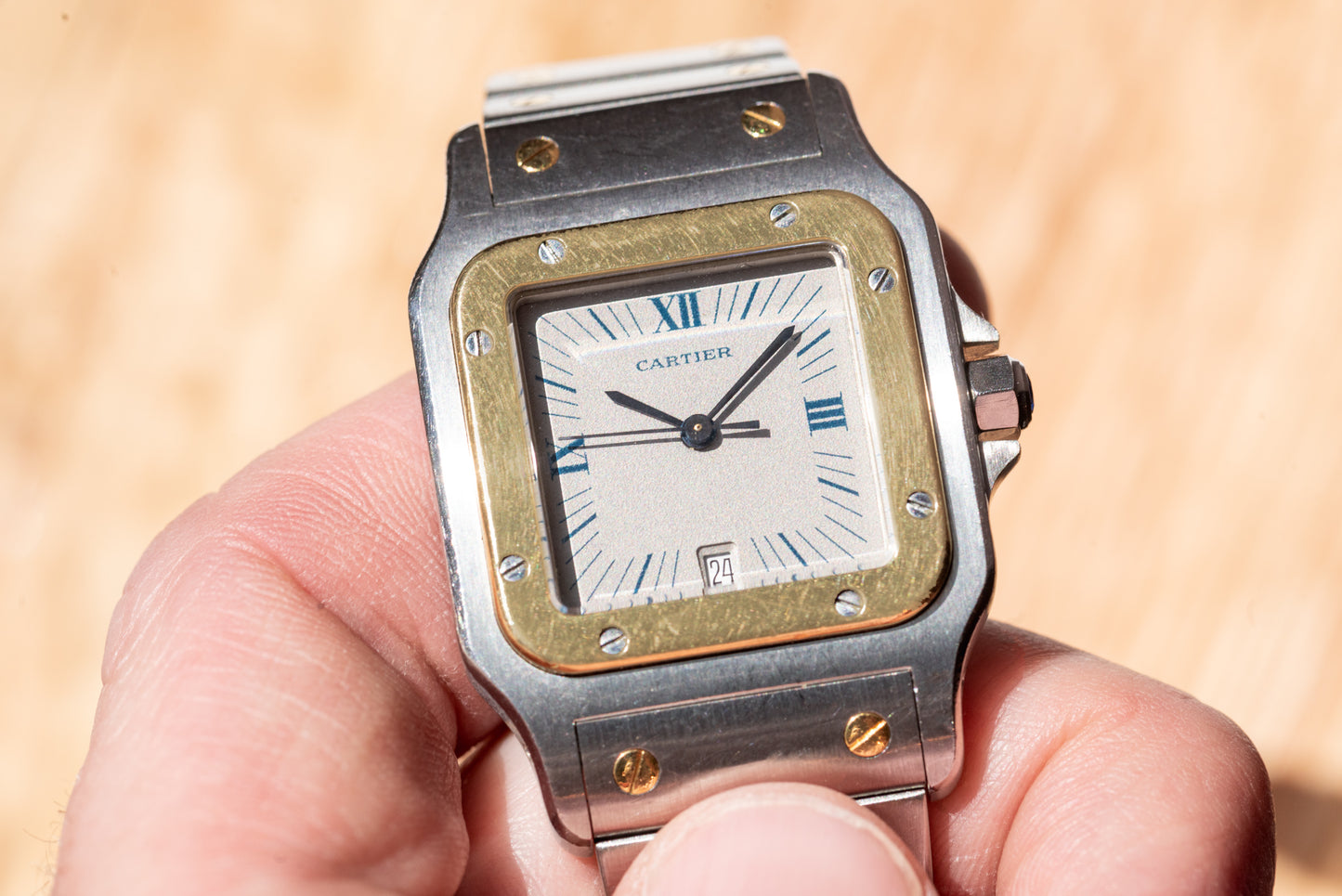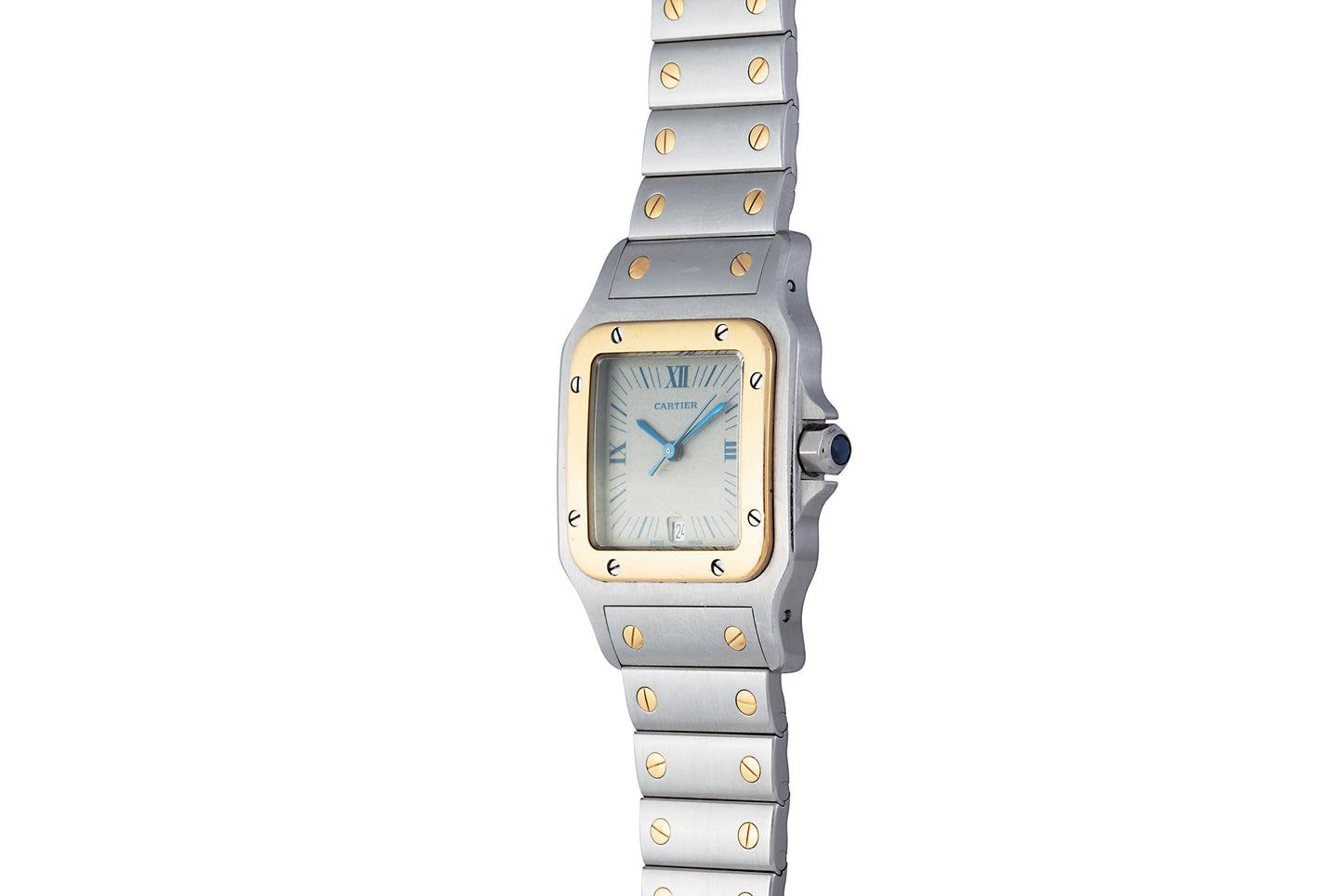 This particular Santos, dating to circa the 1990s, features a 30mm 18k yellow gold and stainless steel case with an excellent matching two-tone bracelet, a sapphire crystal, a sapphire cabochon crown, and a matte grey dial with printed blue Roman indices and a matching blued steel sword handset.