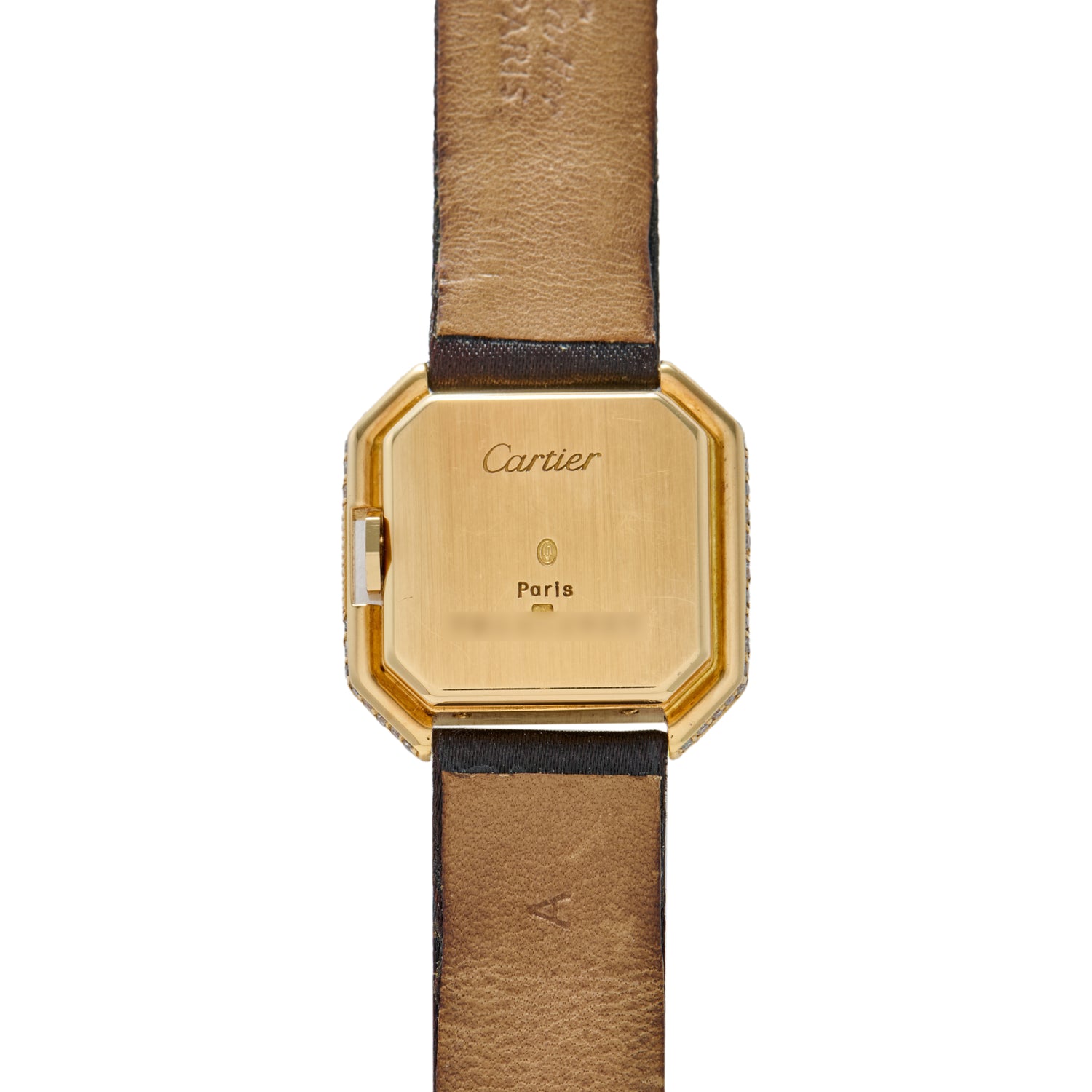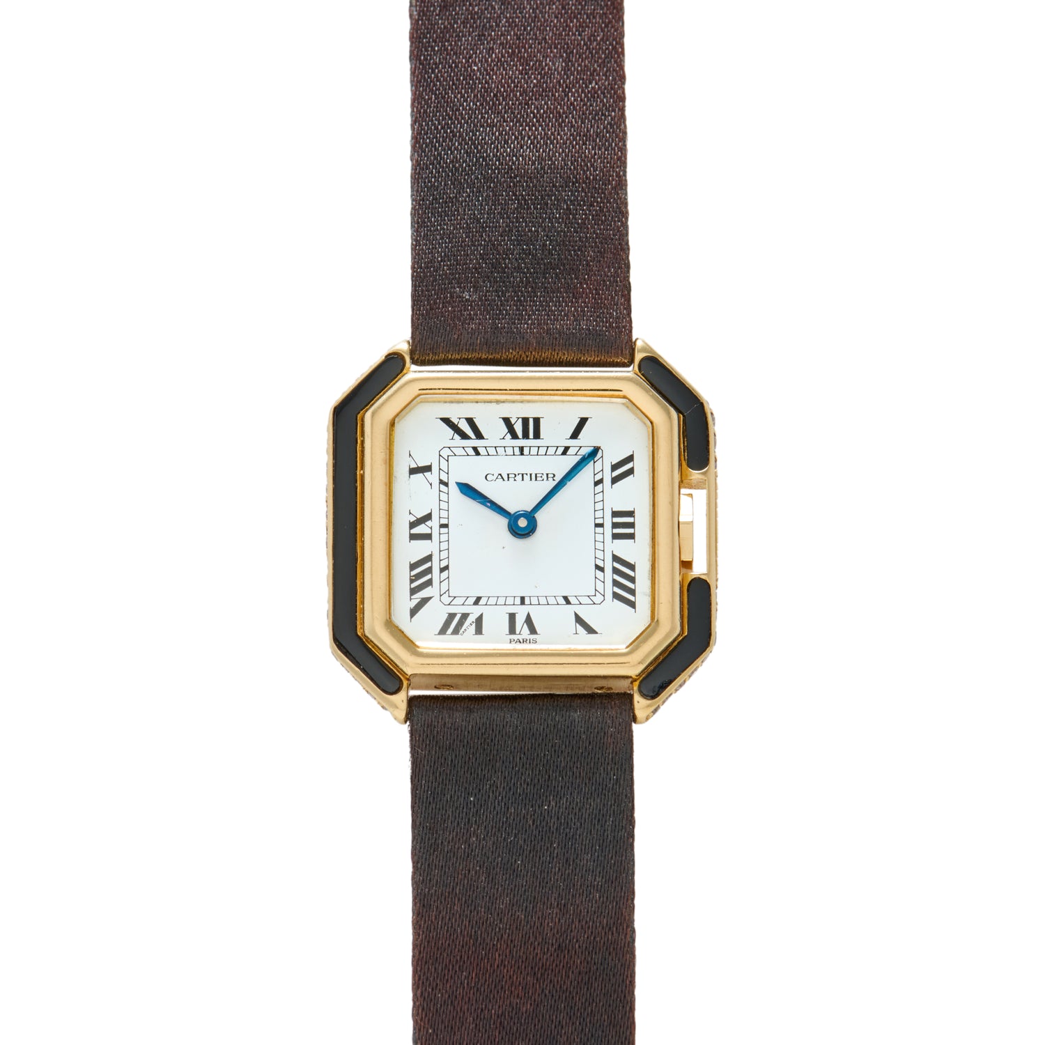 This particular Ceinture, a playful departure from the rectangular Tank, dates to the late 1970s. Housed in a Paris-signed 25mm 18K yellow gold octagonal case with a shrouded winding crown, this lovely piece features an acrylic crystal, a white 'Paris' dial with printed Roman indices and 'railroad' minute track, and a matching, blued-steel handset. Powered by a hand-wound movement, it combines classic Cartier appeal with modern geometric appeal. The crowning jewel of this piece is its onyx inlaid bezel and factory set diamonds on the midcoast --- a unique feature present on a subset of the Ceinture pieces.