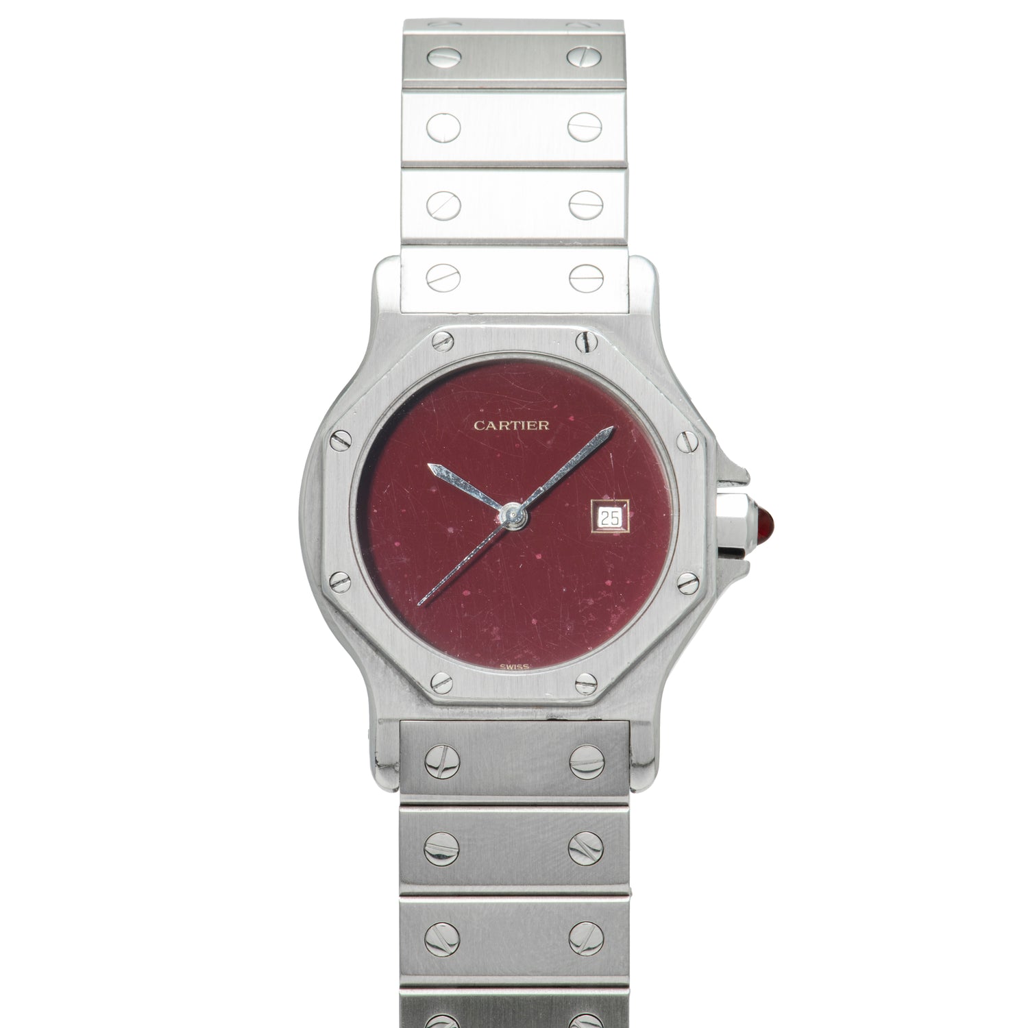 This Cartier Santos features a glossy burgundy dial framed by a classic Santos themed octagonal bezel. Housed in a 30mm stainless steel case, it features an integrated stainless bracelet, also with a Santos themed motif, and a double 'C' signed deployant clasp.