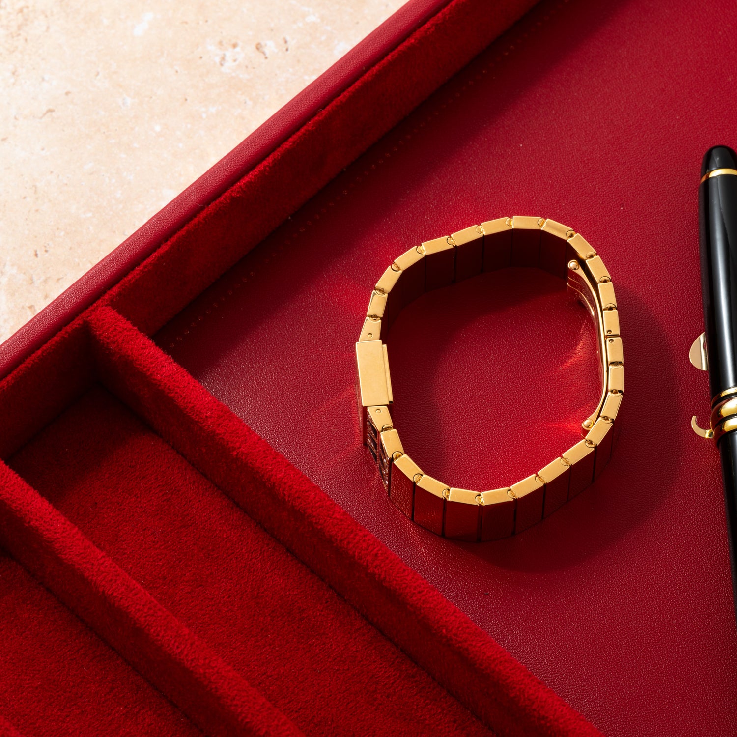 Housed in a square, yellow gold case with stylized, integrated lugs with factory-set diamonds and stones, it features a patinated dial with classic Cartier numerals, a blued steel ‘sword’ handset, and a small ‘Cartier’ signature. Powered by a quartz movement, it comes paired to a unique-link yellow gold integrated bracelet.