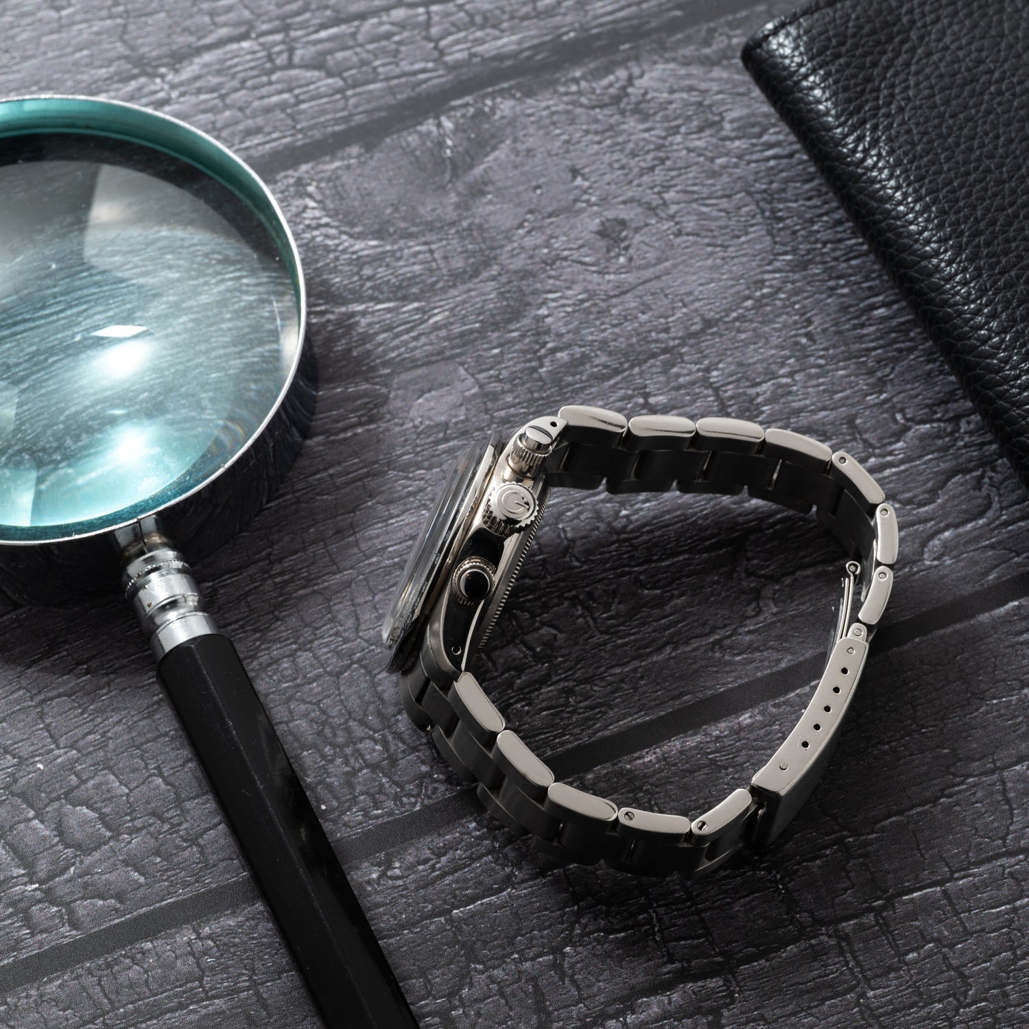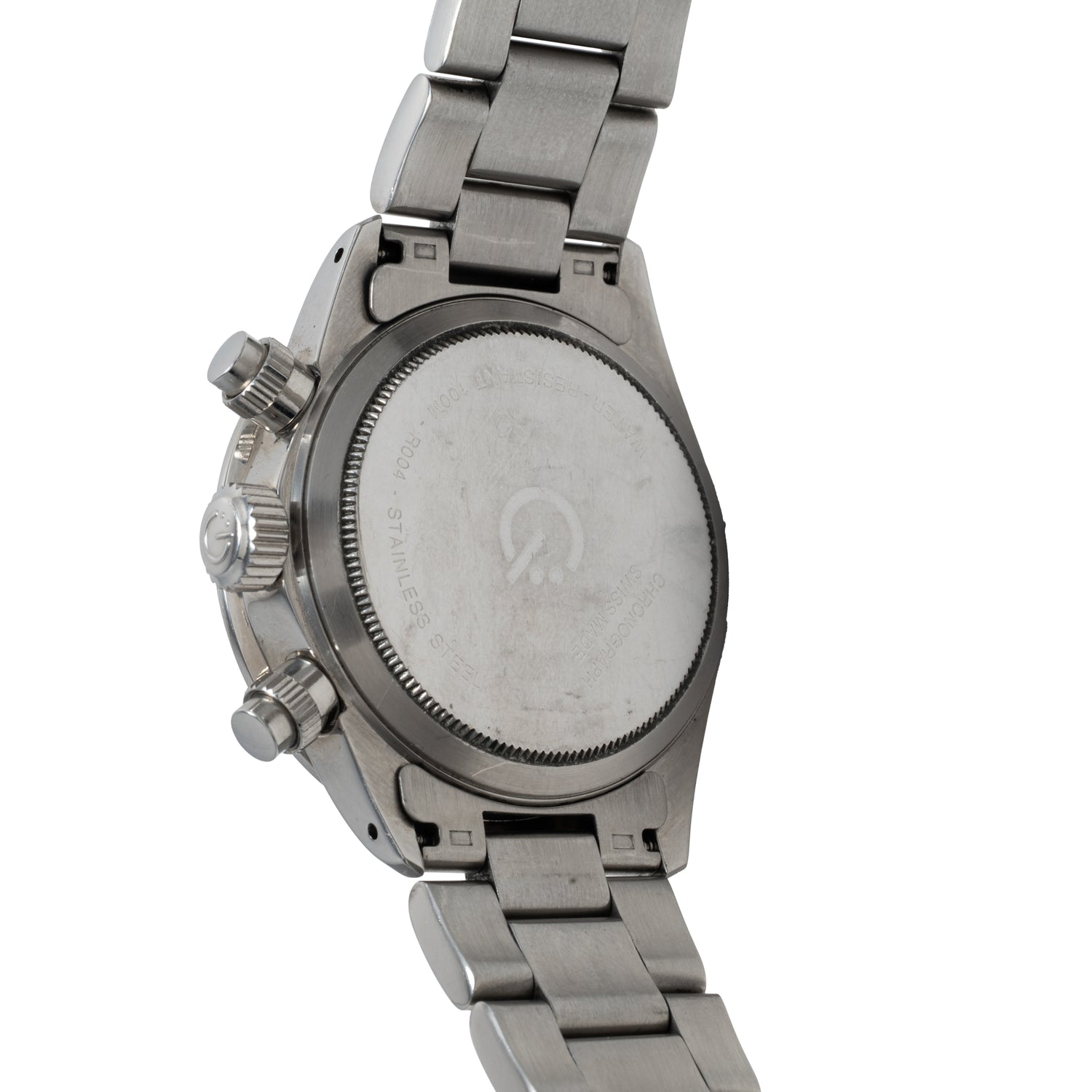This particular example is housed in a 37mm stainless steel case with holey lugs, screw-down pushers, an acrylic crystal, and stainless steel bezel with a black tachymeter scale insert. Featuring a matte black dial with a trio of radially-brushed silver subsidiary registers, a baton handset, and an outer, 1/5th-second track, it displays its individual production number in red text at the 6 o’clock position. Powered by a workhorse ETA movement, it comes fitted to an Oyster-style multi-link stainless steel bracelet with a signed blade clasp to complete the look.