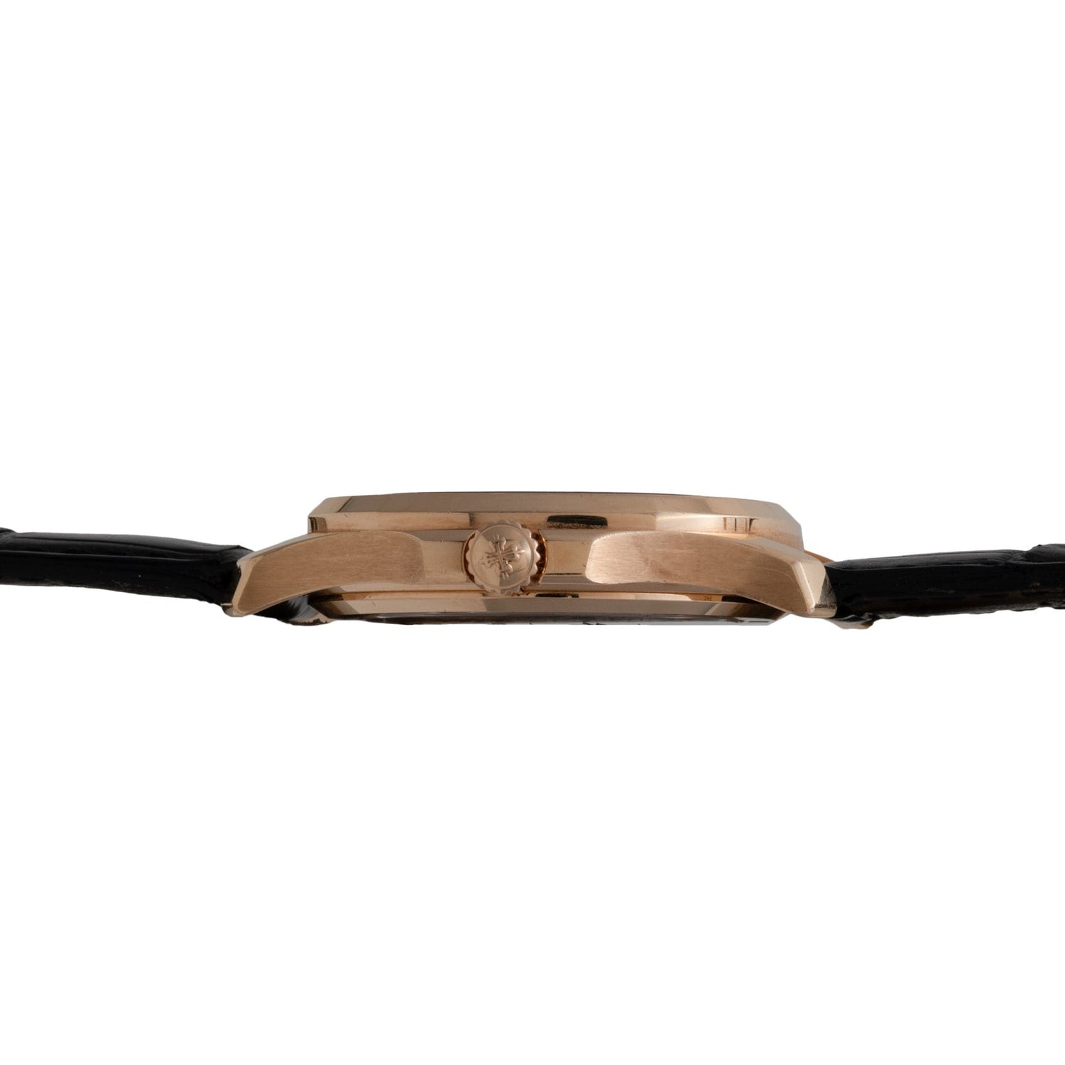 Dating to the late 90's and features a 35mm 18K rose gold case with a sapphire crystal, a signed crown, a cream glossy black dial with applied Tritium-filled 'Roman' indices and matching feuille handset, and a date window at 3:00, It comes fitted to a signed black alligator leather strap with a signed 18K gold pin buckle and is powered by Patek's Calibre 330/194 automatic winding movement.