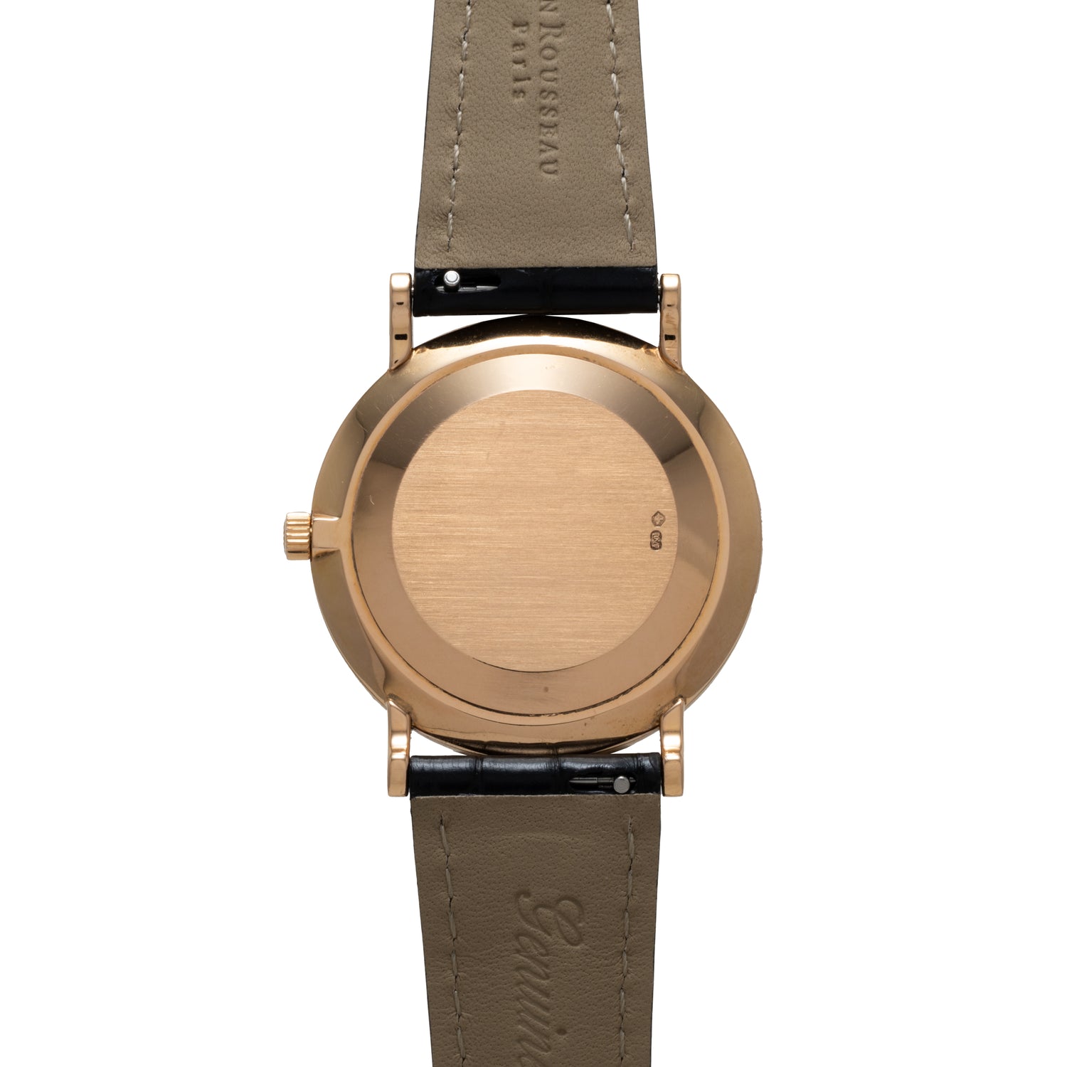 This particular example, a Reference 3919J, carries that legacy into the modern era with grace. Measuring 33mm, it features the Calatrava’s signature Clous de Paris hobnail bezel in 18K yellow gold, framing a glossy white dial with painted Roman numerals, feuille hands, and a subsidiary seconds register at six o’clock. Paired with a black alligator leather strap and signed gold pin buckle, it is effortlessly versatile — equally at home beneath a cuff at the office or with formal evening wear. Inside beats the manually wound Patek Philippe Calibre 215 PS, celebrated for its precision, reliability, and refinement.