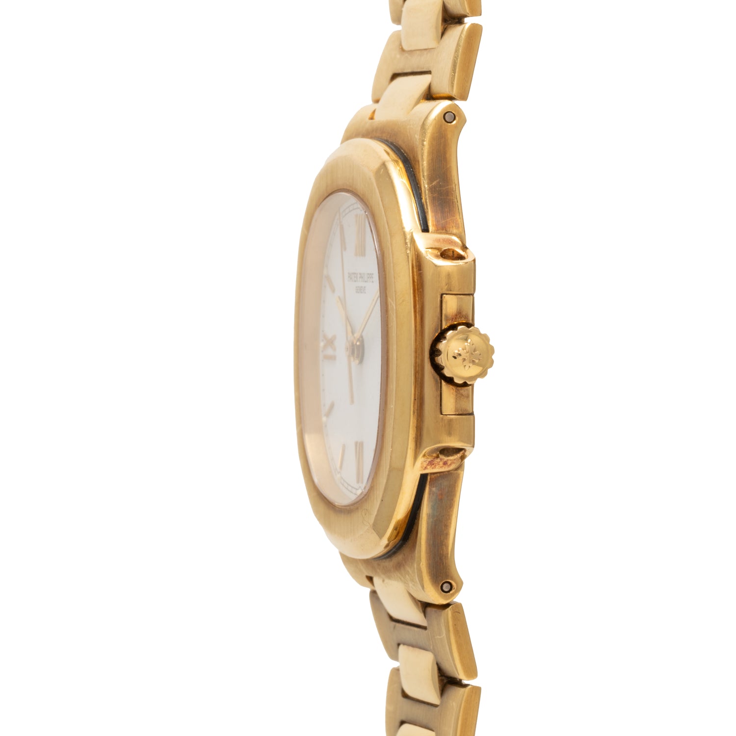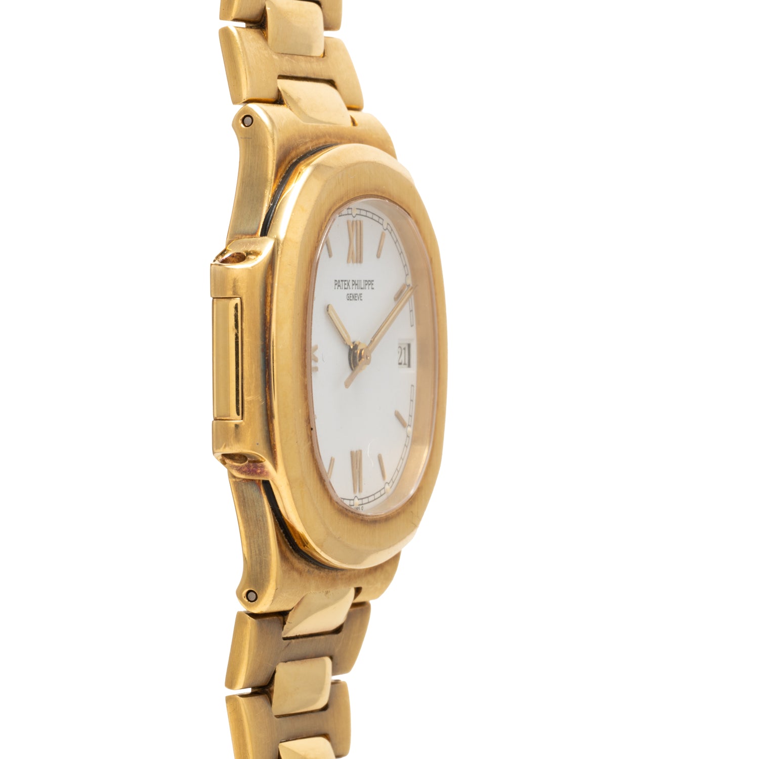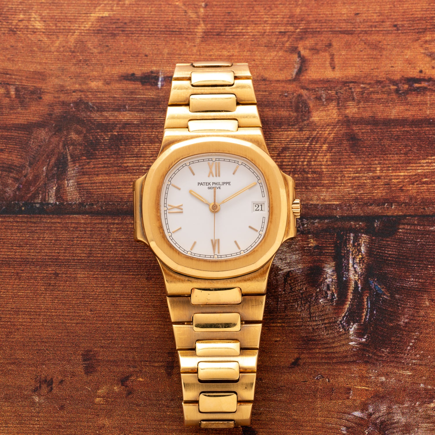 This midsize Nautilus, a Reference 3800/1J, embodies all of the porthole-inspired character of its larger siblings, just with a slightly smaller 37mm case, and a perhaps more polarizing metal color. Dating to circa the 1990s, it features a matching integrated yellow gold bracelet, a signed crown, a crispy white lacquer tritium dial with an outer 'railroad' minute track, applied yellow gold indices, and a matching handset, and Patek's Calibre 330SC automatic movement inside. It also happens to ship with its factory goodies, including its inner and outer boxes and Certificate of Origin dated February, 1996.