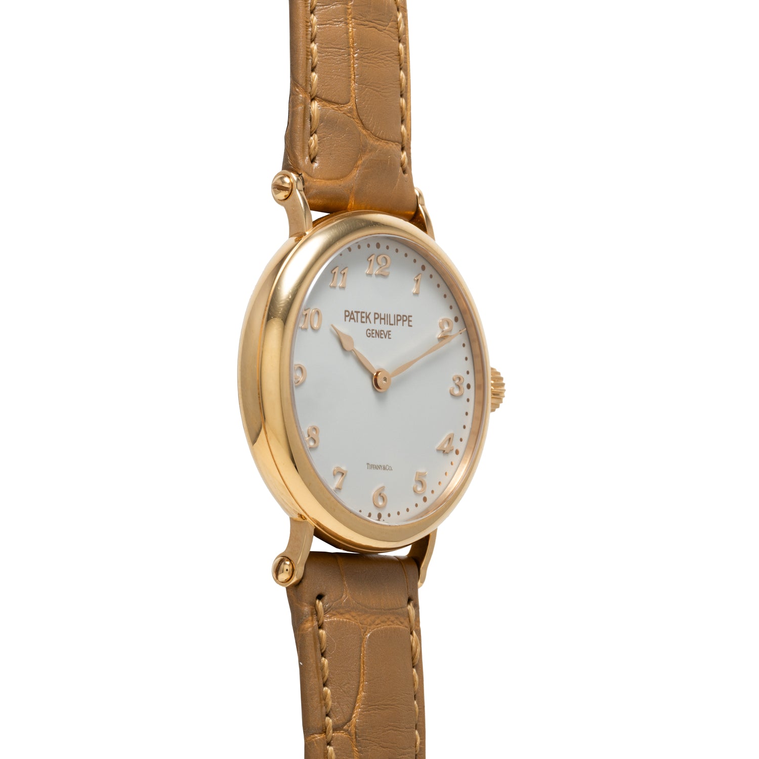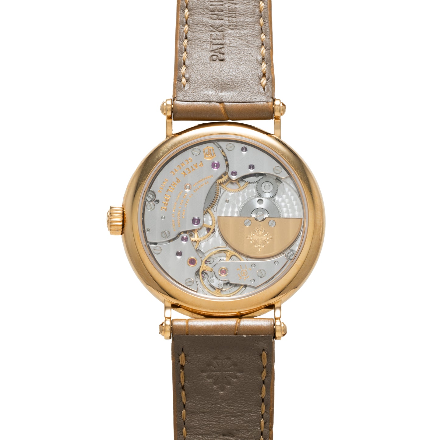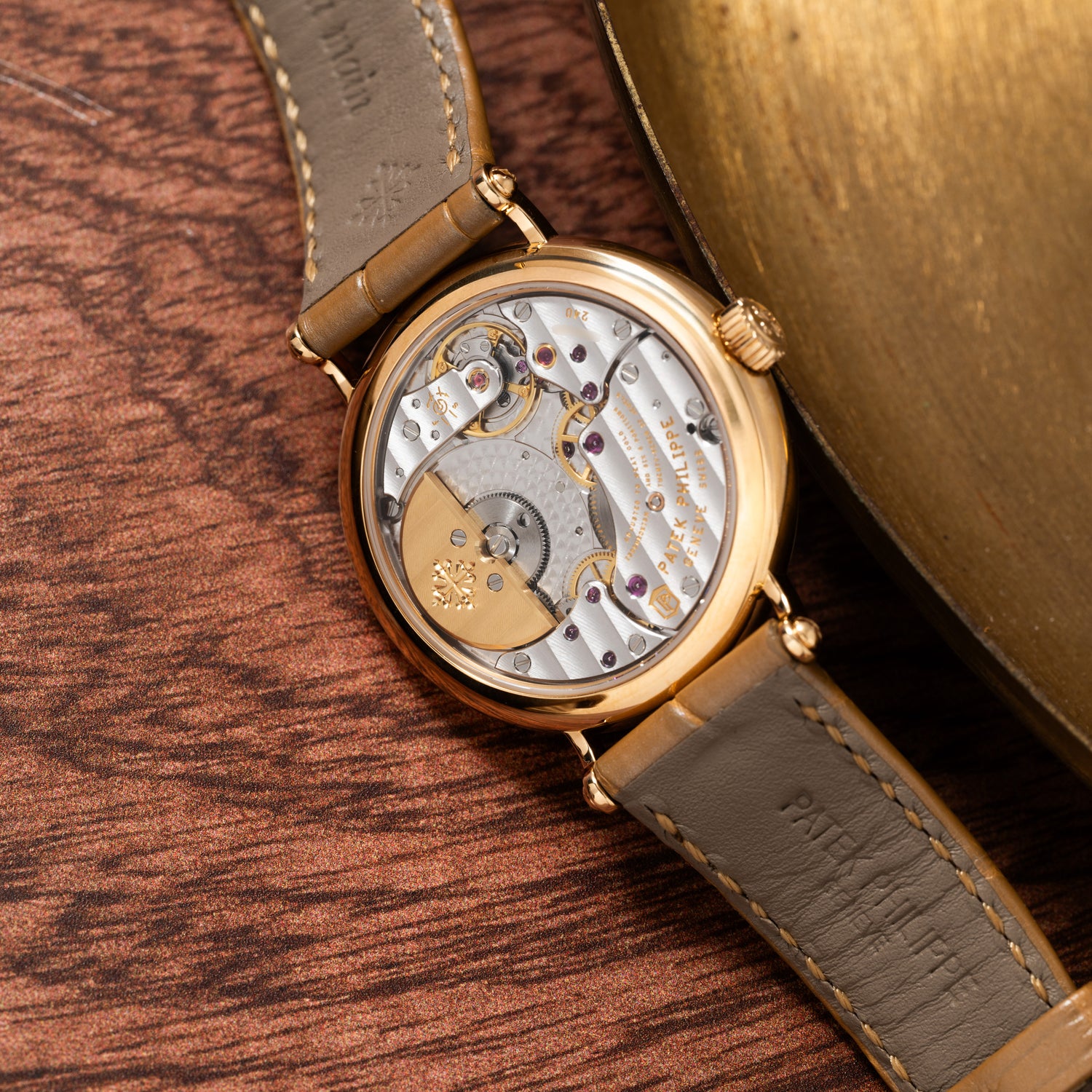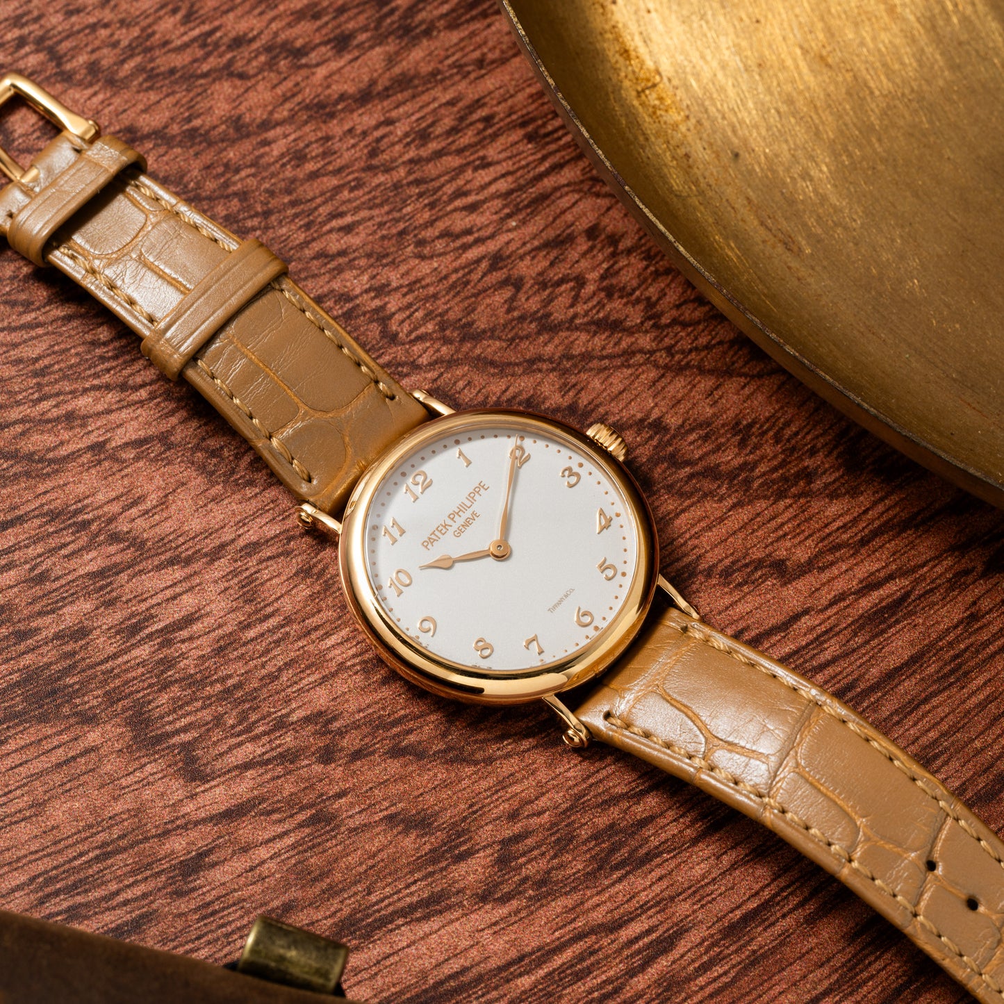 Powered by the Patek Philippe Calibre 240 ultra-thin automatic movement — whose attractive finishing and solid-gold winding rotor are visible via a sapphire caseback — this beautiful piece comes paired to a signed, tan-colored alligator strap with square scales, tone-on-tone stitching, and a gold prong buckle.