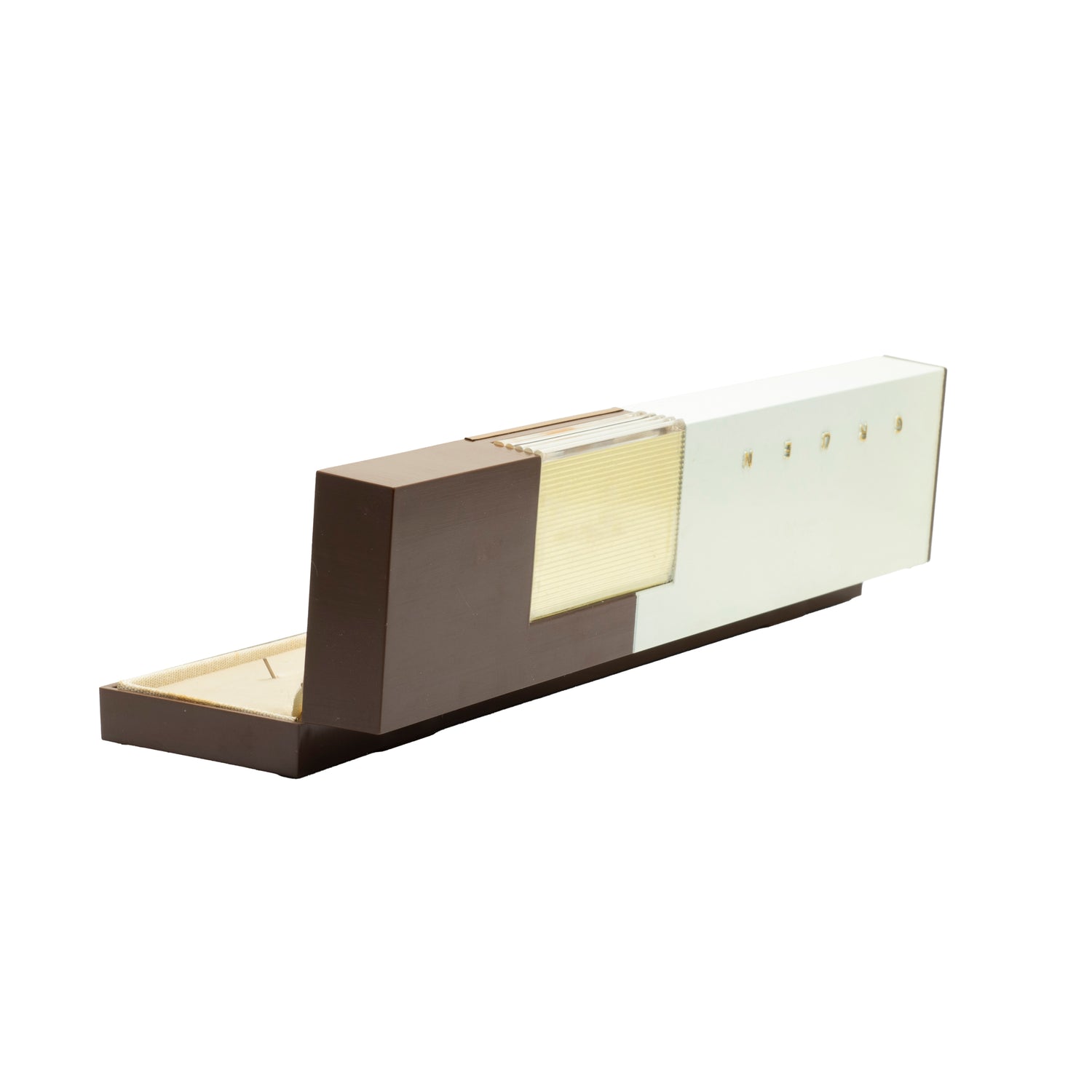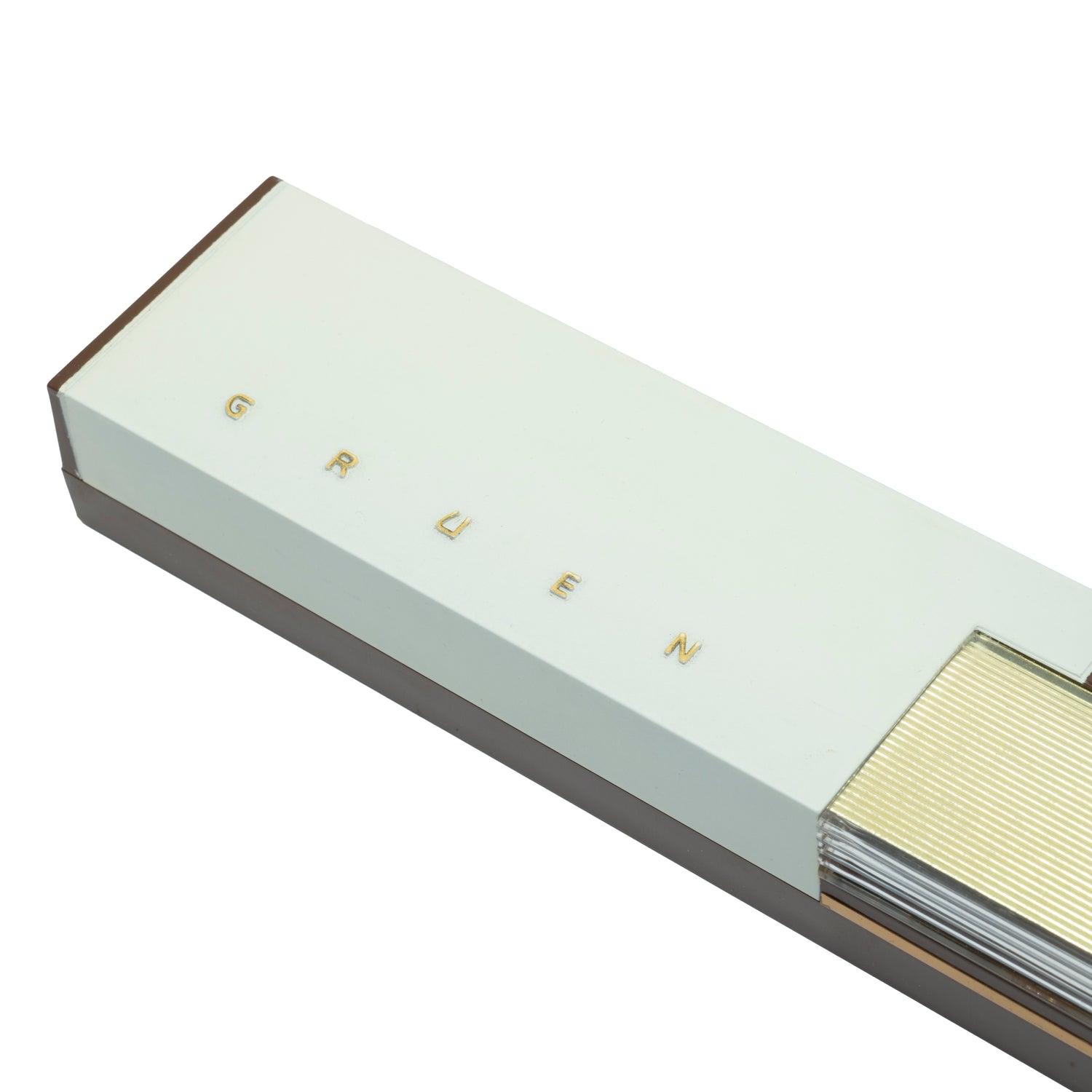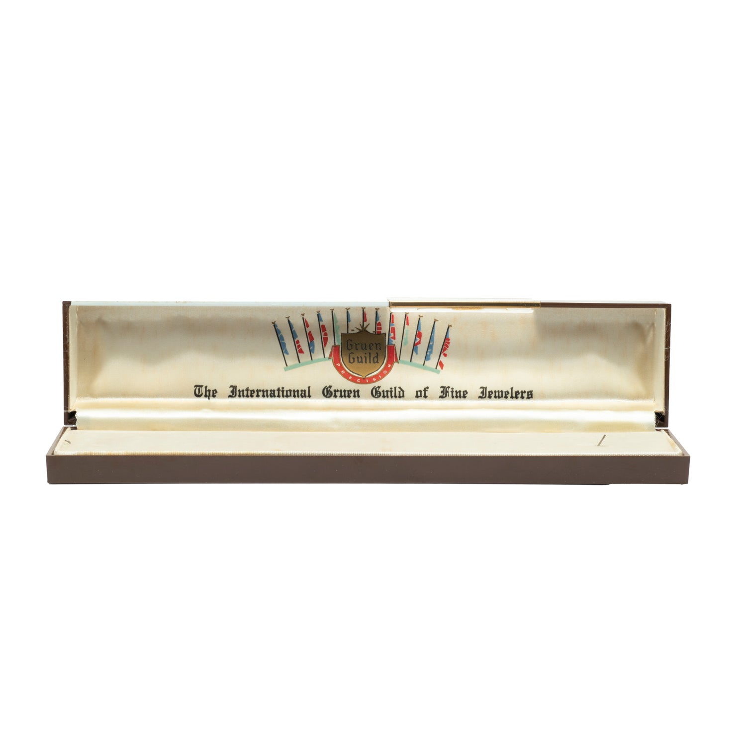 This wonderful find is a lovely and collectible Gruen watch box set from the 1940s, coming complete with both outer and inner components: While the outer box features cream-colored cardboard construction with gilt lettering, the distinctive inner box is an Art Deco masterpiece: Made in the USA from celluloid with an applied Gruen logo and measuring 9 5/8" x 2" x 1 1/8", it opens to reveal a padded watch housing and a handsome multi-colored logo with "Gruen Guild" and "The International Gruen Guild of Fine Jewelers" in black cursive script.