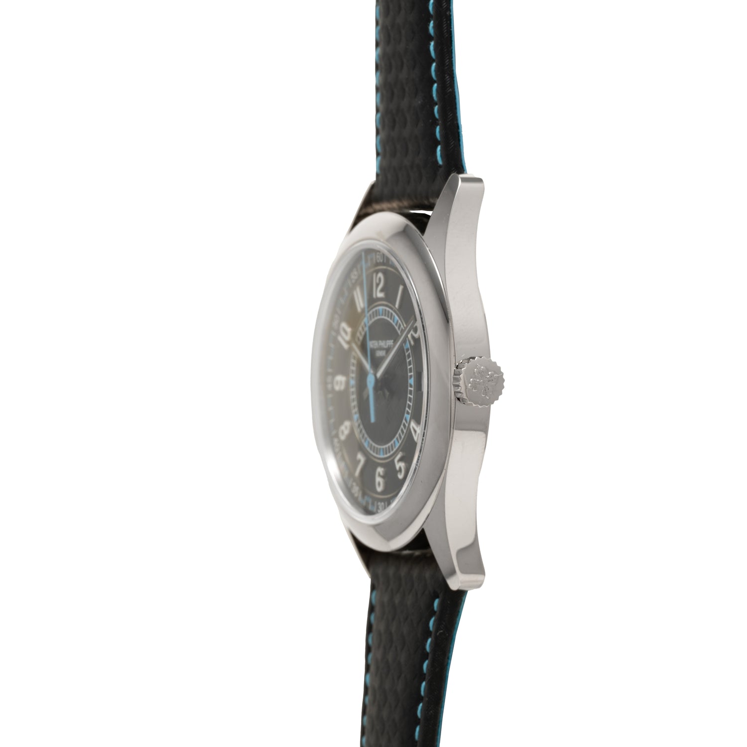Housed in a 40mm 18K white gold case, this piece features a polished bezel and case complemented by a sapphire crystal and a signed crown. The black luminous dial features a matching white gold handset and radially configured, luminous, white gold 'Arabic' indices. Straying away from the traditional dressier aesthetics of the Calatrava model, the Patek Philippe design team elected to add sportier design notes with its center dial adorned with a 'carbon' finish and a blue accented, checker-style, minute track.