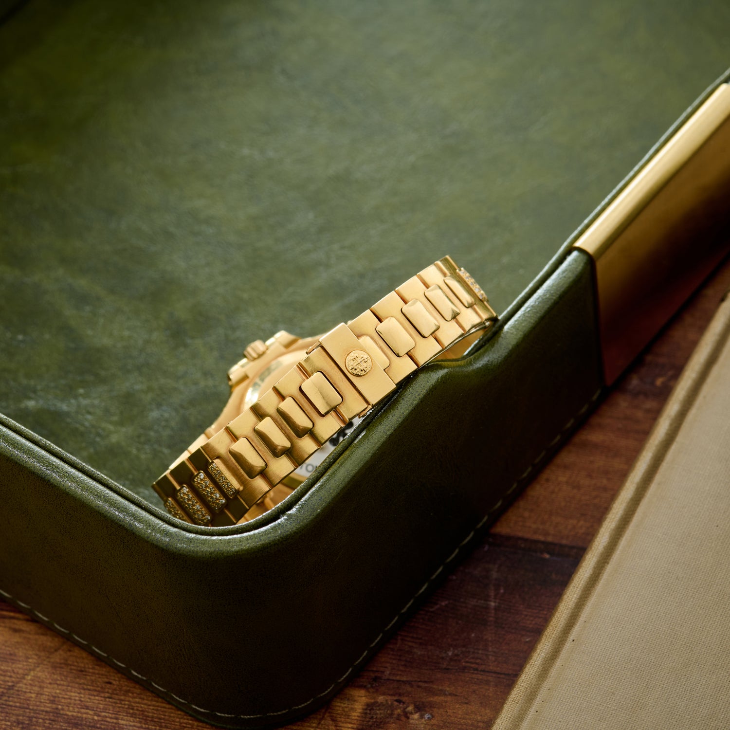 This midsize Nautilus, the Reference 3800/5J, carries that same DNA forward in a more versatile silhouette. Measuring 37mm and rendered here in 18k yellow gold, it's elevated even further by a diamond-set bezel and matching diamond-set bracelet links—glamorous, yes, but still unmistakably Nautilus. Inside beats the Patek Philippe Calibre 335 SC, an automatic movement celebrated for its precision, refinement, and thin profile. Whether it lands on the wrist of a client who loves jewelry-forward design or a fashion-first mindset, the 3800 wears with intention and attitude.