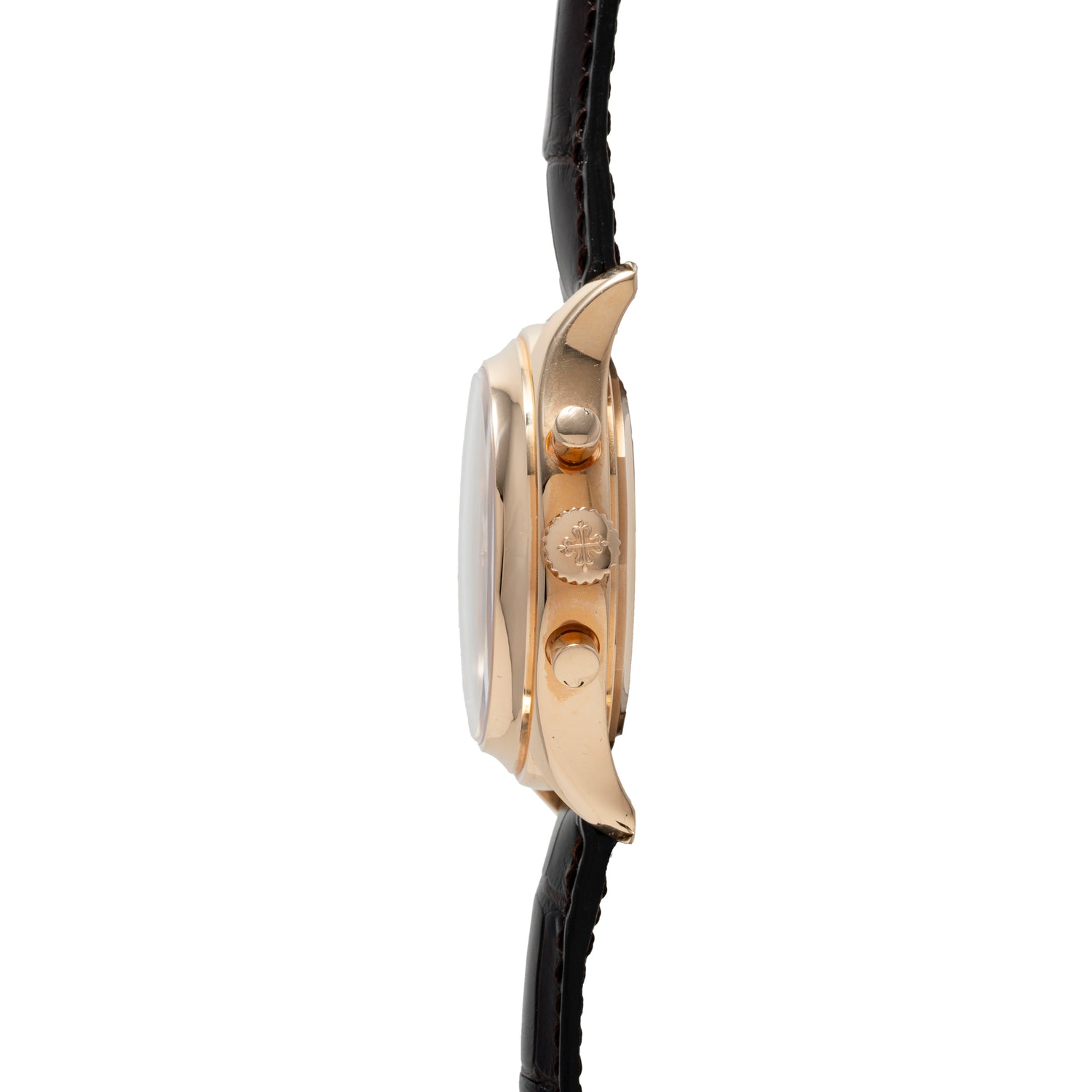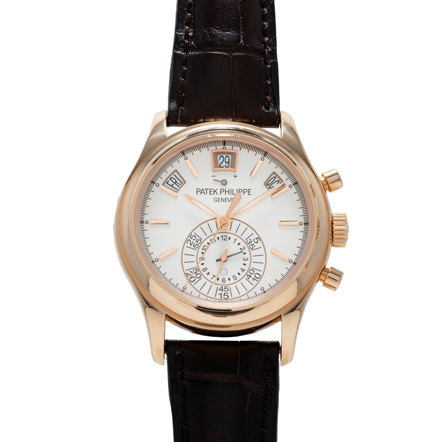 This piece transports us forward to the present day and is a handsome modern interpretation of the Patek Philippe Complications Annual Calendar, with an added bonus - a flyback chronograph function! Designated as a Reference 5960R-011, this lovely timepiece features a 40.5mm 18K rose gold case with sculpted, contoured lugs, a polished concave bezel, pump pushers and a signed crown.