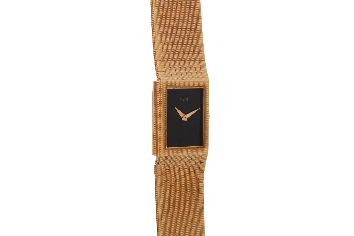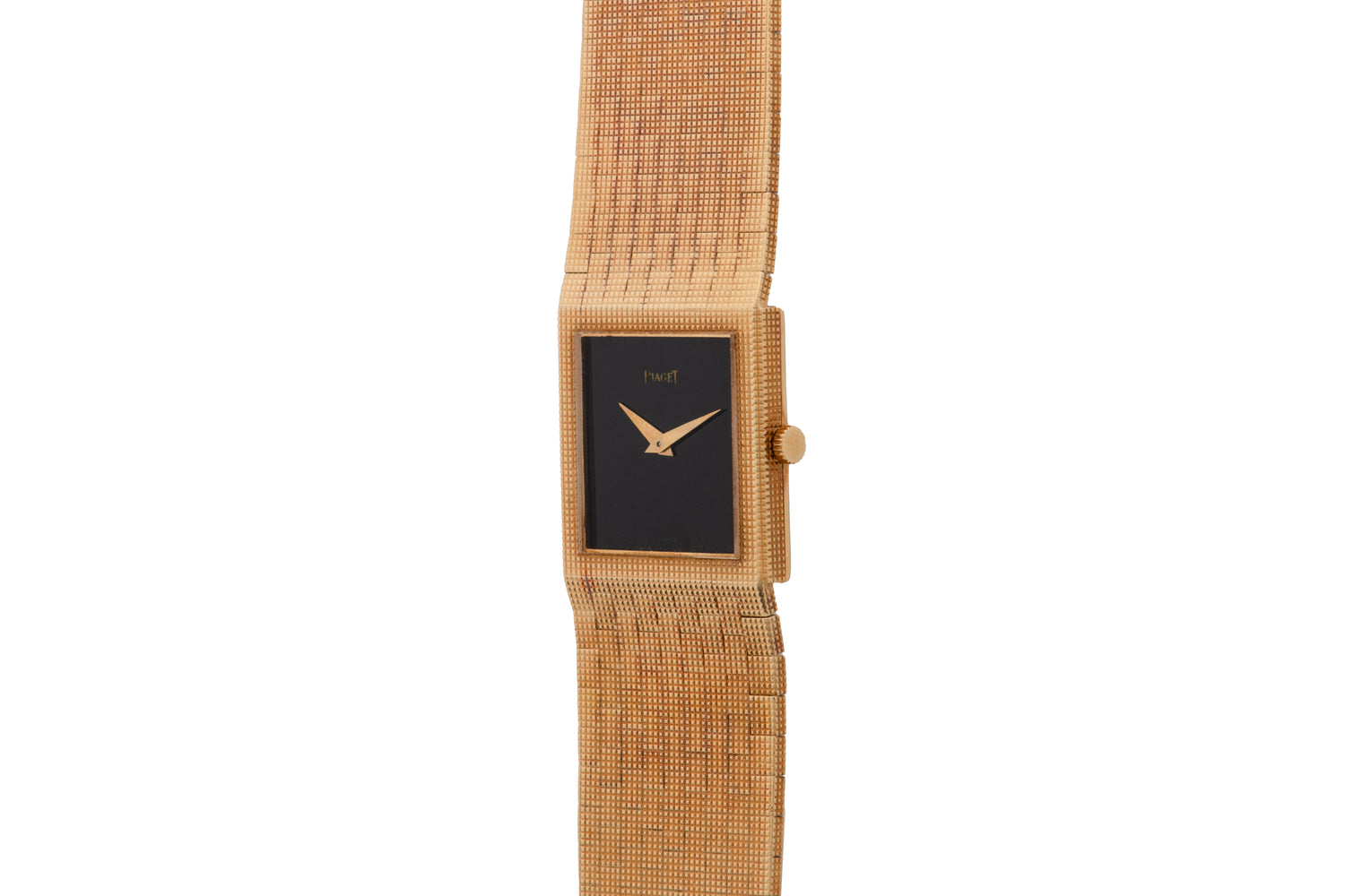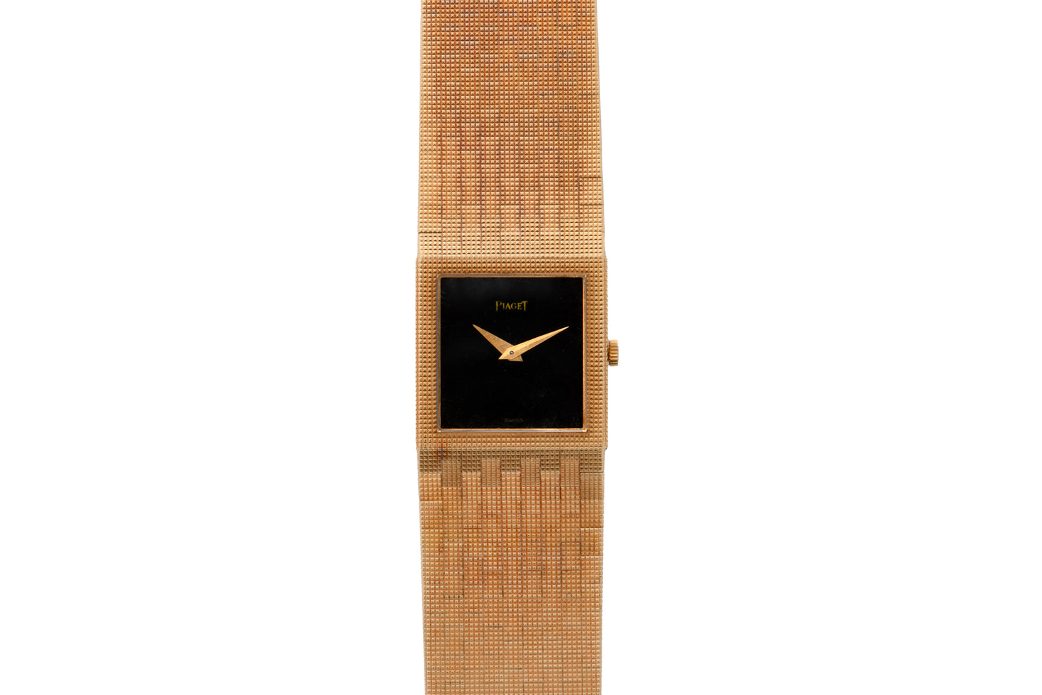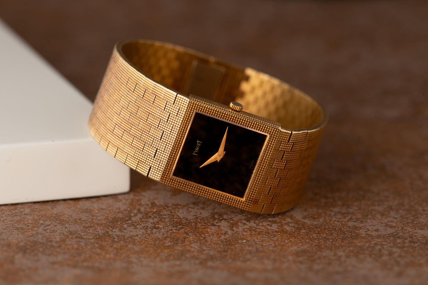 Housed in a 23mm 18K yellow gold case with hobnail texturing that seamlessly transitions into a fantastic integrated bracelet with a locking clasp with matching texturing throughout, this Reference 9131 C also features a striking Onyx dial with a 'dauphine' handset and Piaget's ultra thin Calibre 9P manual winding movement.