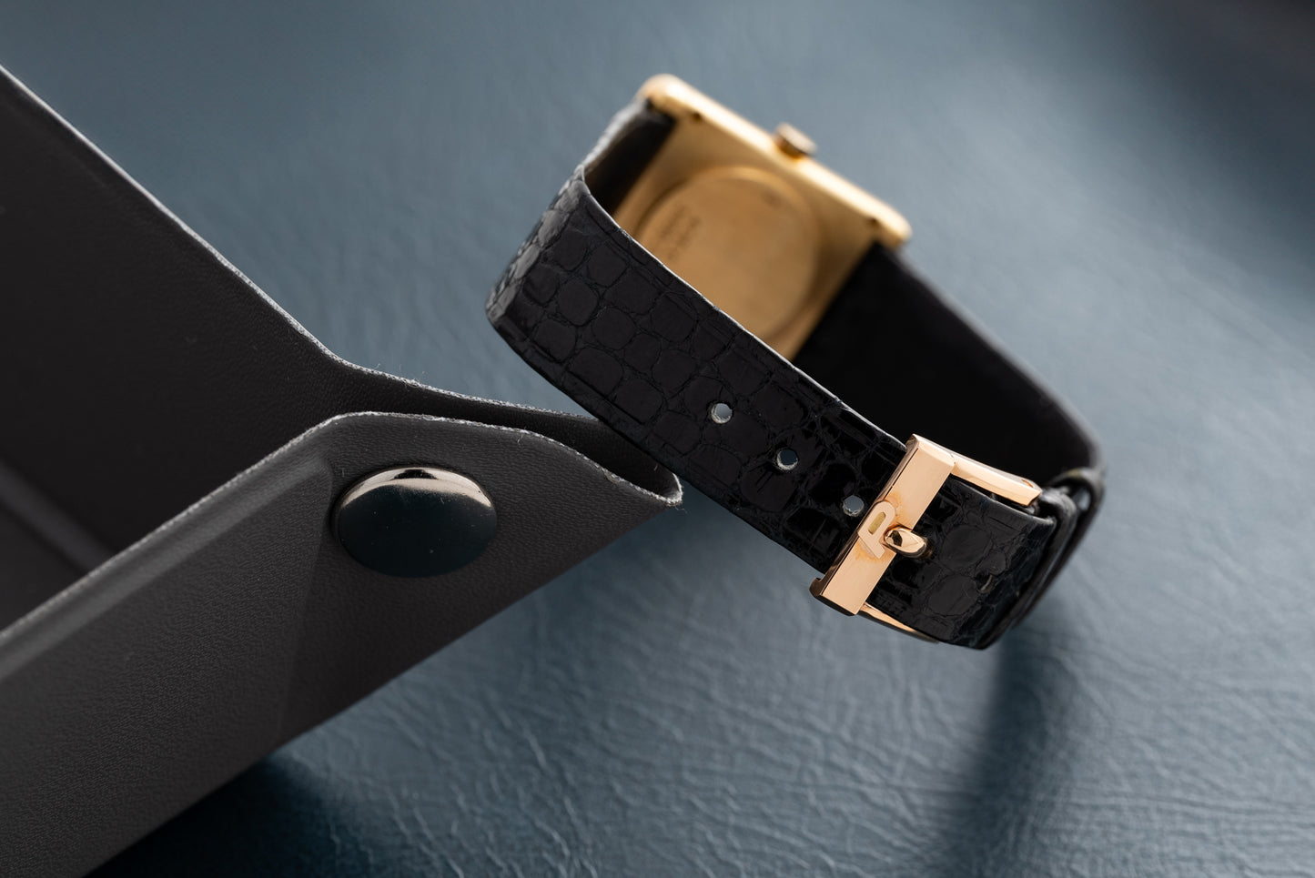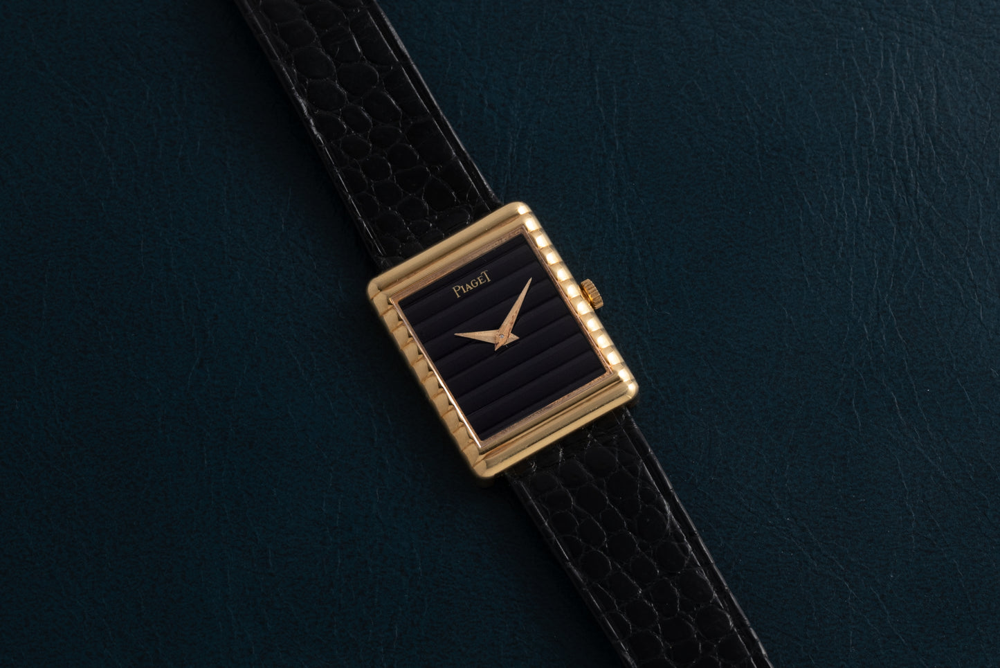 Housed in a 20mm, yellow gold 'ribbed'-finished rectangular case with 'hooded' lugs and a mineral crystal, this piece features a deep black Onyx stone dial with matching 'ribbed' finishing, a matching 'dauphine' handset, a manual winding movement within, and a black crocodile strap with a signed yellow gold pin buckle.