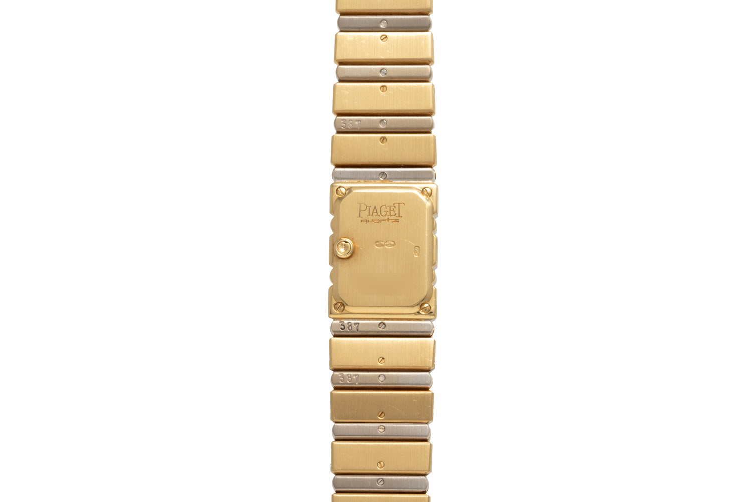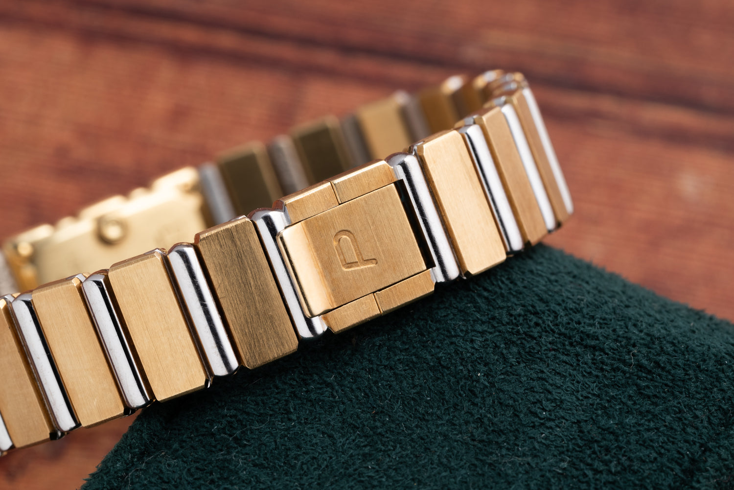 Housed in a 18mm x 14mm, 18k yellow gold and white gold case with a fantastic, integrated two tone bracelet with a signed clasp, this Polo features a brushed two-tone champagne dial with a matching 'dauphine' handset, an acrylic crystal, and an entirely ‘80s-appropriate quartz movement within. Notably, the pattern of the bracelet continues straight through the dial.