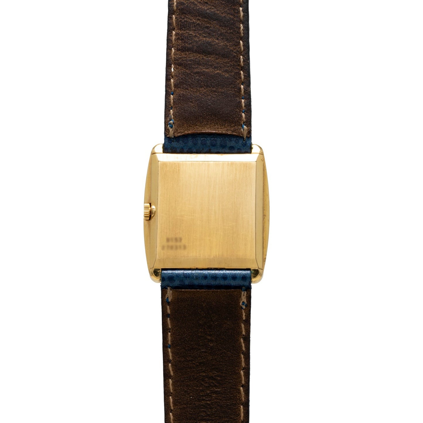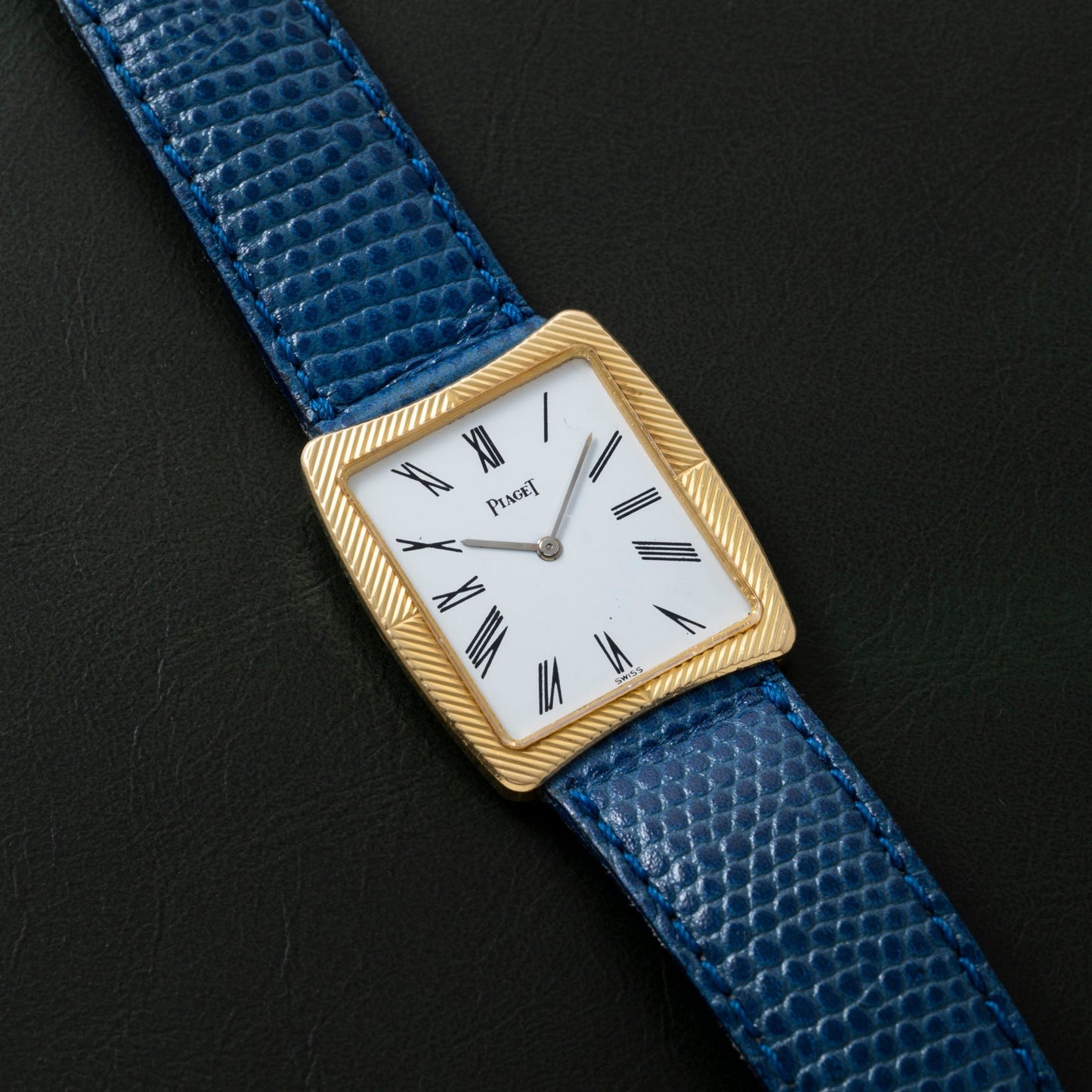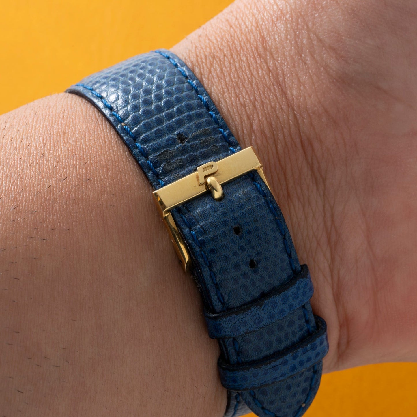 This particular Piaget, a Protocole Reference 9153, calls back to that era and features a 18k yellow gold case with engraving on the bezel, a mineral crystal and a hidden winding crown embedded in the right side of the case. The gloss white dial features printed ‘Roman’ indices, a matching ‘pencil’ handset and the signature stylized Piaget signature positioned at the dial’s center. It is fitted to a blue pebbled leather strap with matching 18k yellow gold signed logo pin buckle. Powered by a Calibre 9P manual-winding movement.