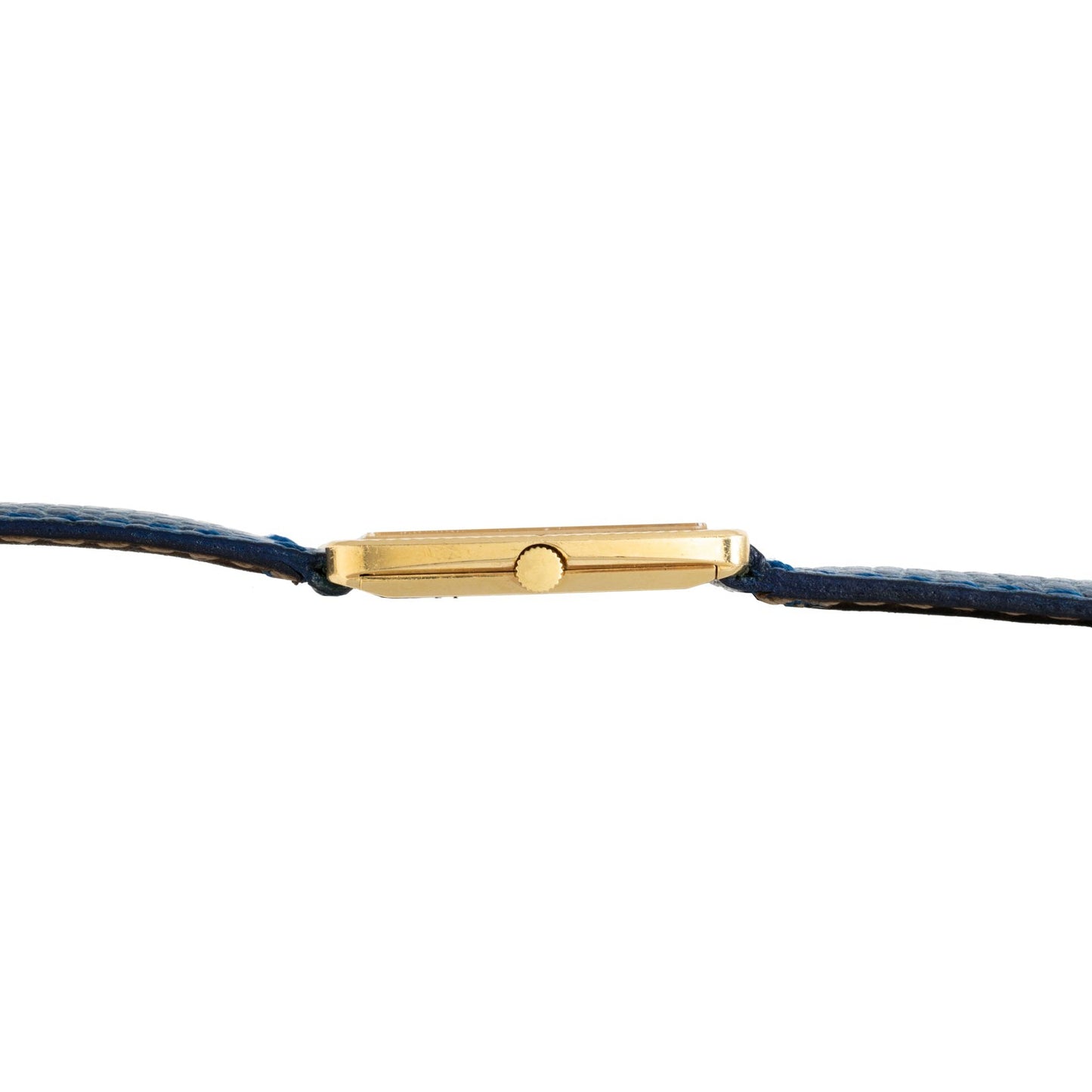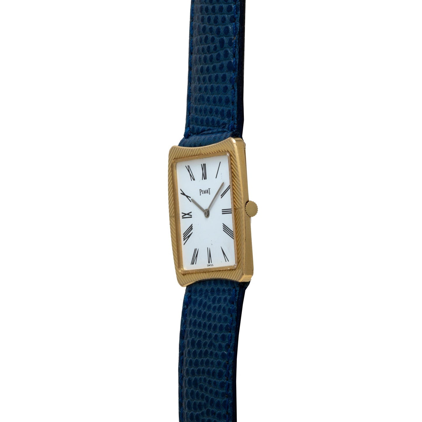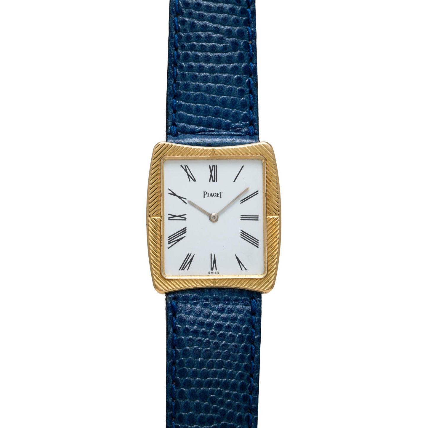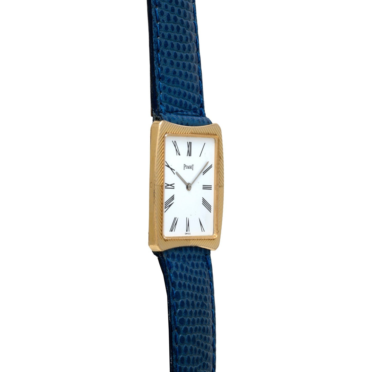 This particular Piaget, a Protocole Reference 9153, calls back to that era and features a 18k yellow gold case with engraving on the bezel, a mineral crystal and a hidden winding crown embedded in the right side of the case. The gloss white dial features printed ‘Roman’ indices, a matching ‘pencil’ handset and the signature stylized Piaget signature positioned at the dial’s center. It is fitted to a blue pebbled leather strap with matching 18k yellow gold signed logo pin buckle. Powered by a Calibre 9P manual-winding movement.