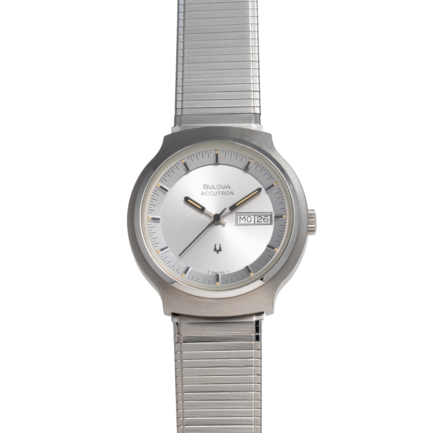 This particular Accutron is something a bit out of the ordinary. Intended for the ladies market, this piece has a lovely brushed silver dial with an integrated bracelet. It features a day date complication, and notably comes with its factory ephemera, including its original "Bulova Accutron for Women" box, and its original affixed hangtags.
