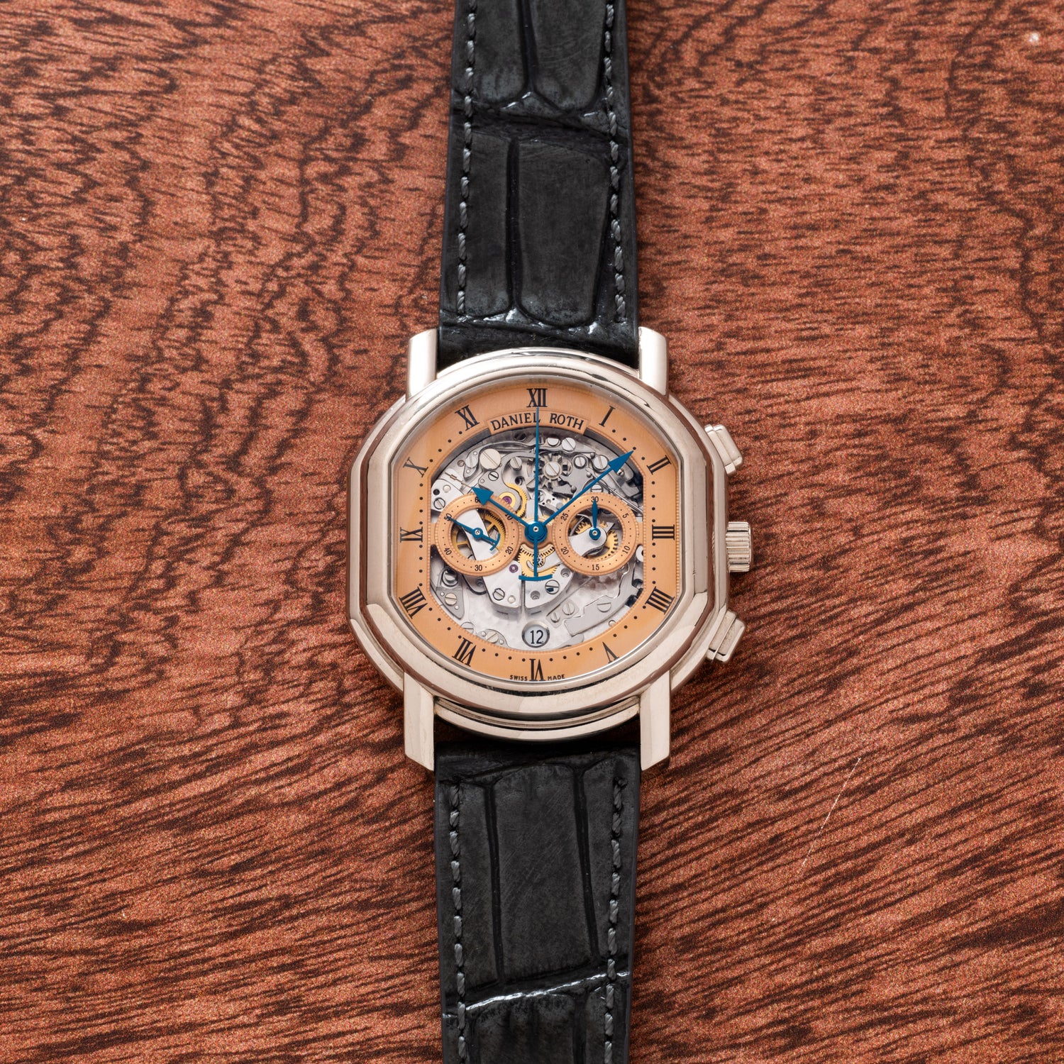 Powered by the automatic winding Calibre DR101 (base Calibre from Lemania), and accompanied by alligator leather strap with matching white gold pin buckle. Daniel Roth, a master watchmaker who honed his craft at both AP and Breguet, infused this timepiece with charm and delight - and the perfect balance of simple complication.