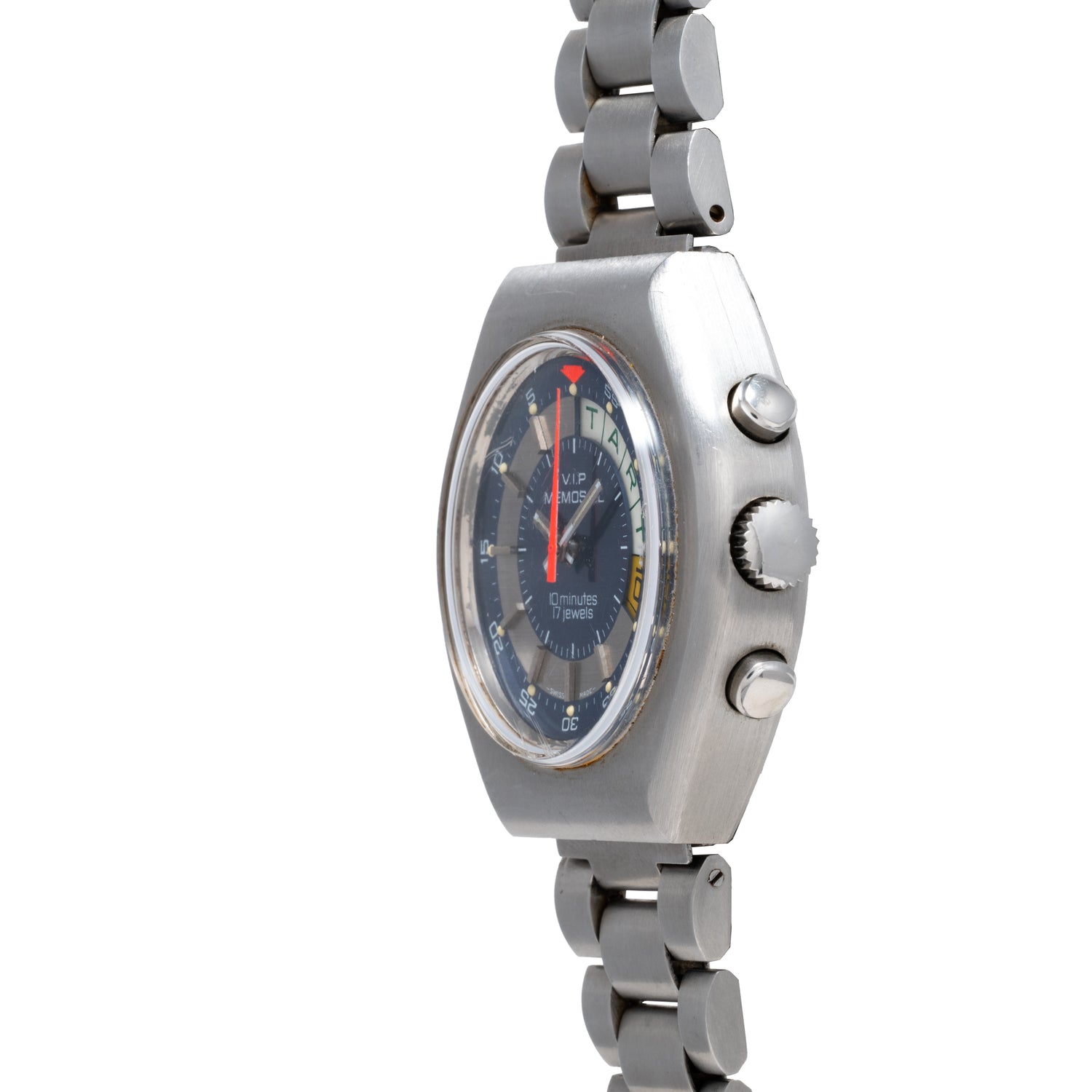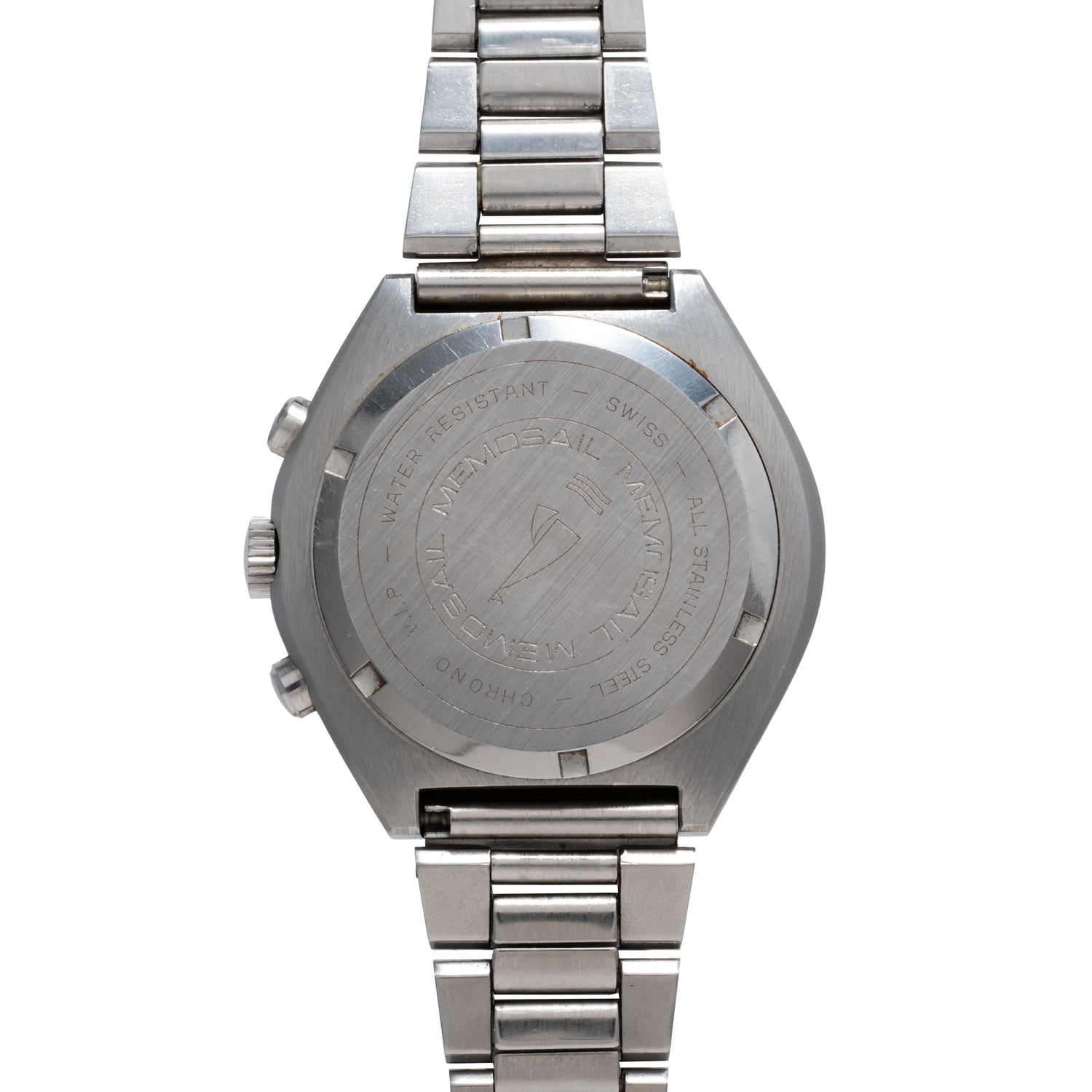 This watch, the Memosail, was the answer to the popular Felsa regatta timer movement found in watches retailed by Aquastar. It's powered by a modified, manually-wound Valjoux Calibre 7733, a popular base caliber found in many chronographs of the time. The particular variation contained in this watch, known as a Valjoux 7737, features a rotating disc viewed through a partially open dial that digitally counts down 10 minutes, reading “START” when the countdown is complete.
