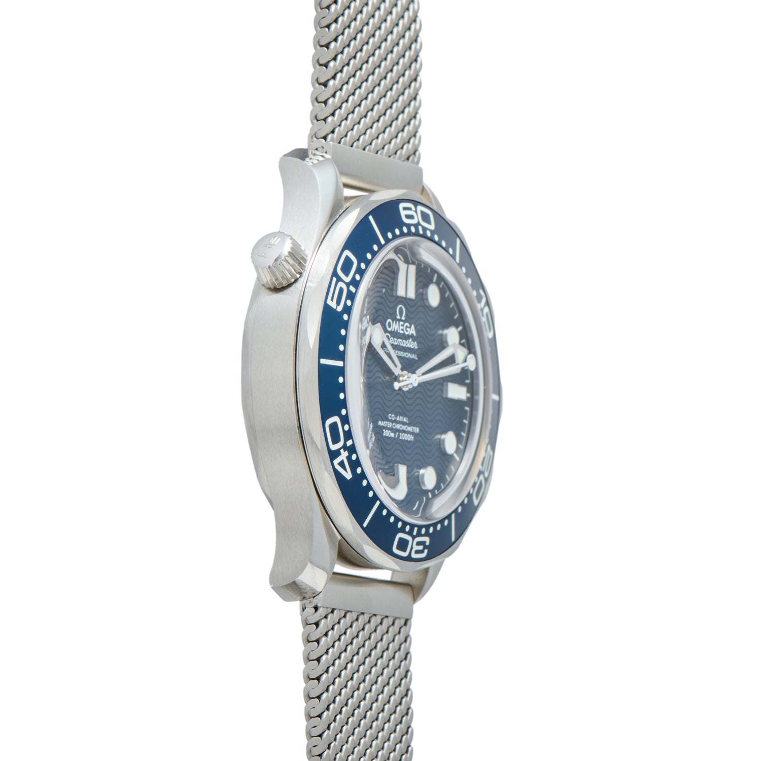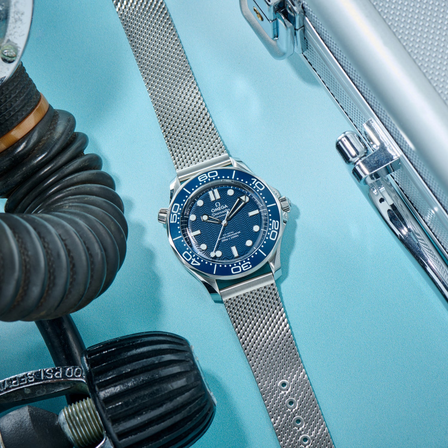 In 42mm in stainless steel, this piece is paired with a stainless steel mesh bracelet and packs 300 meters of water resistance. For the lover of James Bond or just an admirer of the Seamaster, this piece is a must!