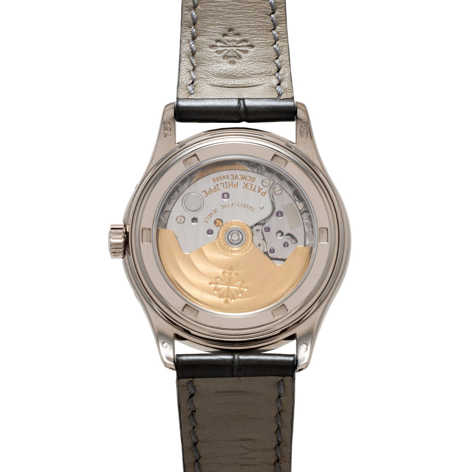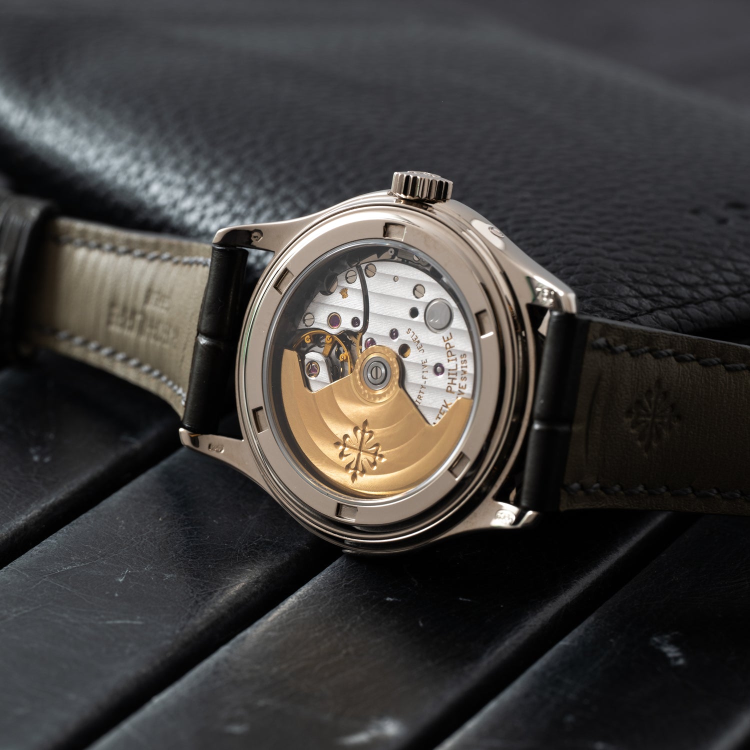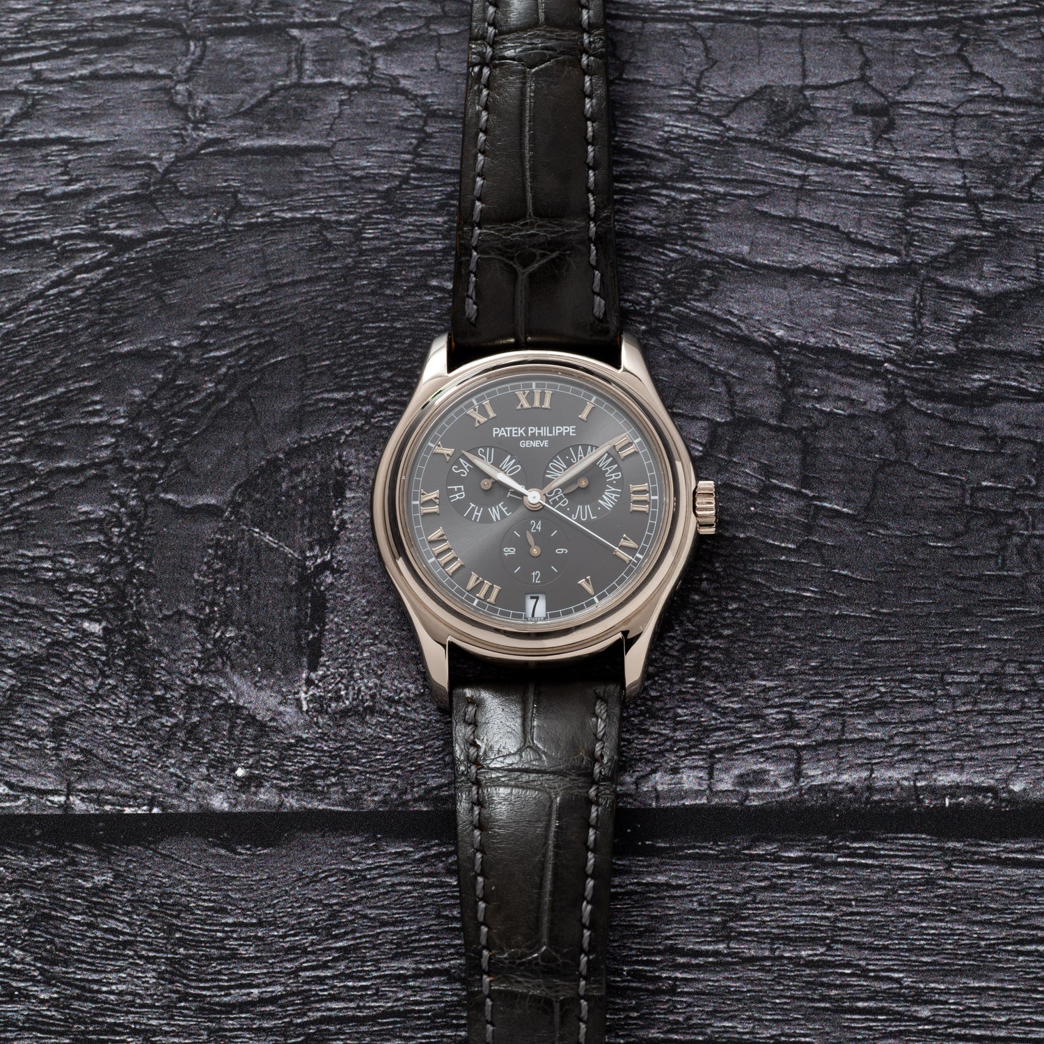This particular Reference 5035 is executed in 18K white gold. Measuring 37mm with a beautifully stepped bezel, a signed crown, and a sapphire crystal, it features a striking gray sunburst dial with a printed white chemin de fer minute track, applied ‘Roman’ indices, radial day and month indicators, a 24-hour indicator, and a date window above 6 o’clock. Finished with a luminous ‘feuille’ handset, it’s powered by the brilliant Patek Philippe Calibre 315, an automatic movement with a gold winding rotor that requires adjustment once per year in February.