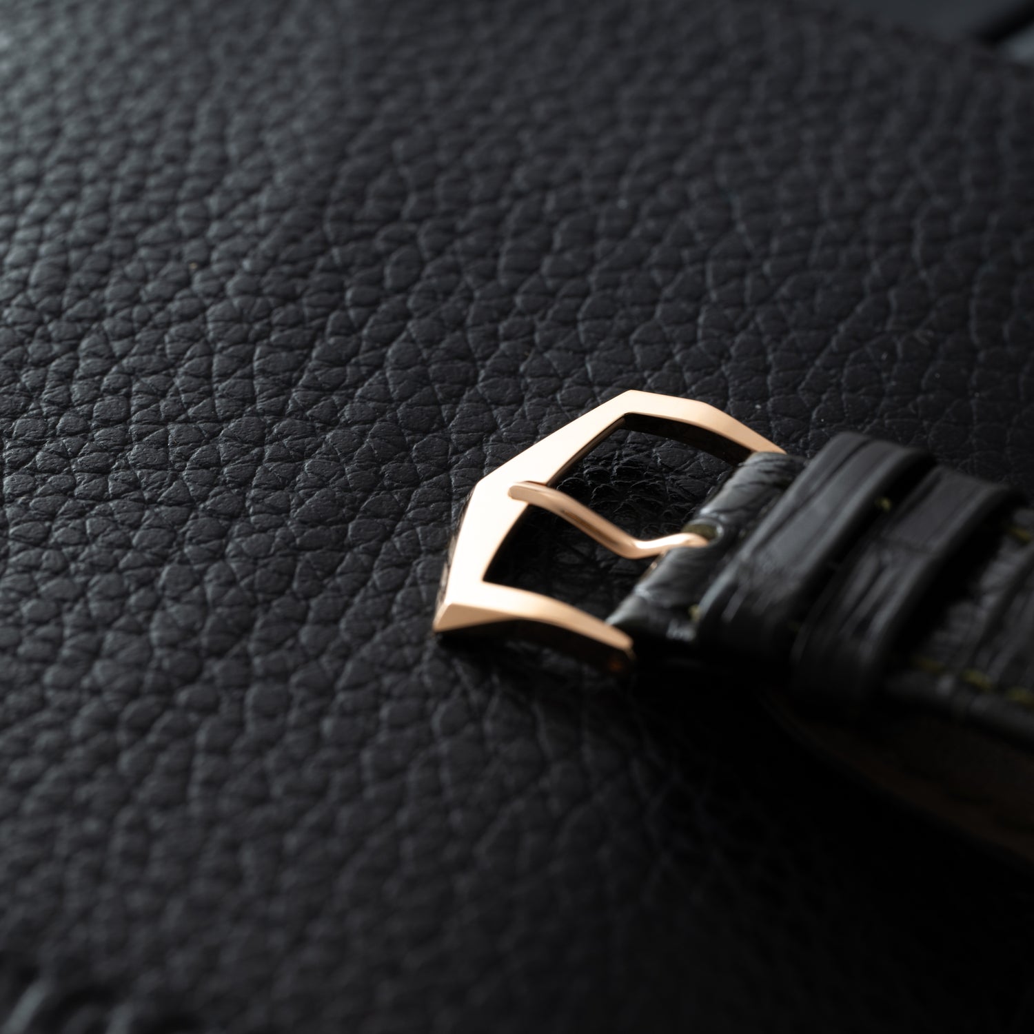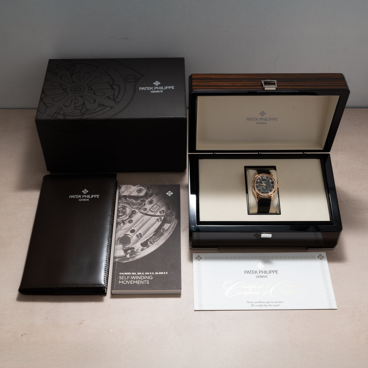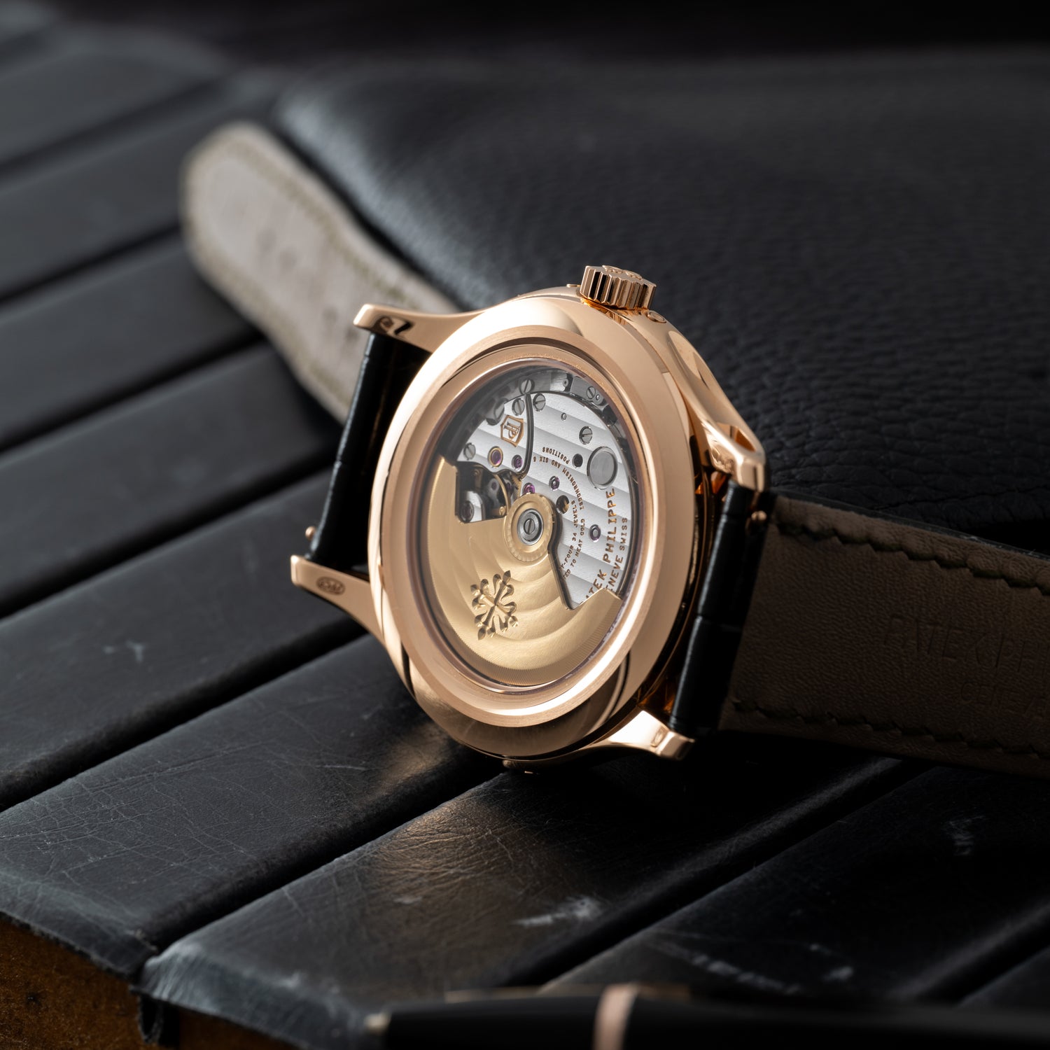 The back side features an exhibition back providing a window to admire the self-winding movement and its 21K gold winding rotor adorned with the hallmark Patek Philippe seal. It comes fitted to a signed alligator strap with a matching 18K rose gold pin buckle. This piece is also accompanied by its box set, leather folio, books, and Certificate of Origin.