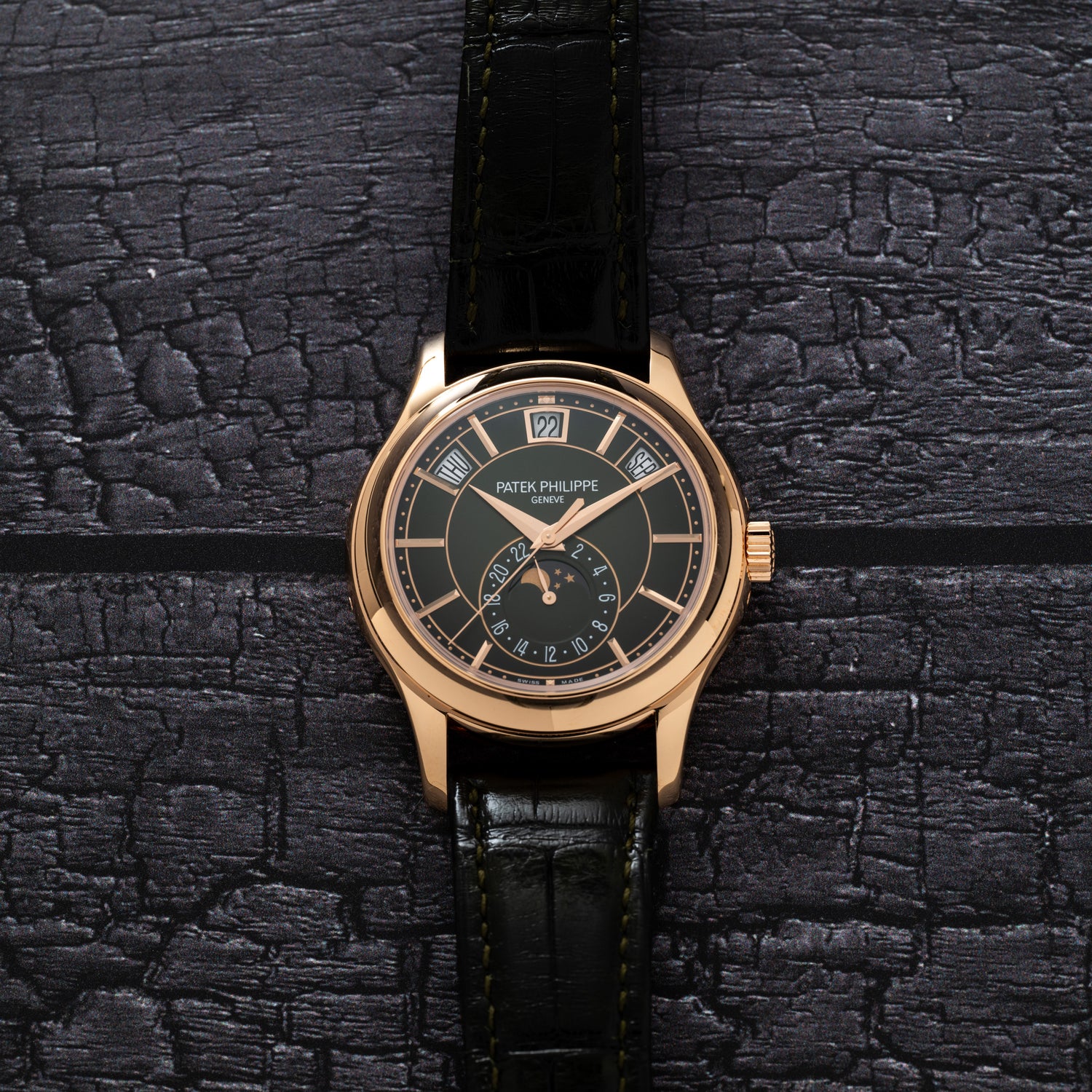 This piece transports us forward to the present day and is a handsome modern interpretation of the Patek Philippe Complications Annual Calendar. Designated as a Reference 5205R-011, this lovely timepiece features a 40mm 18K rose gold case with sculpted, hollowed lugs, a concave bezel, and polished finish.