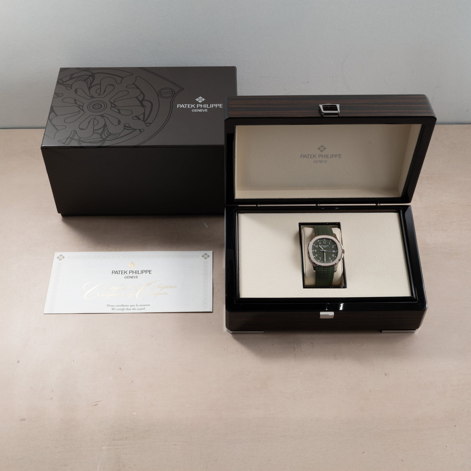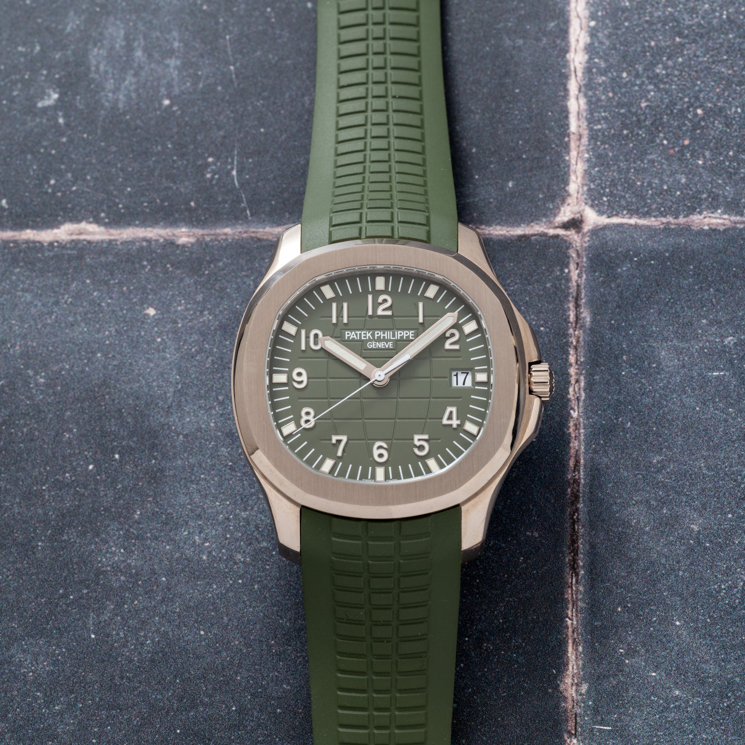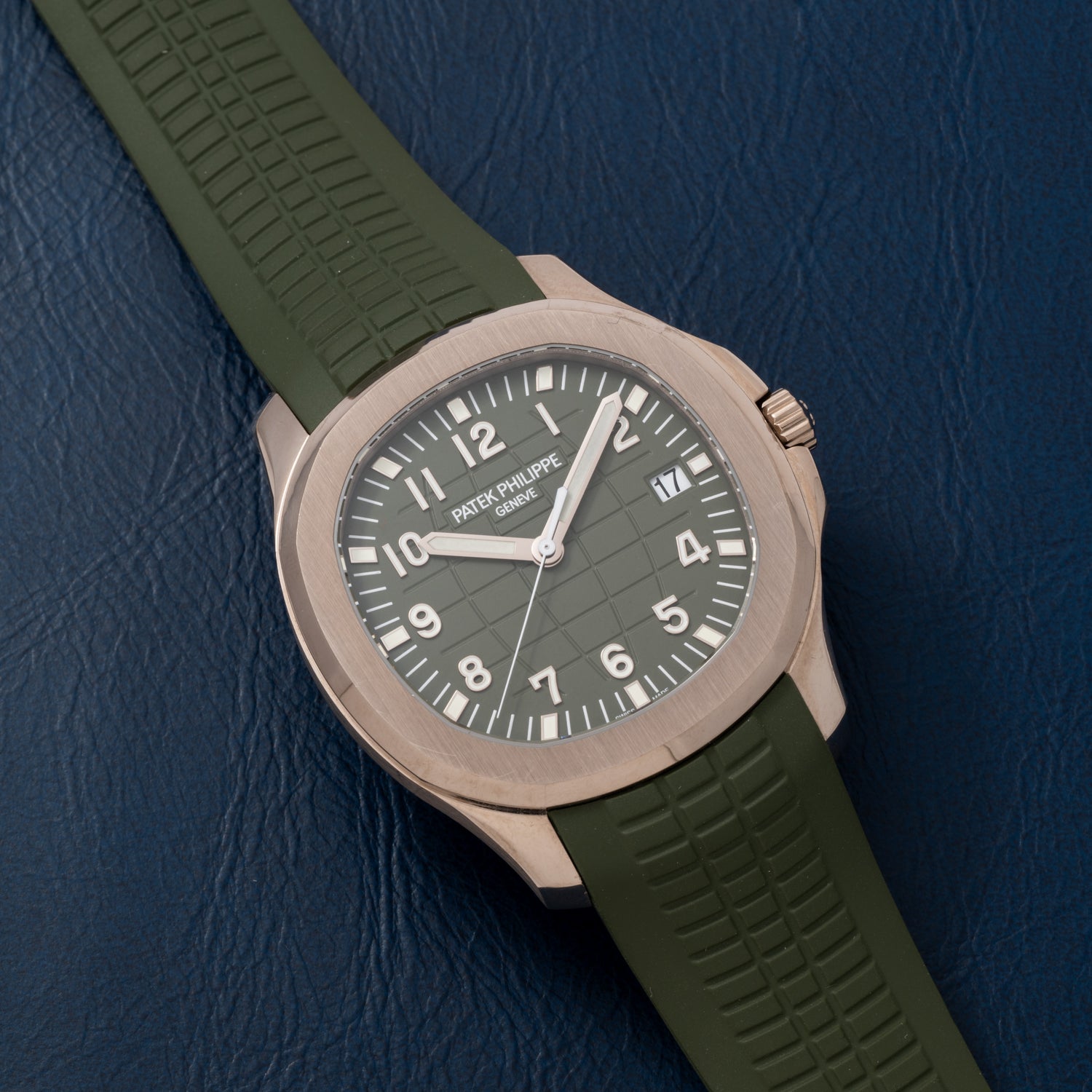 Featuring a khaki green dial with signature embossed texturing, it boasts a set of applied, luminous ‘Arabic’ indices, luminous 'block; markers, a luminous matching handset, and a date window at 3 o’clock. The exhibition caseback, meanwhile, gives way to Patek’s self-winding Calibre 26-330 S C, which offers 48 hours of power reserve and a handy quick-set date mechanism.