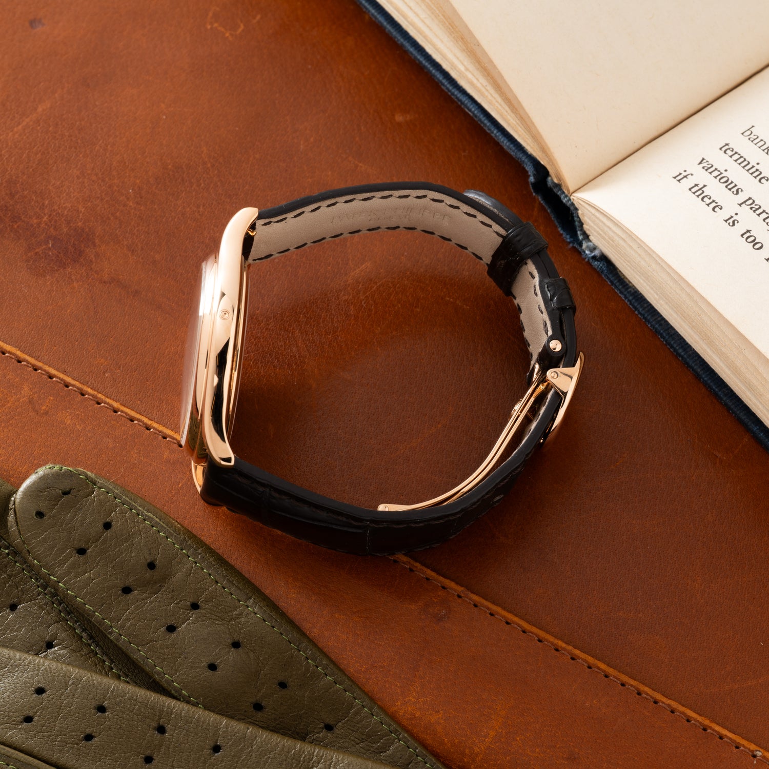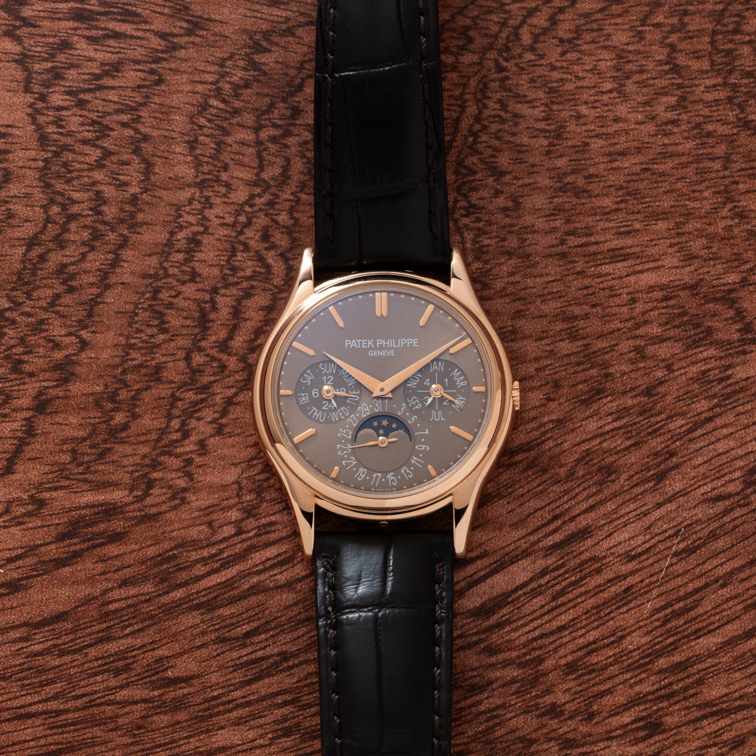 Perpetual calendars are Patek Philippe’s speciality — it’s been making them in series since the 1940s. This particular quantieme perpetual, a Reference 5140R-001, is a true beauty. Housed in a 37mm rose gold case, it features a sapphire crystal, sapphire exhibition caseback, rose gold signed crown, and a beautiful, brown 'sunburst' dial with applied indices and a matching 'dauphine' handset. Powered by the Cal. 240 Q automatic movement with micro-rotor, it’s absolutely a piece of horological art — the type of timepiece that gets passed down through the generations.