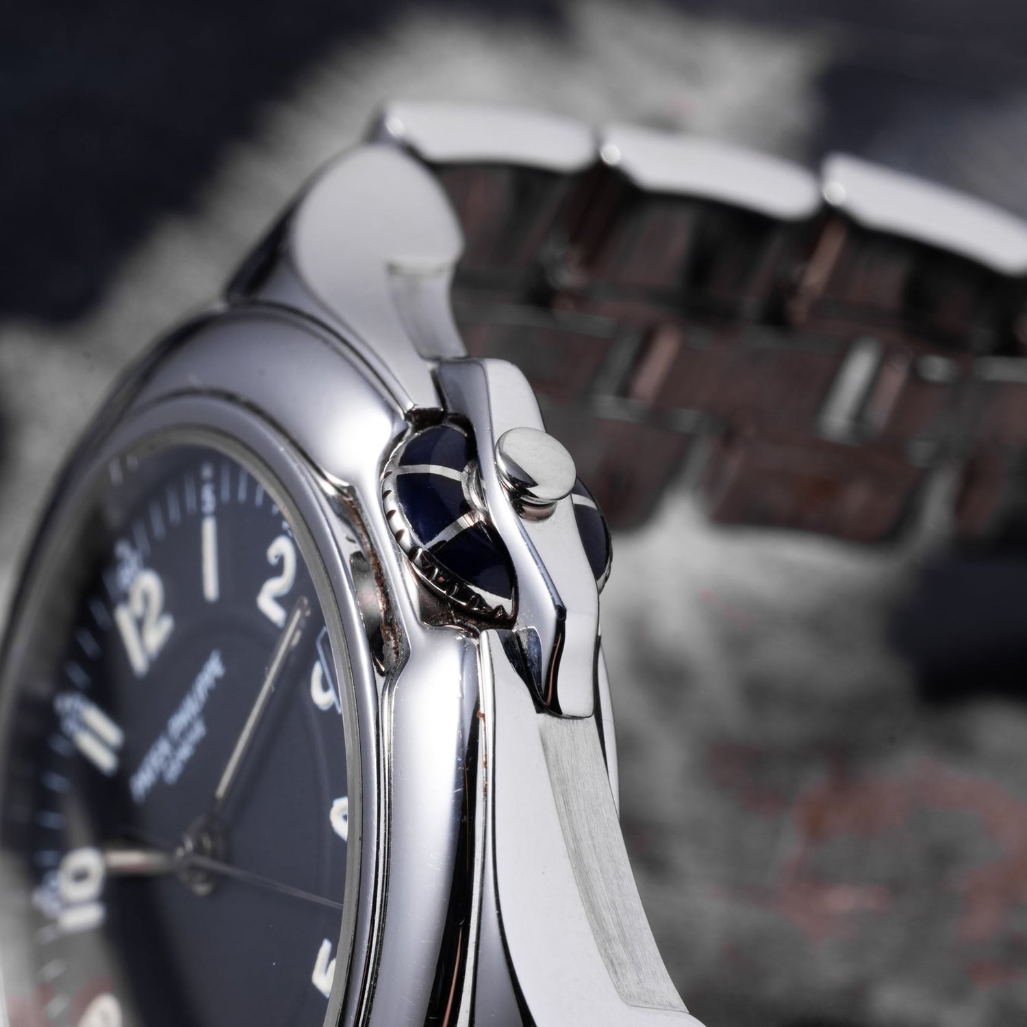 This particular Sculpture from the early 2000s features a 38mm stainless steel case with geometric lugs, a sapphire crystal, a protected, sapphire cabochon crown, a polished step bezel, and a black dial with a ‘baton’ handset, ‘Roman’ numeral and dot indices, an outer minute track in white, and a date window at 3 o’clock. Powered by the automatic Patek Philippe 315 SC movement, it’s finished with a stainless steel sculpture bracelet with a hidden deployant clasp.